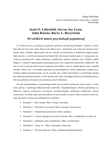 Kinga Stefańska Wyższa Szkoła Ekonomii i Innowacji w Lublinie Psychologia Scott O. Lilienfeld, Steven Jay Lynn, John Ruscio, Barry L. Beyerstein 50 wielkich mitów psychologii popularnej 50 wielkich mitów psychologii popularnej autorstwa czterech psychologów: Scotta O. Lilienfeld, Stevena Jay Lynn, Johna Ruscio oraz Barry’ego L. Beyerstein, jest ciekawym zbiorem przekonań, które znalazły zaprzeczenie lub nie znalazły potwierdzenia w badaniach empirycznych. Sami autorzy w chwili powstawania tej książki byli aktywnymi naukowcami, w swojej pracy zawodowej przekazywali wiedzę młodzieży, publikowali zarówno artykuły, jak i książki, pełnili funkcje w różnych organizacjach psychologicznych oraz zajmowali stanowiska redaktorów. Sądzę, że jest to pozycja, która nie jest napisana przez laików, oraz że została opracowana w sposób rzetelny. Warto, aby z tą książką zapoznali się psychologowie, którzy praktykują, studenci psychologii dopiero przygotowujący się do zawodu, jak i ludzie niezwiązani z psychologią. Książa jest napisana językiem prostym, w taki sposób, aby osoby nieznające fachowej terminologii potrafiły bez problemu zrozumieć sens przekazywanych informacji. Nie jest niespodzianką, że psychologia dzieli się na działy tematyczne, które razem, z wielu stron, patrzą i wyjaśniają funkcjonowanie człowieka. Najpopularniejsze obszary psychologii to: kliniczna, sądowa, poznawcza, rozwojowa, neuropsychologia, społeczna, osobowości, emocji i motywacji. Te działy mają odzwierciedlenie w treści książki, można to łatwo zaobserwować czytając spis treści. Lektura jest podzielona na rozdziały: Rozdział 1 – Moc mózgu. Mity o mózgu i percepcji Rozdział 2 – Od kołyski aż po grób. Mity o rozwoju i starzeniu się Rozdział 3 – Wspominanie przeszłości. Mity o pamięci Rozdział 4 – Uczenie starego psa nowych sztuczek. Mity o inteligencji i uczeniu się Rozdział 5 – Odmienne stany świadomości. Mity o świadomości Rozdział 6 – Czuję, że… Mity o emocjach i motywacji Rozdział 7 – Zwierzę społeczne. Mity o relacjach interpersonalnych Kinga Stefańska Scott O. Lilienfeld, Steven Jay Lynn, John Ruscio, Barry L. Beyerstein... Rozdział 8 – Poznaj samego siebie. Mity o osobowości Rozdział 9 – Smutny, szalony i zły. Mity o chorobach psychicznych Rozdział 10 – Psychoza na sali sądowej. Mity o psychologii i prawie Rozdział 11 – Męczenie i leczenie. Mity o leczeniu psychologicznym W rozdziałach znajduje się po kilka wyczerpująco omówionych mitów, pod koniec każdego jest spis przekonań, które nie zostały opisane w tej pozycji, a na które warto zwrócić uwagę. Rozdziały i podrozdziały nie tworzą razem całej historii, dlatego można sięgnąć po pojedyncze opracowanie mitu i w pełni go zrozumieć. W czasie przedstawiania mitu brane są pod uwagę badania empiryczne, ich mocne oraz słabe strony, możliwe przyczyny takich przekonań, czynniki podtrzymujące dane wierzenie i konsekwencje z tego płynące. Ciekawie napisana książka, dotycząca codziennego życia każdego z nas, przekonań, które niejednokrotnie uważało się za oczywiste i nie do podważenia sprawia, że rozdziały czyta się jednym tchem. Przykłady z życia wzięte sprawiają, iż dane zagadnienie lepiej się zapamiętuje. Bibliografia: Lilienfeld, S. O., Lynn, S. J., Ruscio, J., Beyerstein, B., L. (2011). 50 wielkich mitów psychologii popularnej. Wydawnictwo CiS, Warszawa. 61