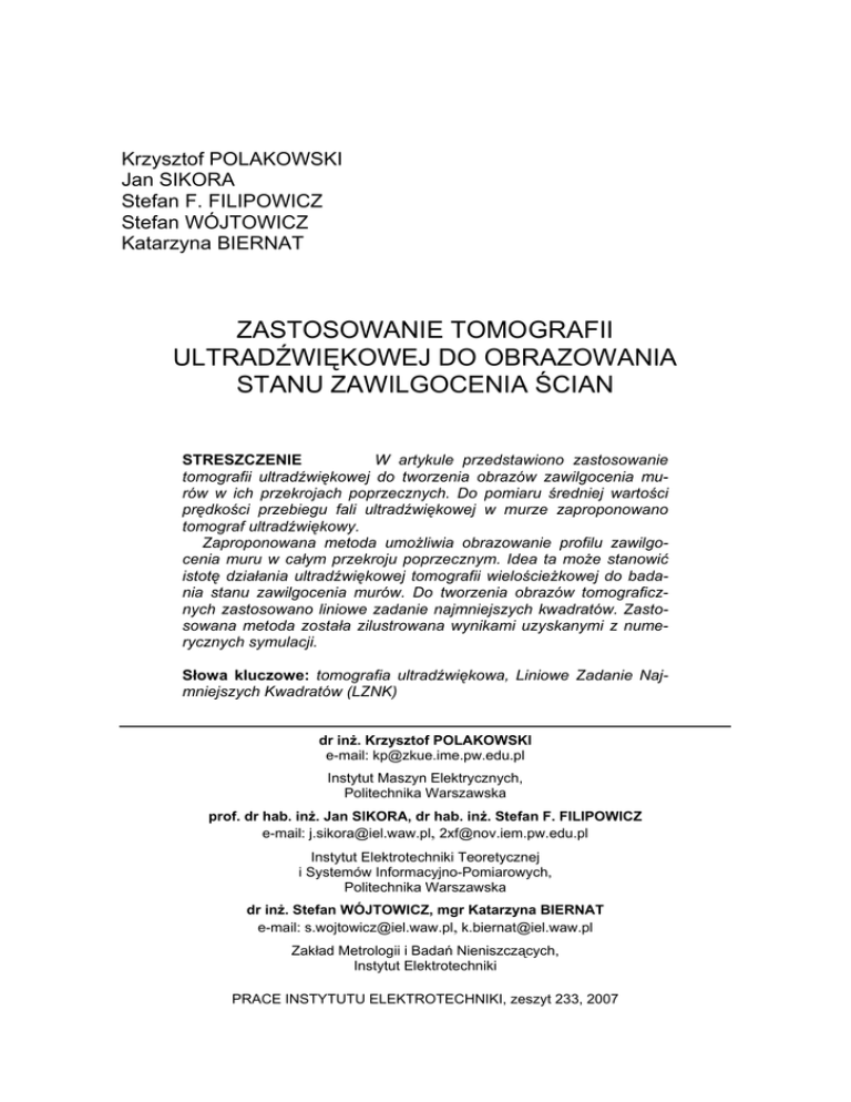 Krzysztof POLAKOWSKI Jan SIKORA Stefan F. FILIPOWICZ Stefan WÓJTOWICZ Katarzyna BIERNAT ZASTOSOWANIE TOMOGRAFII ULTRADŹWIĘKOWEJ DO OBRAZOWANIA STANU ZAWILGOCENIA ŚCIAN STRESZCZENIE W artykule przedstawiono zastosowanie tomografii ultradźwiękowej do tworzenia obrazów zawilgocenia murów w ich przekrojach poprzecznych. Do pomiaru średniej wartości prędkości przebiegu fali ultradźwiękowej w murze zaproponowano tomograf ultradźwiękowy. Zaproponowana metoda umożliwia obrazowanie profilu zawilgocenia muru w całym przekroju poprzecznym. Idea ta może stanowić istotę działania ultradźwiękowej tomografii wielościeżkowej do badania stanu zawilgocenia murów. Do tworzenia obrazów tomograficznych zastosowano liniowe zadanie najmniejszych kwadratów. Zastosowana metoda została zilustrowana wynikami uzyskanymi z numerycznych symulacji. Słowa kluczowe: tomografia ultradźwiękowa, Liniowe Zadanie Najmniejszych Kwadratów (LZNK) dr inż. Krzysztof POLAKOWSKI e-mail: [email protected] Instytut Maszyn Elektrycznych, Politechnika Warszawska prof. dr hab. inż. Jan SIKORA, dr hab. inż. Stefan F. FILIPOWICZ e-mail: [email protected], [email protected] Instytut Elektrotechniki Teoretycznej i Systemów Informacyjno-Pomiarowych, Politechnika Warszawska dr inż. Stefan WÓJTOWICZ, mgr Katarzyna BIERNAT e-mail: [email protected], [email protected] Zakład Metrologii i Badań Nieniszczących, Instytut Elektrotechniki #12# PRACE INSTYTUTU ELEKTROTECHNIKI, zeszyt 233, 2007 110 K. Polakowski, J. Sikora, S.F. Filipowicz, S. Wójtowicz, K. Biernat 1. WSTĘP Brak izolacji poziomej w budynkach niepodpiwniczonych oraz brak izolacji, zarówno poziomej, jak i pionowej w budynkach podpiwniczonych powoduje zawilgocenie murów, najczęściej do około 2 metrów nad poziom gruntu (maksymalnie do 6 metrów). a) b) Rys. 1. Zawilgocenie ścian budynków [1]: a) wizualizacja procesu zawilgocenia ściany, b) uszkodzenia ściany spowodowane zawilgoceniem Metody optymalnego projektowania kształtu urządzeń. Prawidłowa ocena zaistniałej sytuacji ma istotny wpływ na przeprowadzenie prac eliminujących niekorzystne procesy powodujące degradację murów budynków. Niestety brak jest w miarę prostych metod nieinwazyjnych umożliwiających taką ocenę. Jednym z bardziej obiecujących nieniszczących sposobów badania jakości murów może być wykorzystanie ultradźwięków do wykrywania tego typu defektów w całej ich objętości. Badany obiekt oddziałuje na falę ultradźwiękową, ograniczając jej prędkość rozchodzenia się oraz absorpcję i rozpraszanie (tłumienie fali). Na podsta- Zastosowanie tomografii ultradźwiękowej do obrazowania stanu … 111 wie zarejestrowanych sygnałów otrzymuje się informację o własnościach lepko– sprężystych oraz niejednorodnościach ośrodka. Ultradźwiękowa defektoskopia obejmować może zarówno makroniejednorodności występujące w murach w postaci nieciągłości typu pęknięć, rozwarstwień, pęcherzy lub obecności ciał obcych, jak i mikroniejednorodności, czyli mikroskopowych odchyleń od jednorodnej struktury takich jak odchylenia od wymaganych własności materiałów powodowanych na przykład zawilgoceniem [15]. 2. PROTOKÓŁ POMIAROWY Do badań przyjęto przekrój poprzeczny muru o wymiarach 2 x 0.5 m, na którym początkowo umieszczono równomiernie po 8 nadajników i odbiorników (rys. 2). a) b) c) Rys. 2. Badany obszar: a) widok aksonometryczny b) obszar pomiarowy c) promienie główne (linie grubsze) między nadajnikiem N1 i wszystkimi odbiornikami O1–O8 oraz promienie pomocnicze uwzględniane w zagęszczaniu obszaru obliczeń. 112 K. Polakowski, J. Sikora, S.F. Filipowicz, S. Wójtowicz, K. Biernat W celu poprawy dokładności obliczeń zwiększono do 16 liczbę nadajników i 16 odbiorników oraz zmieniono ich rozmieszczenie tak, aby objąć obliczeniami poziom o zerowej wysokości. Do eksperymentu przyjęto istnienie w murze obszaru zawilgocenia w postaci ustawionego niesymetrycznie względem ścian obszaru prostokątnego (obszar bardziej suchy wewnątrz i bardziej zawilgocony na zewnątrz budynku), jak pokazano to na rys. 3. Zwiększono również rozdzielczość obszaru pomiarowego do 976 pikseli (rys. 4). Ponieważ powstał niedookreślony układ równań, do dalszych obliczeń zwiększono liczbę promieni do 1216 generując promienie pomocnicze, jak pokazano to na rys. 2c. 3. ZAGADNIENIE ODWROTNE I METODA JEGO ROZWIĄZANIA W przedstawionym przypadku do konstrukcji obrazu zastosowano algorytmy z grupy metod algebraicznych, bazujących na aproksymacji funkcji przez szeregi o skończonej długości (ang. finite series) [5]. Obraz konstruowany jest przy pomocy algorytmu dyskretyzującego badany obszar do postaci kwadratowych komórek o długości boku l, których środki geometryczne traktowane są jako piksele w odtwarzanym obrazie. Przyjęcie takiego algorytmu uzasadnione jest następującymi względami: 1. Ultradźwięki rozchodzą się po liniach prostych, a więc nie istnieje konieczność stosowania takich uproszczeń, jak w tomografii impedancyjnej lub pojemnościowej. 2. Proponowana metoda umożliwia obrazowanie badanych wielkości w czasie rzeczywistym i jest stosunkowo prosta [9]. 3. Dokładność w przypadku obrazowania profilu rozkładu prędkości nie jest sprawą krytyczną [12]. 4. Algorytm może być szeroko stosowany niezależnie od badanej geometrii i rodzaju danych. Odtworzenie profilu rozkładu prędkości w płaszczyźnie odbiorników oznacza wyznaczenie estymat skończonego zbioru nieznanych wartości prędkości, które możemy określić jako f(x, y). Na podstawie pomiarów czasów przebiegu impulsów ultradźwiękowych możemy uzyskać scałkowane wartości prędkości na drogach i – tych ścieżek pomiarowych (zwanych promieniami) między nadajnikami a odbiornikami, które mogą być, zgodnie z zaproponowaną przez Kaczmarza [3] lub Radona [5] metodą tworzenia rzutu (lub projekcji), określane rzutami