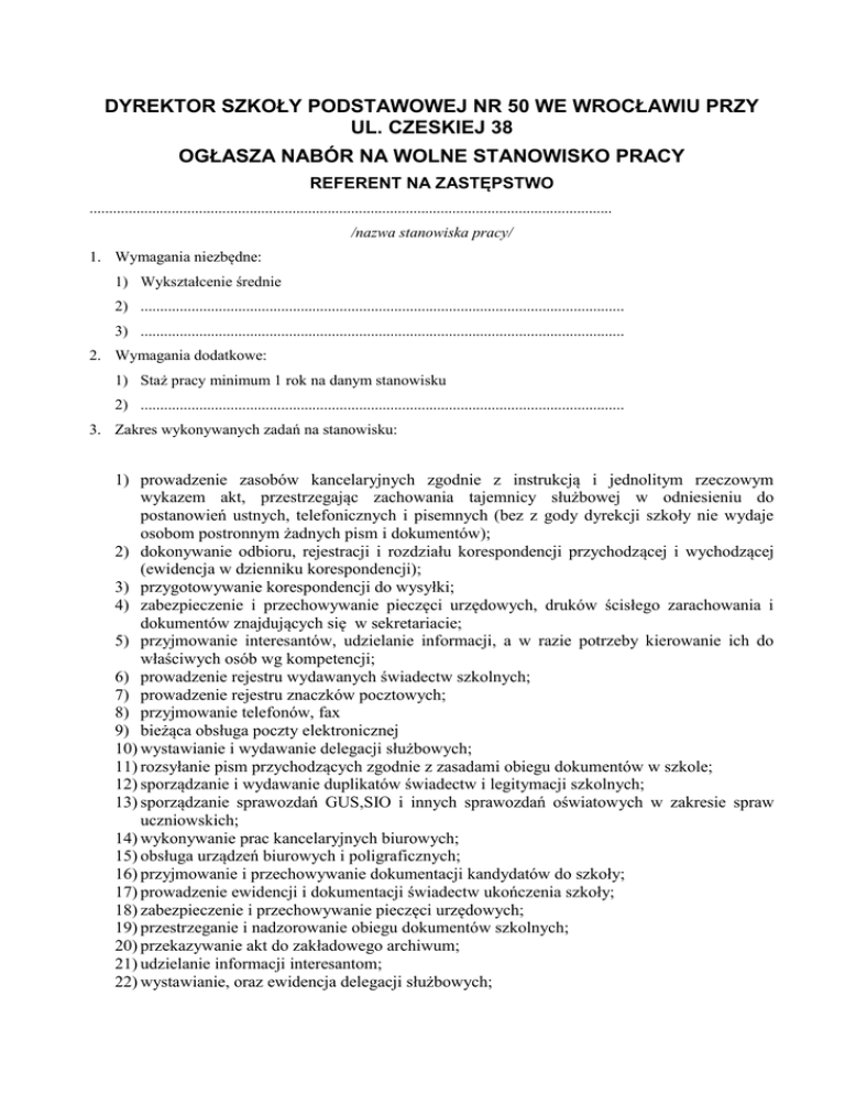 DYREKTOR SZKOŁY PODSTAWOWEJ NR 50 WE WROCŁAWIU PRZY UL. CZESKIEJ 38 OGŁASZA NABÓR NA WOLNE STANOWISKO PRACY REFERENT NA ZASTĘPSTWO ...................................................................................................................................... /nazwa stanowiska pracy/ 1. Wymagania niezbędne: 1) Wykształcenie średnie 2) ............................................................................................................................ 3) ............................................................................................................................ 2. Wymagania dodatkowe: 1) Staż pracy minimum 1 rok na danym stanowisku 2) ............................................................................................................................ 3. Zakres wykonywanych zadań na stanowisku: 1) prowadzenie zasobów kancelaryjnych zgodnie z instrukcją i jednolitym rzeczowym wykazem akt, przestrzegając zachowania tajemnicy służbowej w odniesieniu do postanowień ustnych, telefonicznych i pisemnych (bez z gody dyrekcji szkoły nie wydaje osobom postronnym żadnych pism i dokumentów); 2) dokonywanie odbioru, rejestracji i rozdziału korespondencji przychodzącej i wychodzącej (ewidencja w dzienniku korespondencji); 3) przygotowywanie korespondencji do wysyłki; 4) zabezpieczenie i przechowywanie pieczęci urzędowych, druków ścisłego zarachowania i dokumentów znajdujących się w sekretariacie; 5) przyjmowanie interesantów, udzielanie informacji, a w razie potrzeby kierowanie ich do właściwych osób wg kompetencji; 6) prowadzenie rejestru wydawanych świadectw szkolnych; 7) prowadzenie rejestru znaczków pocztowych; 8) przyjmowanie telefonów, fax 9) bieżąca obsługa poczty elektronicznej 10) wystawianie i wydawanie delegacji służbowych; 11) rozsyłanie pism przychodzących zgodnie z zasadami obiegu dokumentów w szkole; 12) sporządzanie i wydawanie duplikatów świadectw i legitymacji szkolnych; 13) sporządzanie sprawozdań GUS,SIO i innych sprawozdań oświatowych w zakresie spraw uczniowskich; 14) wykonywanie prac kancelaryjnych biurowych; 15) obsługa urządzeń biurowych i poligraficznych; 16) przyjmowanie i przechowywanie dokumentacji kandydatów do szkoły; 17) prowadzenie ewidencji i dokumentacji świadectw ukończenia szkoły; 18) zabezpieczenie i przechowywanie pieczęci urzędowych; 19) przestrzeganie i nadzorowanie obiegu dokumentów szkolnych; 20) przekazywanie akt do zakładowego archiwum; 21) udzielanie informacji interesantom; 22) wystawianie, oraz ewidencja delegacji służbowych; Sprawy uczniowskie: 1) wydawanie i aktualizowanie legitymacji uczniowskich i prowadzenie ich ewidencji; 2) prowadzenie ksiąg uczniów; 3) systematyczne prowadzenie rejestru uczniów w księdze uczniów; 4) załatwianie spraw związanych z przyjęciem uczniów do szkoły i przejściem uczniów do innej klasy lub szkoły; 5) prowadzenie korespondencji w zakresie obowiązku szkolnego i adnotacja w księgach ewidencji w terminie przewidzianym przez Ministra Oświaty tj. do 10.09 każdego roku, terminowe wysyłanie potwierdzenia przyjęcia uczniów; 6) kontrola realizacji obowiązku szkolnego; 7) przygotowywanie materiałów niezbędnych do elektronicznego informatora o szkole (rekrutacja); 9) odpowiada za prawidłowe prowadzenie elektronicznego naboru do szkoły oraz do gimnazjum (współpraca w tym zakresie z wychowawcami klas); 10)umieszczanie na stronie BIP informacji dotyczących naboru na wolne stanowiska, przygotowywanie protokołów i zamieszczanie wyników naboru na stronach BIPu (we współpracy z kadrową); 11)udziela rodzicom wszelkich informacji dotyczących funkcjonowania szkoły. Archiwum: 1) współpraca z komórkami jednostki organizacyjnej w zakresie opieki nad dokumentacją i właściwego nią zarządzania oraz w zakresie odpowiedniego jej przygotowania do przekazania do archiwum zakładowego, 2) przechowywanie i zabezpieczenie przyjętej dokumentacji oraz prowadzenie pełnej jej ewidencji, 3) porządkowanie (w razie potrzeb) akt niewłaściwie opracowanych, znajdujących się już w archiwum zakładowym, 4) udostępnienie i wypożyczanie dokumentacji, 5) przygotowanie do przekazania materiałów archiwalnych do miejscowego właściwego archiwum państwowego , 6) utrzymywanie stałych kontaktów i współpraca z właściwym archiwum państwowym nadzorującym archiwum zakładowe, 4. Wymagane dokumenty: 1) 2) 3) 4) 5) 6) list motywacyjny; CV z dokładnym opisem przebiegu pracy zawodowej; oryginał kwestionariusza osobowego; kserokopie świadectw pracy (poświadczone przez kandydata za zgodność z oryginałem); zaświadczenie lekarskie o braku przeciwwskazań zdrowotnych do zajmowanego stanowiska; kserokopie dokumentów (poświadczone przez kandydata za zgodność z oryginałem) potwierdzające kwalifikacje i wykształcenie zawodowe; 7) oświadczenie o niekaralności; 8) oświadczenie kandydata, że w przypadku wyboru jego oferty zobowiązuje się nie pozostawać w innym stosunku pracy, który uniemożliwiłby mu wykonywanie obowiązków w wymiarze 1 etatu; 9) inne dokumenty o posiadanych kwalifikacjach i umiejętnościach. Dokumenty aplikacyjne: list motywacyjny, CV powinny być opatrzone klauzulą: „Wyrażam zgodę na przetwarzanie moich danych osobowych zawartych w ofercie pracy dla potrzeb niezbędnych do realizacji procesu rekrutacji zgodnie z ustawą z dnia 29 sierpnia 1997 r. o ochronie danych osobowych (t.j. z 2002 roku Dz. U. Nr 101, poz. 926 z późn. zm). Wymagane dokumenty aplikacyjne należy składać w sekretariacie szkoły lub przesłać w terminie do dnia 12.08.2015r. do godz. 1200 na adres: Szkoła Podstawowa nr 50 ul. Czeskiej 38, 51-113 Wrocław w zaklejonych kopertach z dopiskiem: „Nabór na wolne stanowisko referent” Aplikacje, które wpłyną do Szkoły po wyżej określonym terminie nie będą rozpatrywane. Otwarcie ofert nastąpi w Szkole Podstawowej nr 50 w dniu 17.08.2015r. o godz. 1400 Ka