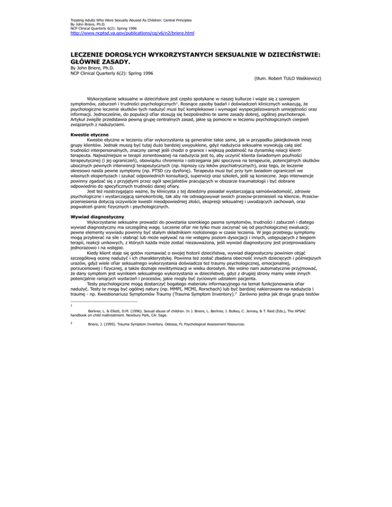 Treating Adults Who Were Sexually Abused As Children: Central Principles By John Briere, Ph.D. NCP Clinical Quarterly 6(2): Spring 1996 http://www.ncptsd.va.gov/publications/cq/v6/n2/briere.html LECZENIE DOROSèYCH WYKORZYSTANYCH SEKSUALNIE W DZIECI STWIE: GèÓWNE ZASADY. By John Briere, Ph.D. NCP Clinical Quarterly 6(2): Spring 1996 (tøum. Robert TULO Wa kiewicz) Wykorzystanie seksualne w dzieci stwie jest cz sto spotykane w naszej kulturze i wi e si z szeregiem symptomów, zaburze i trudno ci psychologicznych1. Rosn ce zasoby bada i do wiadcze klinicznych wskazuj , e psychologiczne leczenie skutków tych nadu y musi by kompleksowe i wymaga wyspecjalizowanych umiej tno ci oraz informacji. Jednocze nie, do populacji ofiar stosuj si bezpo rednio te same zasady dobrej, ogólnej psychoterapii. Artykuø zwi le przedstawia pewn grup centralnych zasad, jakie s pomocne w leczeniu psychologicznych cierpie zwi zanych z nadu yciami. Kwestie etyczne Kwestie etyczne w leczeniu ofiar wykorzystania s generalnie takie same, jak w przypadku jakiejkolwiek innej grupy klientów. Jednak musz by tutaj du o bardziej uwypuklone, gdy nadu ycia seksualne wywoøuj caø sie trudno ci interpersonalnych, znaczny zam t je li chodzi o granice i wi ksz podatno na dynamik relacji klientterapeuta. Najwa niejsze w terapii zorientowanej na nadu ycia jest to, aby uczyni klienta wiadomym poufno ci terapeutycznej (i jej ogranicze ), obowi zku chronienia i ostrzegania jaki spoczywa na terapeucie, potencjalnych skutków ubocznych pewnych interwencji terapeutycznych (np. hipnozy czy leków psychiatrycznych), oraz tego, e leczenie okresowo nasila pewne symptomy (np. PTSD czy dysfori ). Terapeuta musi by przy tym wiadom ogranicze we wøasnych ekspertyzach i szuka odpowiednich konsultacji, superwizji oraz szkole , je li s konieczne. Jego interwencje powinny zgadza si z przyj tymi przez ogóø specjalistów pracuj cych w obszarze traumatologii i by dobrane odpowiednio do specyficznych trudno ci danej ofiary. Jest te rozstrzygaj co wa ne, by klinicysta z tej dziedziny posiadaø wystarczaj c samo wiadomo , zdrowie psychologiczne i wystarczaj c samokontrol , tak aby nie odreagowywaø swoich przeciw-przeniesie na kliencie. Przeciwprzeniesienia dotycz oczywi cie kwestii nieodpowiedniej zøo ci, ekspresji seksualnej i uwodz cych zachowa , oraz pogwaøce granic fizycznych i psychologicznych. Wywiad diagnostyczny Wykorzystanie seksualne prowadzi do powstania szerokiego pasma symptomów, trudno ci i zaburze i dlatego wywiad diagnostyczny ma szczególn wag . Leczenie ofiar nie tylko musi zaczyna si od psychologicznej ewaluacji; pewne elementy wywiadu powinny by staøym skøadnikiem rozøo onego w czasie leczenia. W jego przebiegu symptomy mog przybiera na sile i søabn lub mo e wpøywa na nie wst pny poziom dysocjacji i innych, ust puj cych z biegiem terapii, reakcji unikowych, z których ka da mo e zosta niezauwa ona, je li wywiad diagnostyczny jest przeprowadzany jednorazowo i na wst pie. Kiedy klient staje si gotów rozmawia o swojej historii dzieci stwa, wywiad diagnostyczny powinien obj szczegóøow ocen nadu y i ich charakterystyk . Powinna te zosta zbadana obecno innych dzieci cych i pó niejszych urazów, gdy wiele ofiar seksualnego wykorzystania do wiadcza te traumy psychologicznej, emocjonalnej, porzuceniowej i fizycznej, a tak e doznaje rewiktymizacji w wieku dorosøym. Nie wolno nam automatycznie przyjmowa , e dany symptom jest wynikiem seksualnego wykorzystania w dzieci stwie, gdy z drugiej strony mamy wiele innych potencjalnie rani cych wydarze i procesów, jakie mogøy by yciowym udziaøem pacjenta. Testy psychologiczne mog dostarczy bogatego materiaøu informacyjnego na temat funkcjonowania ofiar nadu y . Testy te mog by ogólnej natury (np. MMPI, MCMI, Rorschach) lub by bardziej nakierowane na nadu ycia i traum - np. Kwestionariusz Symptomów Traumy (Trauma Symptom Inventory).2 Zarówno jedna jak druga grupa testów 1 Berliner, L. & Elliott, D.M. (1996). Sexual abuse of children. In J. Briere, L. Berliner, J. Bulkey, C. Jenney, & T. Reid (Eds.), The APSAC handbook on child maltreatment. Newbury Park, CA: Sage. 2 Briere, J. (1995). Trauma Symptom Inventory. Odessa, FL Psychological Assessment Resources. ma swoje mocne i søabe strony, co musi by wzi te pod uwag podczas interpretacji wyników.3 Testy ogólne na przykøad mog przeoczy , przerysowa lub wypaczy obraz zaburzenia zwi zanego z wykorzystaniem, ale za to mog prawidøowo ukaza wspóøistniej ce inne symptomy lub zaburzenia, podczas gdy pewne nakierowane na nadu ycia testy nie uzyskuj wystarczaj cych danych psychometrycznych lub normatywnych, ale za to mog da potencjalnie niezwykøe informacje o zakøóceniach specyficznych dla traumy seksualnej. Kwestie amnezji i odkrywania pami ci Specyficzna kwestia zwi zana z diagnostycznym wywiadem nakierowanym na wykorzystanie seksualne i jego skutki, dotyczy wa no ci wspomnie zwi zanych z t traum . Klinicy ci z tej dziedziny staj si coraz lepiej wiadomi zøo ono ci døugoterminowego procesu przypominania sobie urazów, zwøaszcza w wietle istnienia ró nych czynników znieksztaøcaj cych pami . Ze wzgl du na nasze gø bsze rozumienie podatno ci ofiar na sugesti (np. osób o silnych symptomach dysocjacyjnych), zalecam eby: (a) ocena dotycz ca wspomnie wykorzystania byøa maksymalnie niedyrektywna i aby klient nie byø ani naciskany na przypominanie sobie niedost pnych dla niego wspomnie nadu y , ani w aden sposób zniech cany przed ich poszukiwaniem; (b) wywiady czy sesje okkrywania wspomnie z u yciem narkotyków b d hipnozy, stosowa tylko w razie absolutnej ostateczno ci i z peønym doinformowaniem klienta przed wyra eniem przez niego zgody; (c) amnezja nie powinna by ani podtrzymywana z góry, ani usuwana przedwcze nie. Czytelników zainteresowanych szczegóøowymi dysputami odsyøamy do artykuøów na temat terapii ofiar i „odzyskiwania wspomnie ,” firmowanych przez Ameryka skie Towarzystwo Psychologiczne, Ameryka skie To