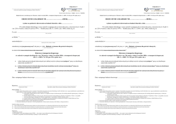 Załącznik nr 2 Załącznik nr 2 ...................................................................... ...................................................................... (oznaczenie podmiotu przeprowadzającego badanie lekarskie) (oznaczenie podmiotu przeprowadzającego badanie lekarskie) Rodzaj badania lekarskiego: wstępne / okresowe / kontrolne Rodzaj badania lekarskiego: wstępne / okresowe / kontrolne Badanie kierowcy zawodowego (art. 39j ustawy z dnia 6 września 2001r. o transporcie drogowym (Dz. U. z 2007r. Nr 125, poz. 874 z późn. zm..)) Badanie kierowcy zawodowego (art. 39j ustawy z dnia 6 września 2001r. o transporcie drogowym (Dz. U. z 2007r. Nr 125, poz. 874 z późn. zm..)) ORZECZENIE LEKARSKIE NR ………………….……./(ROK)……….. ORZECZENIE LEKARSKIE NR ………………….……./(ROK)……….. wydane na podstawie skierowania na badanie lekarskie z dnia …………………. wydane na podstawie skierowania na badanie lekarskie z dnia …………………. W wyniku badania lekarskiego i oceny narażeń́ występujących na stanowisku pracy, stosownie do art. 43 pkt 2 i art. 229 § 4 ustawy z dnia 26 czerwca 1974 r. – Kodeks pracy (Dz. U. z 2016 r. poz. 1666), orzeka się̨, że: W wyniku badania lekarskiego i oceny narażeń́ występujących na stanowisku pracy, stosownie do art. 43 pkt 2 i art. 229 § 4 ustawy z dnia 26 czerwca 1974 r. – Kodeks pracy (Dz. U. z 2016 r. poz. 1666), orzeka się̨, że: P a n (i) ....................................................................................................................................................................................... P a n (i) ....................................................................................................................................................................................... (imię i nazwisko) (imię i nazwisko) nr PESEL **) ................................................................................................................................................................................. nr PESEL **) ................................................................................................................................................................................. zamieszkały(a) w ......................................................................................................................................................................... zamieszkały(a) w ......................................................................................................................................................................... (miejscowość́ , ulica, nr domu, nr lokalu) - zatrudniony(-na)/przyjmowany(-na)*) do pracy w : j.w. (Badanie wykonane dla potrzeb własnych ) (miejscowość́ , ulica, nr domu, nr lokalu) - zatrudniony(-na)/przyjmowany(-na)*) do pracy w : j.w. (Badanie wykonane dla potrzeb własnych ) (nazwa i adres pracodawcy) *) (nazwa i adres pracodawcy) *) na stanowisku/stanowiskach/stanowisko/stanowiska . na stanowisku/stanowiskach/stanowisko/stanowiska . Kierowcy transportu drogowego Kierowcy transportu drogowego (w zakresie wymagań określonych w art. 39j ustawy z dnia 6 września 2001r. o transporcie drogowym) (Dz. U. z 2007r. Nr 125, poz. 874 z późn. zm..) (w zakresie wymagań określonych w art. 39j ustawy z dnia 6 września 2001r. o transporcie drogowym) (Dz. U. z 2007r. Nr 125, poz. 874 z późn. zm..) • wobec braku przeciwwskazań́ zdrowotnych jest zdolny(-na) do wykonywania/podjęcia*) pracy na określonym stanowisku (symbol 21)*) • wobec braku przeciwwskazań́ zdrowotnych jest zdolny(-na) do wykonywania/podjęcia*) pracy na określonym stanowisku (symbol 21)*) • wobec istnienia przeciwwskazań́ zdrowotnych jest niezdolny(-na) do wykonywania/podjęcia*) pracy na określonym stanowisku (symbol 22)*) • wobec istnienia przeciwwskazań́ zdrowotnych jest niezdolny(-na) do wykonywania/podjęcia*) pracy na określonym stanowisku (symbol 22)*) • wobec istnienia przeciwwskazań́ zdrowotnych utracił(a) zdolność́ do wykonywania dotychczasowej pracy z dniem................................................................. (symbol 23) *). • wobec istnienia przeciwwskazań́ zdrowotnych utracił(a) zdolność́ do wykonywania dotychczasowej pracy z dniem................................................................. (symbol 23) *). Data następnego badania okresowego ........................................................ Data następnego badania okresowego ........................................................ Katowice, ................................... Katowice, ................................... (miejscowość́ , data) POUCZENIE ***) ....................................................................... (pieczątka i podpis lekarza przeprowadzającego badanie lekarskie|) : 1. Osoba badana lub pracodawca może w terminie 7 dni od dnia otrzymania orzeczenia lekarskiego wnieść́ odwołanie wraz z jego uzasadnieniem za pośrednictwem lekarza, który je wydał, do jednego z podmiotów odwoławczych, którymi są̨: 1) wojewódzkie ośrodki medycyny pracy właściwe ze względu na miejsce świadczenia pracy lub siedzibę̨ jednostki organizacyjnej, w której jest zatrudniony pracownik; 2) instytuty badawcze dziedzinie medycyny pracy lub Uniwersyteckie Centrum Medycyny Morskiej i Tropikalnej w Gdyni, w przypadku orzeczenia lekarskiego wydanego przez lekarza zatrudnionego w wojewódzkim ośrodku medycyny pracy; 3) Centrum Naukowe Medycyny Kolejowej, w przypadku orzeczenia lekarskiego wydanego przez Kolejowy Zakład Medycyny Pracy; 4) podmiotyleczniczeutworzoneiwyznaczoneprzezMinistraObronyNarodowej. 2. Orzeczenie lekarskie wydane w trybie odwołania jest ostateczne. 3. Orzeczenie lekarskie jest wydawane w dwóch egzemplarzach, z których jeden otrzymuje osoba badana, a drugi pracodawca. (miejscowość́ , data) POUCZENIE ***) ...........................................