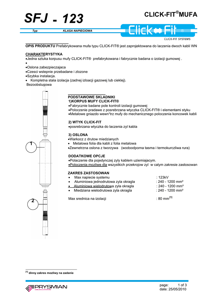 SFJ - 123 Typ CLICK-FIT®MUFA KLASA NAPIECIOWA OPIS PRODUKTU Prefabrykowana mufa typu CLICK-FIT® jest zaprojektowana do laczenia dwoch kabli WN CHARAKTERYSTYKA xJedna sztuka korpusu mufy CLICK-FIT® prefabrykowana i fabrycznie badana o izolacji gumowej . x xOslona zabezpieczajaca xCzesci wstepnie przebadane i zlozone xSzybka instalacja. x Kompletna stala izolacja (zadnej izloacji gazowej lub cieklej). Bezoobslugowa PODSTAWOWE SKLADNIKI 1)KORPUS MUFY CLICK-FIT® xFabrycznie badane pole kontroli izolacji gumowej xPoloczenie pradawe z posrebrzana wtyczka CLICK-FIT® i elementami styku xMetalowe gniazdo wewn¹trz mufy do mechanicznego poloczenia koncowek kabli 2) WTYK CLICK-FIT xposrebrzana wtyczka do laczenia zyl kabla 1 3) OSLONA xWarkocz z drutow miedzianych x Metalowa folia dla kabli z folia metalowa xZewnetrzna oslona z tworzywa (wodoodporna tasma i termokurczliwa rura) DODATKOWE OPCJE xPolaczenie dla pojedynczej zyly kablem uziemiajacym. xPoloczenia mozliwe dla wszystkich przekrojow zyl w calym zakresie zastosowan 2 [1] ZAKRES ZASTOSOWAN x Max napiecie systemu x Aluminiowa jednodrutowa zyla okragla x Aluminiowa wielodrutowa zyla okragla x Miedziana wielodrutowa zyla okragla : 123kV : 240 - 1200 mm² : 240 - 1200 mm² : 240 - 1200 mm² Max srednica na izolacji : 80 mm [1] dinny zakres mozliwy na zadanie page: 1 of 3 date: 25/05/2010 CLICK-FIT® J SFJ - 123 Type Voltage Class DANE ELEKTRYCZNE xNapiecie znam. 24 godz AC 1 minuta AC Udar (+10 / -10 impulsow) : : : 190 kV 230 kV 550 kV xElektryczne testy . AC wytrzymalosc napieciowa Proba wyladowan niezupelnych 190 kV for 30 min bez wyladowan przy 152 kV xPrad pojemnosciowy. Znamionowy prad obciozenia Prad zwarcia 1-s xWytrzymalosc napieciowa powloki. AC DC udar (+10 / -10) : Ograniczony danymi kabla [2] 60 kA : 10 kV przez 1 min 20 kV przez 1 min 40 kV : : WSZYSTKIE PROBY ZGODNIE Z WYMAGANIAM :Pañstwowe i miedzynarodowe standardy IEC-60840 NEN-3630 IEEE Std.404 POZOSTALE DOPUSZCZALNE NAPREZENIE ZYL xmiedziana xAluminiowa 60 N/mm 2 40 N/mm Przyblizona waga 40 kg INSTALACJA xWarunki miejsca xPrace montazowe xTemperatura instalacji [2] 2 : zabezpieczone przed wplywem deszczu i zabrudzeniem tylko przez certyfikowanych/szkolonych monterow : min 0 ºC / max 40 ºC w zaleznosci od wymiaru zyly page: 2 of 3 date: 25/05/2010 CLICK-FIT®Mufa SFJ - 123 Typ Klasa napieciowa TYPOWY RYSUNEK Zyla [mm2] 240 - 1200 L1 [mm] 960 L2 [mm] 1600 D1 Ø [mm] 190 L2 L1 D1 D1 Rys 1 page: 3 of 3 date: 25/05/2010
