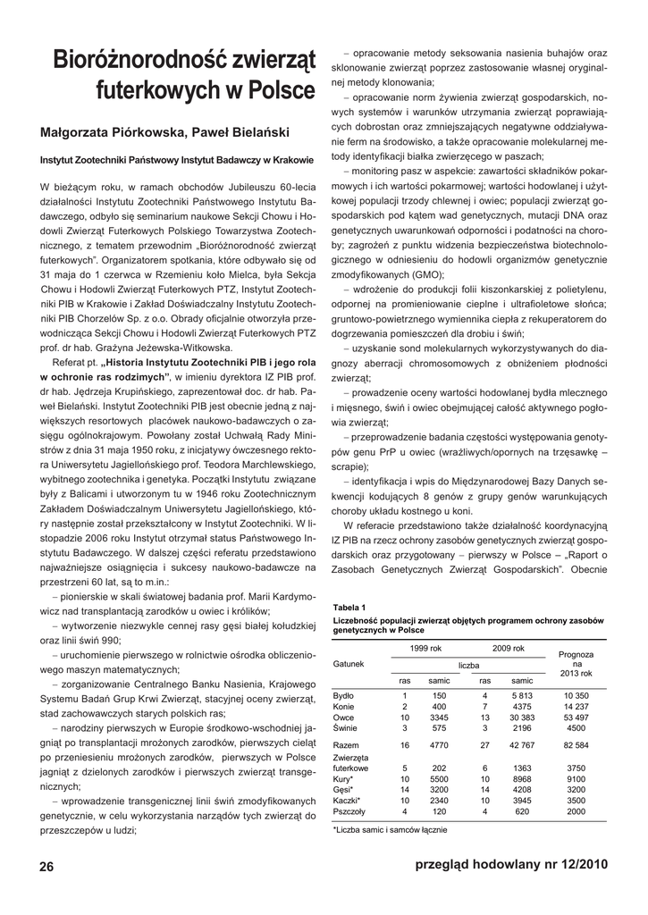 Bioróżnorodność zwierząt futerkowych w Polsce - opracowanie metody seksowania nasienia buhajów oraz sklonowanie zwierząt poprzez zastosowanie własnej oryginalnej metody klonowania; - opracowanie norm żywienia zwierząt gospodarskich, nowych systemów i warunków utrzymania zwierząt poprawiają- Małgorzata Piórkowska, Paweł Bielański cych dobrostan oraz zmniejszających negatywne oddziaływa- Instytut Zootechniki Państwowy Instytut Badawczy w Krakowie tody identyfikacji białka zwierzęcego w paszach; W bieżącym roku, w ramach obchodów Jubileuszu 60-lecia działalności Instytutu Zootechniki Państwowego Instytutu Badawczego, odbyło się seminarium naukowe Sekcji Chowu i Hodowli Zwierząt Futerkowych Polskiego Towarzystwa Zootechnicznego, z tematem przewodnim „Bioróżnorodność zwierząt futerkowych”. Organizatorem spotkania, które odbywało się od 31 maja do 1 czerwca w Rzemieniu koło Mielca, była Sekcja Chowu i Hodowli Zwierząt Futerkowych PTZ, Instytut Zootechniki PIB w Krakowie i Zakład Doświadczalny Instytutu Zootechniki PIB Chorzelów Sp. z o.o. Obrady oficjalnie otworzyła przewodnicząca Sekcji Chowu i Hodowli Zwierząt Futerkowych PTZ prof. dr hab. Grażyna Jeżewska-Witkowska. Referat pt. „Historia Instytutu Zootechniki PIB i jego rola w ochronie ras rodzimych”, w imieniu dyrektora IZ PIB prof. dr hab. Jędrzeja Krupińskiego, zaprezentował doc. dr hab. Paweł Bielański. Instytut Zootechniki PIB jest obecnie jedną z największych resortowych placówek naukowo-badawczych o zasięgu ogólnokrajowym. Powołany został Uchwałą Rady Ministrów z dnia 31 maja 1950 roku, z inicjatywy ówczesnego rektora Uniwersytetu Jagiellońskiego prof. Teodora Marchlewskiego, wybitnego zootechnika i genetyka. Początki Instytutu związane były z Balicami i utworzonym tu w 1946 roku Zootechnicznym Zakładem Doświadczalnym Uniwersytetu Jagiellońskiego, który następnie został przekształcony w Instytut Zootechniki. W listopadzie 2006 roku Instytut otrzymał status Państwowego Instytutu Badawczego. W dalszej części referatu przedstawiono najważniejsze osiągnięcia i sukcesy naukowo-badawcze na przestrzeni 60 lat, są to m.in.: - pionierskie w skali światowej badania prof. Marii Kardymowicz nad transplantacją zarodków u owiec i królików; - wytworzenie niezwykle cennej rasy gęsi białej kołudzkiej oraz linii świń 990; - uruchomienie pierwszego w rolnictwie ośrodka obliczeniowego maszyn matematycznych; - zorganizowanie Centralnego Banku Nasienia, Krajowego Systemu Badań Grup Krwi Zwierząt, stacyjnej oceny zwierząt, stad zachowawczych starych polskich ras; - narodziny pierwszych w Europie środkowo-wschodniej jagniąt po transplantacji mrożonych zarodków, pierwszych cieląt po przeniesieniu mrożonych zarodków, pierwszych w Polsce jagniąt z dzielonych zarodków i pierwszych zwierząt transgenicznych; - wprowadzenie transgenicznej linii świń zmodyfikowanych genetycznie, w celu wykorzystania narządów tych zwierząt do przeszczepów u ludzi; mowych i ich wartości pokarmowej; wartości hodowlanej i użyt- 26 nie ferm na środowisko, a także opracowanie molekularnej me- monitoring pasz w aspekcie: zawartości składników pokarkowej populacji trzody chlewnej i owiec; populacji zwierząt gospodarskich pod kątem wad genetycznych, mutacji DNA oraz genetycznych uwarunkowań odporności i podatności na choroby; zagrożeń z punktu widzenia bezpieczeństwa biotechnologicznego w odniesieniu do hodowli organizmów genetycznie zmodyfikowanych (GMO); - wdrożenie do produkcji folii kiszonkarskiej z polietylenu, odpornej na promieniowanie cieplne i ultrafioletowe słońca; gruntowo-powietrznego wymiennika ciepła z rekuperatorem do dogrzewania pomieszczeń dla drobiu i świń; - uzyskanie sond molekularnych wykorzystywanych do diagnozy aberracji chromosomowych z obniżeniem płodności zwierząt; - prowadzenie oceny wartości hodowlanej bydła mlecznego i mięsnego, świń i owiec obejmującej całość aktywnego pogłowia zwierząt; - przeprowadzenie badania częstości występowania genotypów genu PrP u owiec (wrażliwych/opornych na trzęsawkę – scrapie); - identyfikacja i wpis do Międzynarodowej Bazy Danych sekwencji kodujących 8 genów z grupy genów warunkujących choroby układu kostnego u koni. W referacie przedstawiono także działalność koordynacyjną IZ PIB na rzecz ochrony zasobów genetycznych zwierząt gospodarskich oraz przygotowany - pierwszy w Polsce – „Raport o Zasobach Genetycznych Zwierząt Gospodarskich”. Obecnie Tabela 1 Liczebność populacji zwierząt objętych programem ochrony zasobów genetycznych w Polsce 1999 rok Gatunek 2009 rok liczba Prognoza na 2013 rok ras samic ras samic Bydło Konie Owce Świnie 1 2 10 3 150 400 3345 575 4 7 13 3 5 813 4375 30 383 2196 10 350 14 237 53 497 4500 Razem 16 4770 27 42 767 82 584 Zwierzęta futerkowe Kury* Gęsi* Kaczki* Pszczoły 5 10 14 10 4 202 5500 3200 2340 120 6 10 14 10 4 1363 8968 4208 3945 620 3750 9100 3200 3500 2000 *Liczba samic i samców łącznie przegląd hodowlany nr 12/2010 ochroną objętych jest 95 najcenniejszych ras, odmian i rodów wszystkich gatunków zwierząt użytkowych w naszym kraju, w tym rasy rodzime. W tabeli 1 zawarto liczebność populacji zwierząt objętych programem ochrony zasobów genetycznych w Polsce w 1999 i 2009 roku, a także prognozy dotyczące roku 2013. Kolejny referat, pt. „Historia powstania ZD Chorzelów i 60 lat pracy na rzecz hodowców”, przedstawił dr inż. Jerzy Fijał - prezes ZD IZ PIB Chorzelów Sp. z o.o. Zakład Doświadczalny w Chorzelowie został włączony w skład Instytutu Zootechniki 1 stycznia 1951 roku, jako jednostka badawcza związana z Państwowym Instytutem Naukowym Gospodarstwa Wiejskiego w Puławach. W tym okresie prowadzone prace badawcze związane były z produkcją polową i zakres tej działalności został utrzymany do roku 1952. Następnie, zgodnie z zadaniami IZ, rozpoczęto nowy kierun