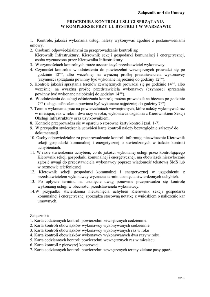 Załącznik nr 4 do Umowy PROCEDURA KONTROLI USŁUGI SPRZĄTANIA W KOMPLEKSIE PRZY UL BYSTREJ 1 W WARSZAWIE 1. Kontrole, jakości wykonania usługi należy wykonywać zgodnie z postanowieniami umowy. 2. Osobami odpowiedzialnymi za przeprowadzanie kontroli są: Kierownik Infrastruktury, Kierownik sekcji gospodarki komunalnej i energetycznej, osoba wyznaczona przez Kierownika Infrastruktury 3. W czynnościach kontrolnych może uczestniczyć przedstawiciel wykonawcy. 4. Czynności kontrolne w odniesieniu do powierzchni wewnętrznych prowadzi się po godzinie 12°°, albo wcześniej na wyraźną prośbę przedstawiciela wykonawcy (czynności sprzątania powinny być wykonane najpóźniej do godziny 12°°). 5. Kontrole jakości sprzątania terenów zewnętrznych prowadzi się po godzinie 14°°, albo wcześniej na wyraźną prośbę przedstawiciela wykonawcy (czynności sprzątania powinny być wykonane najpóźniej do godziny 14°°). 6. W odniesieniu do usługi odśnieżania kontrolę można prowadzić na bieżąco po godzinie 7°° (usługa odśnieżania powinna być wykonane najpóźniej do godziny 7°°). 7. Termin wykonania prac na powierzchniach wewnętrznych, które należy wykonywać raz w miesiącu, raz w roku i dwa razy w roku, wykonawca uzgadnia z Kierownikiem Sekcji Obsługi Infrastruktury oraz użytkownikiem. 8. Kontrole przeprowadza się w oparciu o stosowne karty kontroli (zał. 1-7). 9. W przypadku stwierdzenia uchybień kartę kontroli należy bezwzględnie załączyć do dokumentacji. 10. Osoby odpowiedzialne za przeprowadzanie kontroli informują niezwłocznie Kierownik sekcji gospodarki komunalnej i energetycznej o stwierdzonych w trakcie kontroli uchybieniach. 11. W razie stwierdzenia uchybień, co do jakości wykonanej usługi przez kontrolującego Kierownik sekcji gospodarki komunalnej i energetycznej, ma obowiązek niezwłocznie zgłosić uwagi do przedstawiciela wykonawcy poprzez wiadomość tekstową SMS lub w rozmowie telefonicznej. 12. Kierownik sekcji gospodarki komunalnej i energetycznej w uzgodnieniu z przedstawicielem wykonawcy wyznacza termin usunięcia stwierdzonych uchybień. 13. Po upływie terminu na usunięcie uwag ponownie przeprowadza się kontrolę wykonanej usługi w obecności przedstawiciela wykonawcy. 14.W przypadku stwierdzenia nieusunięcia uchybień Kierownik sekcji gospodarki komunalnej i energetycznej sporządza stosowną notatkę z wnioskiem o naliczenie kar umownych. Załączniki: 1. Karta codziennych kontroli powierzchni zewnętrznych codziennie. 2. Karta kontroli obowiązków wykonawcy wykonywanych codziennie. 3. Karta kontroli obowiązków wykonawcy wykonywanych raz w roku 4. Karta kontroli obowiązków wykonawcy wykonywanych dwa razy w roku. 5. Karta codziennych kontroli powierzchni wewnętrznych raz w miesiącu. 6. Karta kontroli z pierwszej konserwacji. 7. Karta codziennych kontroli powierzchni zewnętrznych tereny zielone pasy ppoż.. str. 1 Lp. 1. 2. 3. 4. 5. 6. 7. 8. 9. 10. Zakres sprzątania (powierzchnie zewnętrznych codziennie) data ………………. adres…………………………………………….. nie Przedmiot wykonano wykonano Sprzątanie i utrzymanie w czystości powierzchni utwardzonych (ulic, dróg, placów, parkingów, zatok parkingowych, chodników itp.) na terenie kompleksów jak również poza terenem kompleksu (chodniki, parkingi przyległe do granicy kompleksu); Opróżnianie koszy zewnętrznych ze śmieci; Stałe utrzymanie w czystości schodów zewnętrznych i ciągów komunikacyjnych prowadzących do budynków; Czyszczenie i utrzymanie w czystości terenów w pobliżu kontenerów na gromadzenie odpadów; Sukcesywne odśnieżanie i posypywanie terenów utwardzonych i w razie konieczności wywóz zaległego śniegu i lodu, który mógłby utrudnić sprawna komunikację na terenie obiektu; Posypywanie piaskiem i chlorkiem wapnia terenów utwardzonych, ciągów komunikacyjnych w celu zabezpieczenia przed poślizgiem, ze względu na ochronę środowiska zabrania się stosowania soli do posypywania; Likwidacja opadów śniegu nie później niż w ciągu 2 godzin po ich wystąpieniu a następnie, jeśli pada nieprzerwanie należy usuwać go na bieżąco aż do momentu, gdy opady znikną i zalegający śnieg zostanie usunięty; Wszystkie wyjścia do budynków: główne i boczne, schody wejściowe oraz ciągi komunikacyjne prowadzące do nich muszą być oczyszczone z zalegającego śniegu przed godz. 7°°; Czy pracownicy zatrudnieni przy wykonywaniu zamówienia są wyposażeni w odpowiednie firmowe uniformy (ubiory) oraz posiadają stosowne indykatory z nazwą firmy; Liczba pracowników realizujących usługę** x x Podpis osoby kontrolującej UWAGI* usunięto uchybienia x Podpis przedstawiciela wykonawcy ………………………………………………. …………………………………………. *-należy precyzyjnie i jednoznacznie wskazać lokalizację wystąpienia uchybień **- należy podać liczbę pracowników wykonujących usługę str. 2 Lp. 1. 2. 3. 4. 5. 6. 7. 8. 9. 10. 11 12. Zakres sprzątania (powierzchnie wewnętrznych codziennie) data ………………. adres…………………………………………….. nie Przedmiot wykonano wykonano Zamiatanie, mycie, okurzanie,-rodzaj czynności i typ urządzeń do sprzątania należy dostosować do określonego rodzaju podłóg (posadzki lastrykowe, drewniane, wykładziny dywanowe, zmywalne, itp.); Czyszczenie i wycieranie, kurzu z powierzchni sprzętów biurowych (np. szafy, biurka, stoły itp. z wyjątkiem komputerów i ich osprzętu) oraz wyposażenia pomieszczeń (np. zabudowy meblowe, listwy odbojowe, drzwi, parapety, grzejniki itp.); Opróżnianie koszy na śmieci (obowiązkowo na koniec dnia pracy oraz w miarę potrzeb w ciągu dnia), wyposażenie koszy w worki foliowe na odpady dostosowane do wielkości koszy; Czyszczenie i wycieranie poręczy i balustrad oraz listwy odbojowych na klatkach schodowych i ciągach komunikacyjny