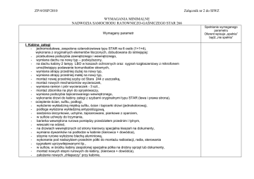 ZP/4/OSP/2010 Załącznik nr 2 do SIWZ WYMAGANIA MINIMALNE NADWOZIA SAMOCHODU RATOWNICZO-GAŚNICZEGO STAR 266 Wymagany parametr I. Kabina załogi - jednomodułowa, zespolona czterodrzwiowa typu STAR na 6 osób (1+1+4), wykonana z oryginalnych elementów tłoczonych, dobudowana do istniejącej: - przebudowa podszybia zewnętrznego i wewnętrznego, - wymiana dachu na nowy typ – podwyższony, - na dachu kabiny 2 lampy LBO w koszach ochronnych oraz sygnał rozgłoszeniowy z mikrofonem umożliwiający podawanie komunikatów słownych, - wymiana atrapy przedniej dużej na nowy typ, - wymiana atrapy przedniej małej na nowy typ, - montaż nowej przedniej szyby od Stara 244 z uszczelką, - montaż nowych mechanizmów wycieraczek, - wymiana ramion i piór wycieraczek - 3 szt., - montaż zbiornika na płyn do spryskiwaczy, - wymiana podszybia tapicerowanego wewnętrznego, - wykonanie drzwi do kabiny załogi z szybami oryginalnymi typu STAR (lewa i prawa strona), - ocieplenie ścian, sufitu, podłogi, - wyłożenie wykładziną miękką sufitu, ścian i tapicerki drzwi (jednokolorową), - podłoga wyłożona wykładziną antypoślizgową, - siedzenia skrzynkowe, uchylne, tapicerowane, piankowe z oparciem, - w suficie uchwyty do trzymania, - barierka wewnętrzna rurowa pomiędzy przedziałem przednim i tylnym, - wieszaki na odzież, - na drzwiach wewnętrznych od strony kierowcy specjalna kieszeń na dokumenty, - wymiana dywaników na podłodze w kabinie (kierowca + dowódca), - stopnie rurowe wyłożone blachą aluminiową, - wykonanie pod nadszybiem przednim półki do montażu radiostacji, radia, sterowania - sygnałami uprzywilejowanymi itp., - w suficie, w środku kabiny zespolonej specjalna półka na drobny sprzęt lub dokumenty, - montaż nowych stopni rurowych do kabiny, (kierowca + dowódca), - założenie nowych „chlapaczy” przy kabinie, Spełnianie wymaganego parametru Oferent wpisuje „spełnia” bądź „nie spełnia” - II. wymiana wsporników i lusterek na nowy typ, ogrzewanie kabiny zespolonej wodne, tapicerowanie siedzeń kierowcy i dowódcy. Nadbudowa pożarnicza: - konstrukcja z profili stalowych zamkniętych zabezpieczona wewnątrz antykorozyjnie, - pokrycie zewnętrzne z blachy aluminiowej, mocowane metodą klejenia, - nadkola z blachy aluminiowej, - 7 szt. żaluzji aluminiowych anodowanych z bocznymi uszczelkami, zamykane jednym kluczem, - żaluzje pyło- i wodoszczelne, wyposażone w mechanizm sprężynowy samozwijalny, wspomagający otwarcie oraz uniemożliwiający samoczynne opadanie, - spody schowków i ścianki wyłożone blachą aluminiową łezkową, - za kabiną załogi znajdują się dwa schowki zamykane drzwiami, - na drzwiach uchwyty do mocowania sprzętu jak: łopaty, szpadle, miotły, siekiery itp., - z prawej strony w schowku znajduje się ruchomy wysięgnik do mocowania koła zapasowego, - z lewej strony schowek przeznaczony na aparaty powietrzne, regał wysuwany, - z tyłu pojazdu przedział autopompy, zamykany żaluzją aluminiową, - pod przedziałem autopompy znajduje się podest zamontowany na tylnym zderzaku, - schowki przeznaczone na osprzęt wodny, w dolnej części wyposażone w stojaki na węże ø 52 i ø 75 oraz uchwyty na prądownice, smok ssawny, rozdzielacz, kliny pod koła, przełącznik, zbieracz, agregat prądotwórczy i inne wyposażenie standardowe, - w lewym tylnym schowku miejsce do mocowania motopompy pływającej „Niagara” na wysuwanym podłożu, - konstrukcja skrytek zapewniająca odprowadzanie wody z ich wnętrza, - szuflady i palety wyposażone w oznaczenia ostrzegawcze, - schowki nadwozia oświetlone wewnątrz automatycznie po otwarciu żaluzji, - oświetlenie zewnętrzne pola pracy wokół samochodu sterowane ręcznie, - dach pojazdu użytkowy pokryty blachą aluminiową łezkową, - na dachu mocowania do drabiny DW10 - balustrada ochronna wykonana jako jednolita nierozłączna część z nadbudową pożarniczą, wyłożona od wewnątrz blachą aluminiową łezkową, na dachu wyjście na działko wodno-pianowe, uchwyty do mocowania drabiny DW-10, węży ssawnych ø 110, hydrantu i klucza hydrantowego, z tyłu pojazdu lampa LBO, drabinka wejściowa na dach - nierdzewna, sygnał cofania z lampą pulsującą. III. Instalacja wodno - pianowa: - zbiornik wodny 2500 litrów z falochronami i włazem rewizyjnym, wykonany ze stali nierdzewnej - zbiornik umieszczony wzdłuż osi pojazdu z falochronami i włazem rewizyjnym, - zbiornik wyposażony w instalację napełniania z hydrantu, króciec 1 x 75, oraz w instalację przelewową i grawitacyjnego opróżniania, - autopompa A 20/10 napędzana przez przystawkę wyjścia mocy, 2 wały napędowe i wał pośredni, - zbiornik na środek pianotwórczy o pojemności 10% zbiornika wody, wykonany ze stali odpornej na korozję. IV. Wyposażenie układu wodno-pianowego: - wyjście ssawne ø 110, - linia tłoczna 2 x ø 75, - napełnianie zbiornika z hydrantu, z zastosowaniem zaworu kulowego, - napełnianie zbiornika środka pianotwórczego ø 52 od góry i z poziomu terenu, - wyjście na działko-pianowe na podest dachu z zaworem 2 ½” , - szybkie natarcie niskociśnieniowe wyprowadzone na kolektorze z zaworem, wężem 40 mb i prądownicą, - układ zraszaczy szt. 4 (2 z przodu i 2 po bokach pojazdu), - podświetlana tablica sterująca z manometrami, regulacją obrotów silnika, elektronicznym wskaźnikiem poziomu wody i środka pianotwórczego, - dozownik środka pianotwórczego - sterowany ręcznie, - elementy układu wodno-pianowego wykonane z materiałów odpornych na korozję. V. Instalacja elektryczna: - oznakowanie pojazdu uprzywilejowanego: 2 lampy LBO w koszach ochronnych na kabinie załogi oraz lampa LBO z tyłu pojazdu, - montaż sygnału dźwiękowego z mikrofonem, - oświetlenie wewnętrzne kabiny załogi, schowków bocznych i schowka tylnego, - oświetlenie nad siedzeniem dowódcy, - montaż nowych tylnych lamp (zawierających stop, kierunkowskazy, światła tylne, cofania, 