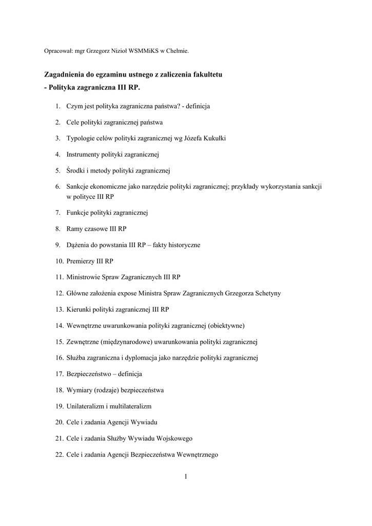 Opracował: mgr Grzegorz Nizioł WSMMiKS w Chełmie. Zagadnienia do egzaminu ustnego z zaliczenia fakultetu - Polityka zagraniczna III RP. 1. Czym jest polityka zagraniczna państwa? - definicja 2. Cele polityki zagranicznej państwa 3. Typologie celów polityki zagranicznej wg Józefa Kukułki 4. Instrumenty polityki zagranicznej 5. Środki i metody polityki zagranicznej 6. Sankcje ekonomiczne jako narzędzie polityki zagranicznej; przykłady wykorzystania sankcji w polityce III RP 7. Funkcje polityki zagranicznej 8. Ramy czasowe III RP 9. Dążenia do powstania III RP – fakty historyczne 10. Premierzy III RP 11. Ministrowie Spraw Zagranicznych III RP 12. Główne założenia expose Ministra Spraw Zagranicznych Grzegorza Schetyny 13. Kierunki polityki zagranicznej III RP 14. Wewnętrzne uwarunkowania polityki zagranicznej (obiektywne) 15. Zewnętrzne (międzynarodowe) uwarunkowania polityki zagranicznej 16. Służba zagraniczna i dyplomacja jako narzędzie polityki zagranicznej 17. Bezpieczeństwo – definicja 18. Wymiary (rodzaje) bezpieczeństwa 19. Unilateralizm i multilateralizm 20. Cele i zadania Agencji Wywiadu 21. Cele i zadania Służby Wywiadu Wojskowego 22. Cele i zadania Agencji Bezpieczeństwa Wewnętrznego 1 23. Cele i zadania Służby Kontrwywiadu Wojskowego 24. Udział AW i SWW w polityce zagranicznej Polski 25. Udział ABW i SKW w polityce zagranicznej Polski 26. Współpraca wywiadowcza 27. Proces decyzyjny w polityce zagranicznej 28. Suwerenność jako wartość w polityce zagranicznej państwa 29. Mocarstwowość w polityce zagranicznej państw 30. Role międzynarodowe państwa 31. Priorytety polskiej polityki zagranicznej 2012-2016 32. Konstytucyjne gwarancje państwa 33. Współpraca globalna i regionalna. Grupa Wyszehradzka, Rada Państw Morza Bałtyckiego, członkostwo w NATO, integracja europejska: UE, Układ z Schengen, Polska na forum ONZ 34. Polska polityka wschodnia 35. Polska w stosunkach z państwami azjatyckimi Literatura: 1. Stosunki międzynarodowe. Geneza. Struktura. Dynamika, red. E. Haliżak, R. Kuźniar, Warszawa 2001, 2. Kuźniar R., Polityka zagraniczna III RP, Warszawa 2012, 3. Polityka zagraniczna Polski: Unia Europejska, Stany Zjednoczone, Sąsiedzi, red. J. Czaputowicz, Warszawa 2008. 4. Wstęp do teorii polityki zagranicznej państwa, red. R. Zięba, Toruń 2004. 5. B. Kuźniak, M. Marcinko, Organizacje międzynarodowe, Warszawa 2008 6. Międzynarodowe stosunki polityczne, red. M. Pietraś, Lublin 2006. 7. Polityka zagraniczna RP 1989-2002, red. R. Kuźniar, K. Szczepanik, Warszawa 2002. W razie pytań proszę o kontakt: [email protected] 2