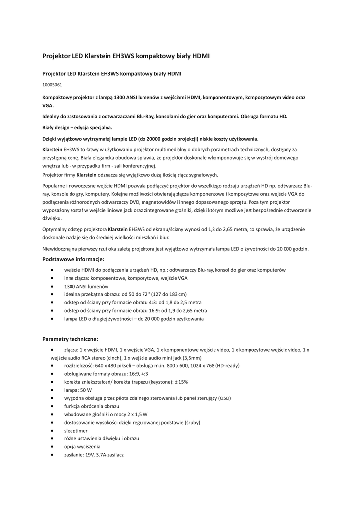 Projektor LED Klarstein EH3WS kompaktowy biały HDMI Projektor LED Klarstein EH3WS kompaktowy biały HDMI 10005061 Kompaktowy projektor z lampą 1300 ANSI lumenów z wejściami HDMI, komponentowym, kompozytowym video oraz VGA. Idealny do zastosowania z odtwarzaczami Blu-Ray, konsolami do gier oraz komputerami. Obsługa formatu HD. Biały design – edycja specjalna. Dzięki wyjątkowo wytrzymałej lampie LED (do 20000 godzin projekcji) niskie koszty użytkowania. Klarstein EH3WS to łatwy w użytkowaniu projektor multimedialny o dobrych parametrach technicznych, dostępny za przystępną cenę. Biała elegancka obudowa sprawia, że projektor doskonale wkomponowuje się w wystrój domowego wnętrza lub - w przypadku firm - sali konferencyjnej. Projektor firmy Klarstein odznacza się wyjątkowo dużą ilością złącz sygnałowych. Popularne i nowoczesne wejście HDMI pozwala podłączyć projektor do wszelkiego rodzaju urządzeń HD np. odtwarzacz Bluray, konsole do gry, komputery. Kolejne możliwości otwierają złącza komponentowe i kompozytowe oraz wejście VGA do podłączenia różnorodnych odtwarzaczy DVD, magnetowidów i innego dopasowanego sprzętu. Poza tym projektor wyposażony został w wejście liniowe jack oraz zintegrowane głośniki, dzięki którym możliwe jest bezpośrednie odtworzenie dźwięku. Optymalny odstęp projektora Klarstein EH3WS od ekranu/ściany wynosi od 1,8 do 2,65 metra, co sprawia, że urządzenie doskonale nadaje się do średniej wielkości mieszkań i biur. Niewidoczną na pierwszy rzut oka zaletą projektora jest wyjątkowo wytrzymała lampa LED o żywotności do 20 000 godzin. Podstawowe informacje: wejście HDMI do podłączenia urządzeń HD, np.: odtwarzaczy Blu-ray, konsol do gier oraz komputerów. inne złącza: komponentowe, kompozytowe, wejście VGA 1300 ANSI lumenów idealna przekątna obrazu: od 50 do 72'' (127 do 183 cm) odstęp od ściany przy formacie obrazu 4:3: od 1,8 do 2,5 metra odstęp od ściany przy formacie obrazu 16:9: od 1,9 do 2,65 metra lampa LED o długiej żywotności – do 20 000 godzin użytkowania Parametry techniczne: złącza: 1 x wejście HDMI, 1 x wejście VGA, 1 x komponentowe wejście video, 1 x kompozytowe wejście video, 1 x wejście audio RCA stereo (cinch), 1 x wejście audio mini jack (3,5mm) rozdzielczość: 640 x 480 pikseli – obsługa m.in. 800 x 600, 1024 x 768 (HD-ready) obsługiwane formaty obrazu: 16:9, 4:3 korekta zniekształceń/ korekta trapezu (keystone): ± 15% lampa: 50 W wygodna obsługa przez pilota zdalnego sterowania lub panel sterujący (OSD) funkcja obrócenia obrazu wbudowane głośniki o mocy 2 x 1,5 W dostosowanie wysokości dzięki regulowanej podstawie (śruby) sleeptimer różne ustawienia dźwięku i obrazu opcja wyciszenia zasilanie: 19V, 3.7A-zasilacz Objęte dostawą: 1 x projektor 1 x pilot zdalnego sterowania 1 x kabel VGA 1 x kabel Cinch-AV 1 x zasilacz 1 x chusteczki do czyszczenia soczewki materiały montażowe niemieckojęzyczna instrukcja obsługi (inne języki: angielski) Parametry fizyczne Klarstein EH3WS HD-Beamer: 16 x 9 x 24cm (szer.x wys.x gł.) waga: ok. 1,25 kg