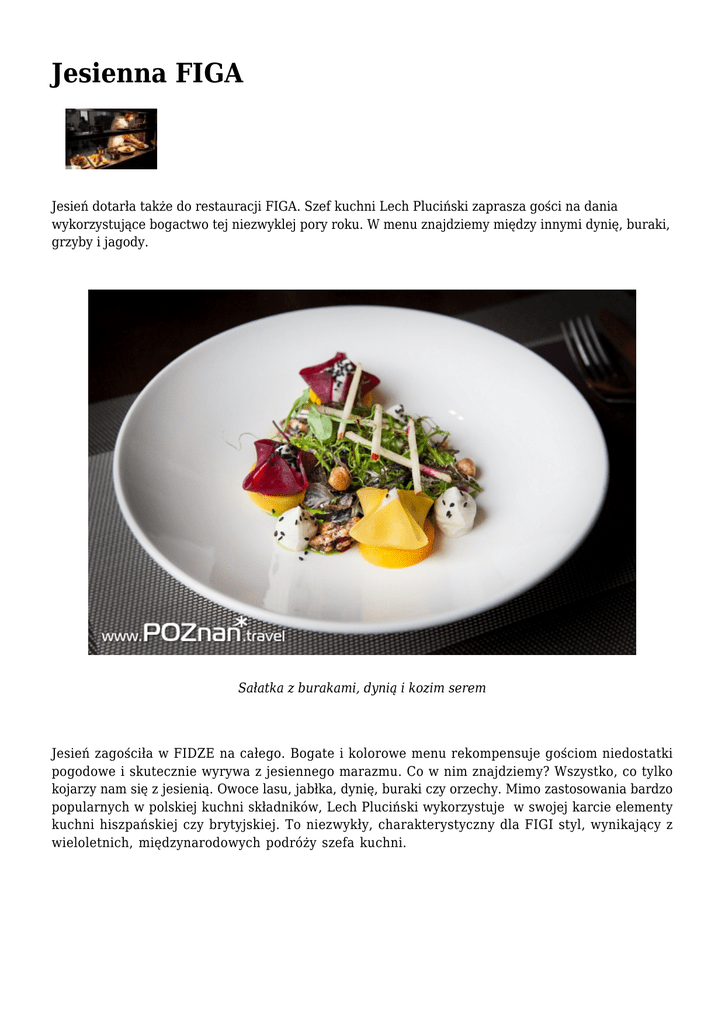 Jesienna FIGA Jesień dotarła także do restauracji FIGA. Szef kuchni Lech Pluciński zaprasza gości na dania wykorzystujące bogactwo tej niezwyklej pory roku. W menu znajdziemy między innymi dynię, buraki, grzyby i jagody. Sałatka z burakami, dynią i kozim serem Jesień zagościła w FIDZE na całego. Bogate i kolorowe menu rekompensuje gościom niedostatki pogodowe i skutecznie wyrywa z jesiennego marazmu. Co w nim znajdziemy? Wszystko, co tylko kojarzy nam się z jesienią. Owoce lasu, jabłka, dynię, buraki czy orzechy. Mimo zastosowania bardzo popularnych w polskiej kuchni składników, Lech Pluciński wykorzystuje w swojej karcie elementy kuchni hiszpańskiej czy brytyjskiej. To niezwykły, charakterystyczny dla FIGI styl, wynikający z wieloletnich, międzynarodowych podróży szefa kuchni. Buraczane risotto z kozim serem i czarnym sezamem Na talerzach znajdziemy oczywiscie ryby i mięsa, dla których jesienne produkty to tylko dodatki. W wielu daniach grają one jednak główne role. Szczególnie widoczne są dynia i buraki. Tych drugich posmakujemy chociażby w delikatnie słodkawym, buraczanym risotto podawanym z łagodnym, kremowym kozim serem. "Pavlova" to deser, który w FIDZE także zmienia się wraz z porami roku. Jeszcze nie tak dawno mieliśmy okazje próbować go z różanymi bezami i lodami. Dziś, w jesiennej odsłonie, na talerzu znajdziemy mus z kasztanów, borówki i maliny. Deser jak zwykle doskonały i jak cale menu Lecha Plucińskiego wart wycieczki na oddalone od centrum Plewiska. "Pavlova" - deserowa klasyka oparta o lody, lekkie bezy i smakowe dodatki Turystom przypominamy, że "odległy" to w kompaktowym Poznaniu pojęcie względne. Figa położona jest niecałe 5 km od Dworca Poznań Główny. Warto także pamiętać, że nad restauracja znajduje się kilka wygodnych pokoi hotelowych. Restauracja FIGA Grunwaldzka 512, 62-064 Plewiska www.figarestauracja.pl | tel. +48 601 174 749 | tel. +48 61 861 74 75 Zobacz także poprzednie wpisy publikowane w dziale: AKTUALNOŚCI GASTRONOMICZNE Tekst: www.poznan.travel | Foto: www.poznan.travel, archiwum restauracji FIGA