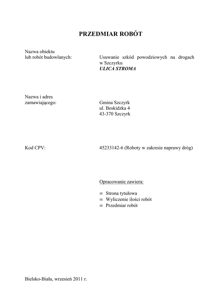 PRZEDMIAR ROBÓT Nazwa obiektu lub robót budowlanych: Nazwa i adres zamawiającego: Kod CPV: Usuwanie szkód powodziowych na drogach w Szczyrku ULICA STROMA Gmina Szczyrk ul. Beskidzka 4 43-370 Szczyrk 45233142-6 (Roboty w zakresie naprawy dróg) Opracowanie zawiera: • Strona tytułowa • Wyliczenie ilości robót • Przedmiar robót Bielsko-Biała, wrzesień 2011 r. Zuzia (C) DataComp 1994-2009(lic. 11755) Wyliczenie iloĞci robót Opis pozycji, wyliczenie iloĞci robót IloĞü Krot. Jedn. 1 Remont nawierzchni korpusu i poboczy w ul.Stromej /grupa CPV 452 / 1 Mechaniczne Ğcinanie drzew z karczowaniem pni, Ğrednice drzew 66-75·cm /SST001/ 2 Wyrąb lub karczowanie drzew, zagajników, krzaków wywiezienie dłuĪycy, karpiny i gałĊzi wywiezienie karpiny i gałĊzi na odległoĞü do 2 km z załad. na przyczepy skrzyniowe (poz 28) /SST001/ 3 Wyrąb lub karczowanie drzew, zagajników, krzaków rĊczne karczowanie pni i korzeni. odkopanie pni odrabanie, odniesienie do 30m, zasypanie dołu. drzewo o płytkim zakorzenieniu i grub. 31-40 cm (poz 13) /SST001/ 4 UsuniĊcie i spalenie pozostałoĞci po karczowaniu, drągowina, karcze, gałĊzie i resztki z drzew (bez wzglĊdu na ĞrednicĊ) /SST001/ 5 Rozebranie nawierzchni, masy mineralno-bitumiczne gruboĞü 4·cm, mechanicznie /SST003/ 6 Rozebranie nawierzchni, tłuczeĔ gruboĞü 15·cm, mechanicznie /SST003/ 7 Rzebranie przepustów z rur Īelbetowych Fi 80 cm /SST003/ 8 Rozebranie przepustów rurowych, Ğcianki czołowe i ławy z kamienia łamanego /SST003/ 9 Roboty ziemne wykonywane koparkami przedsiĊbiernymi z transportem urobku samochodami samowyładowczymi na odległoĞü do 1 km, kategoria gruntu III-IV /SST004/ 10 Roboty ziemne wykonywane koparkami przedsiĊbiernymi z transportem urobku samochodami samowyładowczymi na odległoĞü do 1 km, kategoria gruntu III-IV - ĞciĊcie pobocza /SST004/ 11 Czyszczenie rowów z wyprofilowaniem dna i skarp gr. NAMUŁU 10 cm /SST001/ 12 Czyszczenie rowów z wyprofilowaniem dna i skarp dodatek za kaĪde dalsze 10 cm namułu /krotnoĞü=3/ /SST001/ 13 Oczyszczenie rowów; zanieczyszczenie warstwą gruboĞci powyĪej 10·cm /SST001/ 14 Nakłady uzupełniające do tablic za kaĪdy dalszy rozpoczĊty 1 km odległoĞci transportu ponad 1 km samochodami samowyładowczymi, drogi o nawierzchni utwardzonej, kategoria gruntu I-IV,/K=4/ /SST004/ 320,0+74,0-100,0 = 294,000000 294,00 15 Zasypanie wykopów po wykonaniu murków i Ğcianek czołowych,gr. kat. III-IV /SST004/ 16 Podbudowy z kruszyw, tłuczeĔ, gruboĞü warstwy po zagĊszczeniu 15·cm - pod przepusty drogowe /SST005/ ; 10*1,5 = 15,000000 15,00 17 Podbudowy z kruszyw, tłuczeĔ, gruboĞü warstwy po zagĊszczeniu 15·cm - skrzyĪowanie przy posesji nr 16 /SST005/ ; 100 = 100,000000 100,00 18 Podbudowy betonowe, bez dylatacji, gruboĞü warstwy po zagĊszczeniu 12·cm - pod przepust drogowy /SST007/ ; 15 = 15,000000 15,00 19 Obsypka rurociągu kruszywem dowiezionym, piasek /SST004/ 20 Kanały z rur typu PVC łączone na wcisk, Fi·500·mm SN-8 /SST004/ 21 Kanały z rur typu PVC łączone na wcisk, Fi·800·mm SN-8-analogia /SST004/ 22 Rury z betonu Īwirowego typu "WIPRO" uszczelniane uszczelką gumową, Fi·1200·mm /SST004/ 23 PorĊcze na przyczółkach /SST010/ 24 ĝciany murków Īelb.czołowych i murów z betonu C16/20 /SST007/ ; 10,0+2,0*1,5*0,3*2 = 11,800000 11,80 25 ĝciany i dno studni Īelbetowej przed przepustem fi 800, beton C16/20 /SST007/ 26 Zbrojenie konstrukcji betonowych murków i studni /SST007A/ ; 15,3*60 = 918,000000 918 27 Korytka Īelebtowe o szerokoĞci 1,1m i głĊbokoĞci 0,6m - wydłuĪenie umocnienia koryta potoku /analogia/ /SST004/ 28 Scinanie poboczy wykonane mechanicznie, gruboĞü Ğcinania 10·cm /SST001/ 29 Koryta wykonywane na poszerzeniach, na jezdniach, grunt kategorii·II-IV, głĊbokoĞü 10·cm, pobocza /SST004/ 30 Podbudowy z kruszyw łamanych , po zagĊszczeniu 15·cm, pobocza /SST005/ 31 Powierzchniowe utrwalenie nawierzchni z podwójnym rozsypaniem grysów /SST008/ 32 Podwójna belka drewniana kierująca wodĊ fi 160 mm [2x7m, 2x5m, 2x5m, 2x7m] /SST004/ ; 0,08*0,08*3,14*24,0*2 = 0,964608 0,96 33 Odwiezienie gruntu z korytowania poszerzenia poboczy jezdni na odl.1 km /SST004/ ; 66,0*0,1 = 6,600000 6,60 34 J.w. lecz dopłata za dalsze 4 km odwiezienia gruntu /K=4/ /SST004/ 35 Ławy pod krawĊĪniki i odwodnienia , B-20 /SST007/ ; 0,05*81,0+0,5*0,1*143,0 = 11,200000 11,20 36 KrawĊĪniki betonowe bez ław, wystające 15x30·cm, podsypka cementowo-piaskowa /SST007/ 37 Warstwa profilowa z masy asfaltowej,Ğrednia gruboĞü 3 cm /SST008/ 725,0*0,075 = 54,375000 54,38 38 Skropienie nawierzchni asfaltem /K=2/ /SST008/ ; 725 = 725,000000 725,00 39 Nawierzchnie z mieszanek mineralno-bitumicznych grysowych, asfaltowe, warstwa Ğcieralna o gruboĞci 3·cm /SST008/ 40 Nawierzchnie z mieszanek mineralno-bitumicznych grysowych, asfaltowe, dodatek za kaĪdy dalszy 1·cm gruboĞci warstwy/K=2/ /SST008/ 41 Bariery ochronne U-14a /SST010/ 42 Rozebranie pasów nawierzchni z płyt aĪurowych o wym. 0.6*0.8 m /SST003/ Zuzia (C) DataComp 1994-2009(lic. 11755) 2 szt 10,0 m3 4 szt 12,0 155,0 115,0 7,0 12,0 mp m2 m2 m m3 320,00 m3 74,00 20,0 m3 m 20,0 3,00 m 111,0 m 294,00 4,00 m3 100,00 m3 15,00 1 m2 100,00 m2 15,00 8,00 2,5 8,5 7,5 18,0 m2 m3 m m m m 11,80 3,50 m3 m3 918 kg 5,0 86,00 86,00 86,00 86,00 m m2 m2 m2 m2 0,96 m3 6,60 m3 6,60 4,00 m3 11,20 81,0 m3 m 54,38 t 725,00 2,00 m2 725,00 m2 725,00 2,00 m2 14,0 m Zuzia (C) DataComp 1994-2009(lic. 11755) Opis pozycji, wyliczenie iloĞci robót ;pow.pasów z płyt aĪurowych 136 43 Nawierzchnie z płyt wielootworowych, odbudowanie koryta /SST006/ ; 479 44 Podbudowa z kruszyw łamanych warstwa górna gruboĞü warstwy 5·cm /SST005/ 479 45 46 47 48 49 50 51 52 53 54 IloĞü = = = Krot. Jedn. 0,000000 136,000000 136,00 136,00 m2 479,000000 479,00 479,00 m2 479,00 479,00 1 m2 5 m2 479,00 m2 479,00 m2 225,00 m2 143,0 m 143,0 m 5,40 m3 27,0 3,0 m m 3,0 m = 479,000000 479,00 Podbud