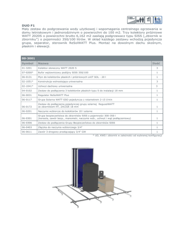 DUO F1 Mały zestaw do podgrzewania wody użytkowej i wspomagania centralnego ogrzewania w domu letniskowym i jednorodzinnym o powierzchni do 100 m2. Trzy kolektory próżniowe WATT 2020S o powierzchni brutto 6,162 m2 zasilają podgrzewacz typu SISS („zbiornik w zbiorniku”) o pojemności 350/100 litrów. W skład każdego zestawu wchodzą pojedyncza grupa, separator, sterownik ReSolWATT Plus. Montaż na dowolnym dachu skośnym, płaskim i elewacji. 00-3001 Symbol Nazwa Ilość 01-3201 Kolektor słoneczny WATT 2020 S 3 07-0200* Bufor wężownicowy podójny SISS 350/100 1 06-0131 Płyn do kolektorów płaskich i próżniowych LAJT SOL - 20 l 1 02-1051* Konstrukcja wolnostojąca uniwersalna 3 02-1041* Uchwyt dachowy uniwersalna 3 04-0102 Zestaw do podłączenia 3 kolektorów płaskich typu S do instalacji 18 mm 1 06-0031 Regulator ReSolWATT Plus 1 06-0117 Grupa Solarna WATT GSO pojedyncza z rotametrem 2-15 l/min 1 06-0172 Zestaw do podłączenia pojedynczej grupy solarnej RegusolWATT ze zbiornikiem HT, ZACISK 18 mm 1 06-0201 Naczynie wzbiorcze do kolektorów 18 l solarne 1 06-0301 Grupa bezpieczeństwa do zbiorników SiSS o pojemności 300-350 l (konsola, zawór bezp., manometr, naczynie wzb., uchwyt i wąż podłączeniowy) 1 06-0306 Zestaw do podłączenia Grupy Bezpieczeństwa do zbiorników SISS 1 06-0403 Złączka do naczynia wzbiorczego 3/4" 1 06-0611 Zawór 3-drogowy przełączający 3/4" GW 1 * UD, KWS i zbiornik w zależności od wybranej konfiguracji