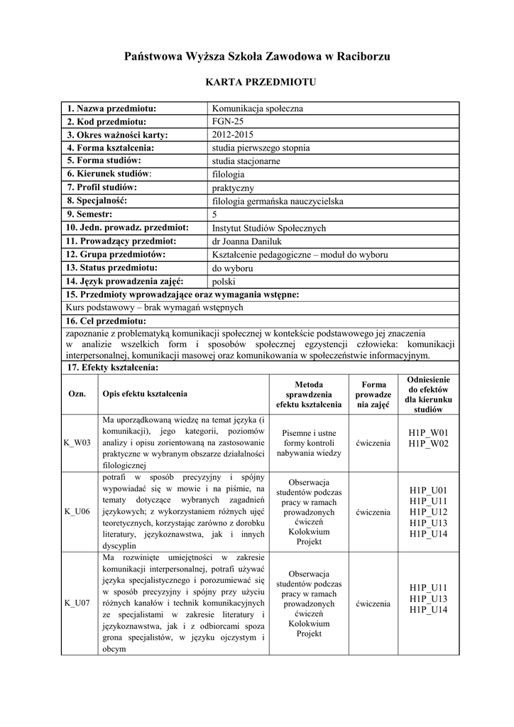 Państwowa Wyższa Szkoła Zawodowa w Raciborzu KARTA PRZEDMIOTU Komunikacja społeczna 1. Nazwa przedmiotu: FGN-25 2. Kod przedmiotu: 2012-2015 3. Okres ważności karty: studia pierwszego stopnia 4. Forma kształcenia: 5. Forma studiów: studia stacjonarne 6. Kierunek studiów: filologia 7. Profil studiów: praktyczny 8. Specjalność: filologia germańska nauczycielska 9. Semestr: 5 10. Jedn. prowadz. przedmiot: Instytut Studiów Społecznych 11. Prowadzący przedmiot: dr Joanna Daniluk 12. Grupa przedmiotów: Kształcenie pedagogiczne – moduł do wyboru 13. Status przedmiotu: do wyboru 14. Język prowadzenia zajęć: polski 15. Przedmioty wprowadzające oraz wymagania wstępne: Kurs podstawowy – brak wymagań wstępnych 16. Cel przedmiotu: zapoznanie z problematyką komunikacji społecznej w kontekście podstawowego jej znaczenia w analizie wszelkich form i sposobów społecznej egzystencji człowieka: komunikacji interpersonalnej, komunikacji masowej oraz komunikowania w społeczeństwie informacyjnym. 17. Efekty kształcenia: Ozn. K_W03 K_U06 K_U07 Opis efektu kształcenia Ma uporządkowaną wiedzę na temat języka (i komunikacji), jego kategorii, poziomów analizy i opisu zorientowaną na zastosowanie praktyczne w wybranym obszarze działalności filologicznej potrafi w sposób precyzyjny i spójny wypowiadać się w mowie i na piśmie, na tematy dotyczące wybranych zagadnień językowych; z wykorzystaniem różnych ujęć teoretycznych, korzystając zarówno z dorobku literatury, językoznawstwa, jak i innych dyscyplin Ma rozwinięte umiejętności w zakresie komunikacji interpersonalnej, potrafi używać języka specjalistycznego i porozumiewać się w sposób precyzyjny i spójny przy użyciu różnych kanałów i technik komunikacyjnych ze specjalistami w zakresie literatury i językoznawstwa, jak i z odbiorcami spoza grona specjalistów, w języku ojczystym i obcym Metoda sprawdzenia efektu kształcenia Forma prowadze nia zajęć Pisemne i ustne formy kontroli nabywania wiedzy ćwiczenia Obserwacja studentów podczas pracy w ramach prowadzonych ćwiczeń Kolokwium Projekt Obserwacja studentów podczas pracy w ramach prowadzonych ćwiczeń Kolokwium Projekt ćwiczenia ćwiczenia Odniesienie do efektów dla kierunku studiów H1P_W01 H1P_W02 H1P_U01 H1P_U11 H1P_U12 H1P_U13 H1P_U14 H1P_U11 H1P_U13 H1P_U14 K_K01 Ma świadomość poziomu swojej wiedzy i umiejętności, rozumie potrzebę ciągłego dokształcania się zawodowego i rozwoju osobistego, dokonuje samooceny własnych kompetencji i doskonali umiejętności, wyznacza kierunki własnego rozwoju i kształcenia Obserwacja studentów podczas pracy w ramach prowadzonych ćwiczeń ćwiczenia H1P_K01 H1P_K04 K_K06 uczestniczy w życiu kulturalnym, korzystając z różnych mediów i różnych jego form zarówno w języku rodzimym, jak i w języku obcym. Obserwacja studentów podczas pracy w ramach prowadzonych ćwiczeń ćwiczenia H1P_K06 18. Formy i wymiar zajęć: Ćw. 15 h 19. Treści kształcenia: 1. Komunikacja jako zasadnicza umiejętność życia społecznego. Źródła historyczne komunikacji społecznej. 2. Komunikacja jako proces: istota procesu komunikowania - etymologia terminu, definicje komunikowania, cechy komunikowania, elementy procesu komunikowania; poziomy procesu komunikowania; sposoby porozumiewania się ludzi - komunikowanie interpersonalne - bezpośrednie, komunikowanie interpersonalne - medialne, komunikowanie pośrednie - masowe; formy komunikowania: werbalne, niewerbalne; typy komunikowania - perswazyjne i informacyjne. Komunikacja werbalna i niewerbalna. Komunikacja niewerbalna – wyrazy twarzy, gesty, emocje; płeć a komunikacja niewerbalna Mowa ciała – prezentacje. Jeszcze o podstawach teoretycznych komunikacji interpersonalnej: kompetencja komunikacyjna, poziomy komunikacji interpersonalnej, komunikacja jednokierunkowa i dwukierunkowa. Przeszkody w skutecznym komunikowaniu się (bariery komunikacyjne) i ich przezwyciężanie. Aktywne słuchanie. Komunikacja a konflikty. Komunikacja i perswazja, czyli jak skutecznie porozumiewać się z innymi – Akademia Rozwoju, szkolenie na CD. Komunikowanie w społeczeństwie informacyjnym. Obywatel społeczeństwa informacyjnego. Komunikacja interpersonalna w społeczeństwie informacyjnym. Społeczeństwo cyfrowe. Nowe sposoby komunikowania się. 3. 4. 5. 6. 7. 8. 9. 20. Egzamin: 21. Literatura podstawowa: nie, zal/o Dobek – Ostrowska B., Podstawy komunikowania społecznego, Wrocław 2007. Giddens A., Socjologia, Warszawa 2006. Griffin E., Podstawy komunikacji społecznej, Gdańsk 2003. Pease A. i B., Mowa ciała, Poznań 2007. 22. Literatura uzupełniająca: Fiske J., Wprowadzenie do badań nad komunikowaniem, Wrocław 1999. Goban-Klas T., Media i komunikowanie masowe, Warszawa-Kraków 1999. Morreale S.P.; Spitzberg B.H., Barge J.K., Komunikacja między ludźmi, Warszawa 2007. Mosty zamiast murów. Podręcznik komunikacji interpersonalnej, red nauk. J. Stewart, Warszawa 2007. Studia z teorii komunikowania masowego pod red. B. Bobek-Ostrowskiej, Wrocław 1999. 23. Nakład pracy studenta potrzebny do osiągnięcia efektów kształcenia: Liczba godzin Lp. Forma zajęć kontaktowych / pracy studenta 1 Wykład 15 2 Ćwiczenia 45 Inne: praca własna studenta – projekt, 3 przygotowanie do kolokwium, przygotowanie do ćwiczeń Suma godzin 24. Suma wszystkich godzin: 60 60 25. Liczba punktów ECTS: 2 26. Liczba punktów ECTS uzyskanych na zajęciach z bezpośrednim udziałem nauczyciela akademickiego: 28. Uwagi: 0,5 27. Liczba punktów ECTS uzyskanych w wyniku samodzielnej pracy studenta: Zatwierdzono: ……………………………. ………………………………………………… (data i podpis prowadzącego) (data i podpis) 1,5