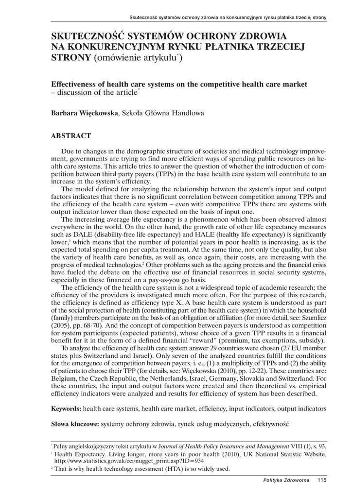 SkutecznoÊç systemów ochrony zdrowia na konkurencyjnym rynku p∏atnika trzeciej strony SKUTECZNOÂå SYSTEMÓW OCHRONY ZDROWIA NA KONKURENCYJNYM RYNKU P¸ATNIKA TRZECIEJ STRONY (omówienie artyku∏u*) Effectiveness of health care systems on the competitive health care market – discussion of the article* Barbara Wi´ckowska, Szko∏a G∏ówna Handlowa ABSTRACT Due to changes in the demographic structure of societies and medical technology improvement, governments are trying to find more efficient ways of spending public resources on health care systems. This article tries to answer the question of whether the introduction of competition between third party payers (TPPs) in the base health care system will contribute to an increase in the system’s efficiency. The model defined for analyzing the relationship between the system’s input and output factors indicates that there is no significant correlation between competition among TPPs and the efficiency of the health care system – even with competitive TPPs there are systems with output indicator lower than those expected on the basis of input one. The increasing average life expectancy is a phenomenon which has been observed almost everywhere in the world. On the other hand, the growth rate of other life expectancy measures such as DALE (disability-free life expectancy) and HALE (healthy life expectancy) is significantly lower,1 which means that the number of potential years in poor health is increasing, as is the expected total spending on per capita treatment. At the same time, not only the quality, but also the variety of health care benefits, as well as, once again, their costs, are increasing with the progress of medical technologies.2 Other problems such as the ageing process and the financial crisis have fueled the debate on the effective use of financial resources in social security systems, especially in those financed on a pay-as-you go basis. The efficiency of the health care system is not a widespread topic of academic research; the efficiency of the providers is investigated much more often. For the purpose of this research, the efficiency is defined as efficiency type X. A base health care system is understood as part of the social protection of health (constituting part of the health care system) in which the household (family) members participate on the basis of an obligation or affiliation (for more detail, see: Szumlicz (2005), pp. 68-70). And the concept of competition between payers is understood as competition for system participants (expected patients), whose choice of a given TPP results in a financial benefit for it in the form of a defined financial “reward” (premium, tax exemptions, subsidy). To analyze the efficiency of health care system answer 29 countries were chosen (27 EU member states plus Switzerland and Israel). Only seven of the analyzed countries fulfill the conditions for the emergence of competition between payers, i. e., (1) a multiplicity of TPPs and (2) the ability of patients to choose their TPP (for details, see: Wi´ckowska (2010), pp. 12-22). These countries are: Belgium, the Czech Republic, the Netherlands, Israel, Germany, Slovakia and Switzerland. For these countries, the input and output factors were created and then theoretical vs. empirical efficiency indicators were analyzed and results for efficiency of system has been described. Keywords: health care systems, health care market, efficiency, input indicators, output indicators S∏owa kluczowe: systemy ochrony zdrowia, rynek us∏ug medycznych, efektywnoÊç Pe∏ny angielskoj´zyczny tekst artyku∏u w Journal of Health Policy Insurance and Management VIII (I), s. 93. Health Expectancy. Living longer, more years in poor health (2010), UK National Statistic Website, http://www.statistics.gov.uk/cci/nugget_print.asp?ID=934 2 That is why health technology assessment (HTA) is so widely used. * 1 Polityka Zdrowotna 115 Barbara Wi´ckowska OMÓWIENIE Wyd∏u˝ajàce si´ przeci´tne dalsze trwanie ˝ycia w szybszym tempie ni˝ przeci´tne dalsze trwanie ˝ycia w zdrowiu, post´pujàcy proces starzenia si´ ludnoÊci oraz wyk∏adniczy wzrost kosztów Êwiadczeƒ medycznych sprawiajà, i˝ coraz cz´Êciej poszukuje si´ metod poprawy efektywnoÊci systemów ochrony zdrowia, ze szczególnym naciskiem na racjonalizacj´ kosztów. Jednà z postulowanych metod wp∏ywu na ograniczenie kosztów jest wprowadzenie konkurencji mi´dzy p∏atnikami, dzi´ki czemu staraliby si´ oni nie tylko oddzia∏ywaç na cen´ i jakoÊç us∏ug medycznych, lecz równie˝ i na zachowania pacjenta. Celem artyku∏u jest okreÊlenie wp∏ywu konkurencji pomi´dzy p∏atnikami w bazowym systemie ochrony zdrowia na efektywnoÊç tego sytemu. W analizie uwzgl´dniono 27 krajów Unii Europejskiej poszerzonych o Szwajcari´, Izrael, Norwegi´ i Kanad´. W badaniu pomini´to system zdrowotny Stanów Zjednoczonych. Mimo i˝ jest on traktowany jako najbardziej konkurencyjny system na Êwiecie, nie móg∏ stanowiç przedmiotu niniejszego badania, poniewa˝ badanie dotyczy∏o systemów bazowych, zaÊ w Stanach Zjednoczonych system bazowy jest ograniczony do minimum. Do okreÊlenia efektywnoÊci systemu ochrony zdrowia pos∏u˝ono si´ modelem ekonometrycznym okreÊlajàcym relacj´ pomi´dzy czynnikiem nak∏adów a czynnikiem efektów dla badanych krajów. Czynniki uzyskano jako sztuczne zmienne powsta∏e z zastosowania metody analizy czynnikowej, odr´bnie dla dwóch ró˝nych grup danych, przy czym dla nak∏adów uwzgl´dniono takie miary, jak: • wydatki na system ochrony zdrowia jako % PKB, • personel medyczny (lekarze i piel´gniarki) na 1 000 mieszkaƒców, • liczba ∏ó˝ek w stacjonarnej opiece zdrowotnej na 1 000 mieszkaƒców. Natomiast dla zdefiniowania zmiennej opisujàcej efekty uzyskiwane przez system uwzgl´dniono takie miary, jak: • przeci´tne trwanie ˝ycia w zdrowiu (ang. Healthy Life Expectancy, HALE), • wspó∏czynnik u