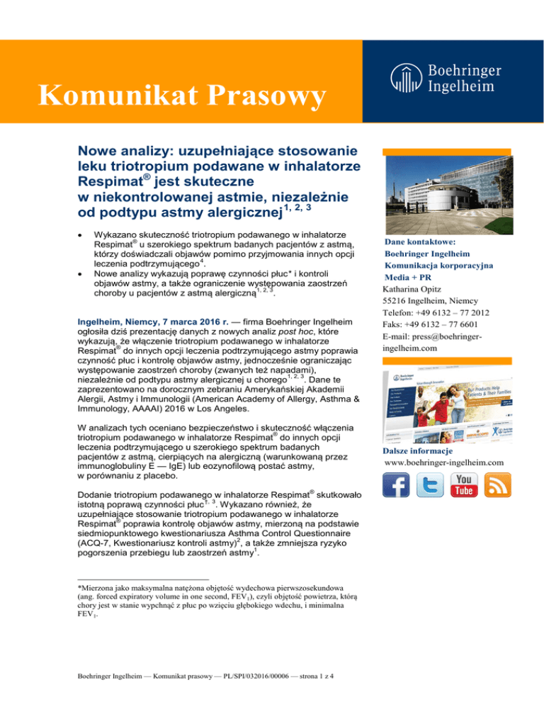 Komunikat Prasowy Nowe analizy: uzupełniające stosowanie leku triotropium podawane w inhalatorze Respimat® jest skuteczne w niekontrolowanej astmie, niezależnie od podtypu astmy alergicznej 1, 2, 3 • • Wykazano skuteczność triotropium podawanego w inhalatorze ® Respimat u szerokiego spektrum badanych pacjentów z astmą, którzy doświadczali objawów pomimo przyjmowania innych opcji 4 leczenia podtrzymującego . Nowe analizy wykazują poprawę czynności płuc* i kontroli objawów astmy, a także ograniczenie występowania zaostrzeń 1, 2, 3 choroby u pacjentów z astmą alergiczną . Ingelheim, Niemcy, 7 marca 2016 r. — firma Boehringer Ingelheim ogłosiła dziś prezentację danych z nowych analiz post hoc, które wykazują, że włączenie triotropium podawanego w inhalatorze ® Respimat do innych opcji leczenia podtrzymującego astmy poprawia czynność płuc i kontrolę objawów astmy, jednocześnie ograniczając występowanie zaostrzeń choroby (zwanych też napadami), 1, 2, 3 . Dane te niezależnie od podtypu astmy alergicznej u chorego zaprezentowano na dorocznym zebraniu Amerykańskiej Akademii Alergii, Astmy i Immunologii (American Academy of Allergy, Asthma & Immunology, AAAAI) 2016 w Los Angeles. W analizach tych oceniano bezpieczeństwo i skuteczność włączenia ® triotropium podawanego w inhalatorze Respimat do innych opcji leczenia podtrzymującego u szerokiego spektrum badanych pacjentów z astmą, cierpiących na alergiczną (warunkowaną przez immunoglobuliny E — IgE) lub eozynofilową postać astmy, w porównaniu z placebo. ® Dodanie triotropium podawanego w inhalatorze Respimat skutkowało †, 3 istotną poprawą czynności płuc . Wykazano również, że uzupełniające stosowanie triotropium podawanego w inhalatorze ® Respimat poprawia kontrolę objawów astmy, mierzoną na podstawie siedmiopunktowego kwestionariusza Asthma Control Questionnaire 2 (ACQ-7, Kwestionariusz kontroli astmy) , a także zmniejsza ryzyko 1 pogorszenia przebiegu lub zaostrzeń astmy . *Mierzona jako maksymalna natężona objętość wydechowa pierwszosekundowa (ang. forced expiratory volume in one second, FEV1), czyli objętość powietrza, którą chory jest w stanie wypchnąć z płuc po wzięciu głębokiego wdechu, i minimalna FEV1. Boehringer Ingelheim — Komunikat prasowy — PL/SPI/032016/00006 — strona 1 z 4 Dane kontaktowe: Boehringer Ingelheim Komunikacja korporacyjna Media + PR Katharina Opitz 55216 Ingelheim, Niemcy Telefon: +49 6132 – 77 2012 Faks: +49 6132 – 77 6601 E-mail: [email protected] Dalsze informacje www.boehringer-ingelheim.com 2 Komunikat Prasowy „Dane te potwierdzają, że uzupełniające stosowanie triotropium ® podawanego w inhalatorze Respimat stanowi dobrze tolerowaną i skuteczną opcję leczenia chorych na astmę, niezależnie od podtypu astmy alergicznej” — stwierdził lek. Mark Vandewalker, Dyrektor firmy Clinical Research of the Ozarks w Columbii w stanie Missouri. „W przypadku chorych na astmę alergiczną, którzy w dalszym ciągu doświadczają objawów, uzupełniające stosowanie triotropium ® podawanego w inhalatorze Respimat może pomóc w otwarciu dróg oddechowych i poprawie oddychania”. Osoby żyjące z astmą alergiczną — najczęstszą postacią schorzenia — doświadczają stanu zapalnego i zwężenia dróg oddechowych w wyniku narażenia na częste alergeny. Pacjenci ci mogą potrzebować innych wziewnych opcji terapeutycznych w uzupełnieniu obecnego leczenia. ® Triotropium podawane w inhalatorze Respimat to pierwsza nowa klasa leków wziewnych zatwierdzona do stosowania w astmie ponad 5 10 lat . Produkt ten stanowi uzupełnienie innych opcji leczenia podtrzymującego stosowanych przez chorego (zwykle skojarzenia wziewnego kortykosteroidu [ang. inhaled corticosteroid, ICS] i długo działającego agonisty receptora beta [ang. long-acting beta-agonist, LABA]), ograniczając występowanie objawów astmy i ryzyko zaostrzeń choroby. Triotropium w leczeniu astmy jest podawany w ® inhalatorze Respimat — inhalatorze, który wytwarza unikalną 6 7 mgiełkę , dzięki czemu wystarczy wziąć głęboki wdech , aby produkt 8, 9, 10 . przedostał się głęboko do płuc „Firma Boehringer Ingelheim przykłada wielką wagę do prowadzenia badań naukowych, które mają na celu odpowiadanie na niespełnione potrzeby i poprawę opieki nad osobami żyjącymi z astmą” — stwierdził William Mezzanotte, Dyrektor ds. Medycyny Układu Oddechowego w firmie Boehringer Ingelheim. „Dane te dodatkowo potwierdzają korzyść ze stosowania triotropium podawanego w ® inhalatorze Respimat u szerokiego spektrum badanych pacjentów z astmą, którzy doświadczali objawów pomimo przyjmowania innych opcji leczenia podtrzymującego astmy, niezależnie od podtypu astmy alergicznej”. Analizy post hoc opierają się na danych z dwóch badań PrimoTinA® ® asthma i dwóch badań MezzoTinA-asthma , które wchodzą w skład ® wielkoskalowego programu badań klinicznych UniTinA-asthma : ® • w badaniach PrimoTinA-asthma oceniano stosowanie triotropium ® podawanego w inhalatorze Respimat jako leczenia uzupełniającego u dorosłych chorych na astmę, u których objawy utrzymywały się pomimo przyjmowania co najmniej skojarzenia ICS/LABA, ® • w badaniach MezzoTinA-asthma oceniano stosowanie ® triotropium podawanego w inhalatorze Respimat jako leczenia uzupełniającego u dorosłych chorych na astmę, u których objawy Boehringer Ingelheim — Komunikat prasowy — PL/SPI/032016/00006 — strona 2 z 4 3 Komunikat Prasowy utrzymywały się pomimo przyjmowania co najmniej umiarkowanej dawki ICS. Bezpieczeństwo i tolerancja triotropium podawanego w inhalatorze ® Respimat w poszczególnych badaniach i grupach terapeutycznych były porównywalne z bezpieczeństwem i tolerancją placebo w ogólnej 4, 11 . populacji chorych Informacje od Wydawcy O astmie Nie ma rozwiązania problemu astmy. Niemal u połowy chorych w dalszy