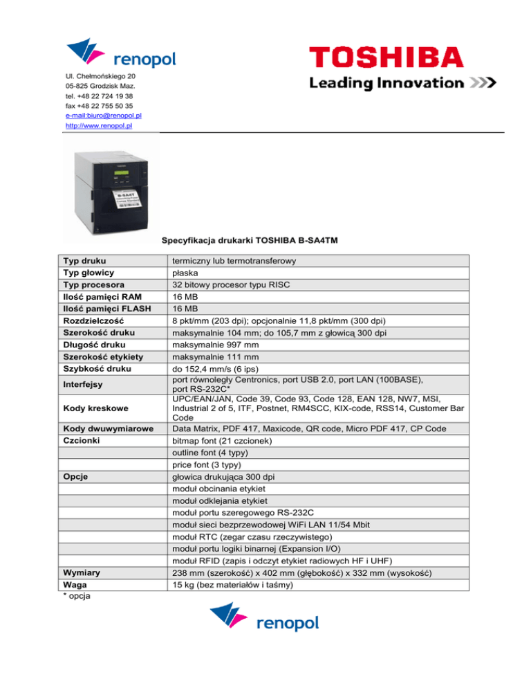Ul. Chełmońskiego 20 05-825 Grodzisk Maz. tel. +48 22 724 19 38 fax +48 22 755 50 35 e-mail:[email protected] http://www.renopol.pl Specyfikacja drukarki TOSHIBA B-SA4TM Typ druku Typ głowicy Typ procesora Ilość pamięci RAM Ilość pamięci FLASH Rozdzielczość Szerokość druku Długość druku Szerokość etykiety Szybkość druku Interfejsy Kody kreskowe Kody dwuwymiarowe Czcionki Opcje Wymiary Waga * opcja termiczny lub termotransferowy płaska 32 bitowy procesor typu RISC 16 MB 16 MB 8 pkt/mm (203 dpi); opcjonalnie 11,8 pkt/mm (300 dpi) maksymalnie 104 mm; do 105,7 mm z głowicą 300 dpi maksymalnie 997 mm maksymalnie 111 mm do 152,4 mm/s (6 ips) port równoległy Centronics, port USB 2.0, port LAN (100BASE), port RS-232C* UPC/EAN/JAN, Code 39, Code 93, Code 128, EAN 128, NW7, MSI, Industrial 2 of 5, ITF, Postnet, RM4SCC, KIX-code, RSS14, Customer Bar Code Data Matrix, PDF 417, Maxicode, QR code, Micro PDF 417, CP Code bitmap font (21 czcionek) outline font (4 typy) price font (3 typy) głowica drukująca 300 dpi moduł obcinania etykiet moduł odklejania etykiet moduł portu szeregowego RS-232C moduł sieci bezprzewodowej WiFi LAN 11/54 Mbit moduł RTC (zegar czasu rzeczywistego) moduł portu logiki binarnej (Expansion I/O) moduł RFID (zapis i odczyt etykiet radiowych HF i UHF) 238 mm (szerokość) x 402 mm (głębokość) x 332 mm (wysokość) 15 kg (bez materiałów i taśmy)