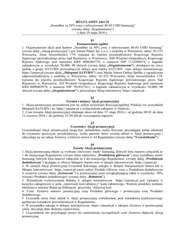 REGULAMIN AKCJI „Soundbar za 50% ceny z telewizorami 48-85 UHD Samsung” (zwany dalej „Regulaminem”) z dnia 19 maja 2016 r. §1 Postanowienia ogólne 1. Organizatorem akcji pod hasłem „Soundbar za 50% ceny z telewizorami 48-85 UHD Samsung” (zwana dalej „Akcją promocyjną”) jest Saturn Planet Sp. z o.o. z siedzibą w Warszawie, adres: 02-222 Warszawa, Aleje Jerozolimskie 179, wpisana do rejestru przedsiębiorców Krajowego Rejestru Sądowego prowadzonego przez Sąd Rejonowy w Warszawie, XIII Wydział Gospodarczy Krajowego Rejestru Sądowego pod numerem KRS 0000206770, o numerze NIP 1132490674, o kapitale zakładowym w wysokości 50.000, 00 złotych (zwana dalej „Organizatorem”), działająca na rzecz spółek z grupy SATURN prowadzących sklepy pod marką SATURN oraz sklepu internetowego https://saturn.pl (zwane dalej „Sklepami SATURN”) oraz Media Saturn Online Spółka z ograniczoną odpowiedzialnością z siedzibą w Warszawie, adres: 02-222 Warszawa, Aleje Jerozolimskie 179, wpisana do rejestru przedsiębiorców Krajowego Rejestru Sądowego prowadzonego przez Sąd Rejonowy w Warszawie, XII Wydział Gospodarczy Krajowego Rejestru Sądowego pod numerem KRS 0000403979, o numerze NIP 7010327611, o kapitale zakładowym w wysokości 50.000, 00 złotych (zwana dalej „Organizatorem”), prowadząca Sklep internetowy https://saturn.pl. §2 Termin i miejsce Akcji promocyjnej 1. Akcja promocyjna prowadzona jest na całym terytorium Rzeczypospolitej Polskiej we wszystkich Sklepach SATURN i na https://saturnt.pl z wyłączeniem zakupów w Outlecie. 2. Czas trwania Akcji promocyjnej obejmuje okres od dnia 19 maja 2016 r. od godziny 00:01 do dnia 12 czerwca 2016 r. do godziny 23:59 lub do wyczerpania zapasów. §3 Uczestnicy Akcji promocyjnej Uczestnikami Akcji promocyjnej mogą być: pełnoletnie osoby fizyczne, posiadające pełną zdolność do czynności prawnych, przedsiębiorcy, osoby prawne, które wezmą udział w Akcji promocyjnej i zdecydują się na zakup Zestawu, o którym mowa w §4 Regulaminu (zwane dalej "Uczestnikami"). §4 Zasady Akcji promocyjnej 1.Akcją promocyjną objęte są wybrane telewizory marki Samsung, których lista stanowi załącznik nr 1 do niniejszego Regulaminu (zwane dalej oddzielnie „Produktem głównym”) oraz soundbary marki Samsung, których lista stanowi załącznik nr 2 do niniejszego Regulaminu (zwany dalej „Produktem dodatkowym”) dostępne w ofercie Sklepów Saturn oraz w sklepie internetowym https://saturn.pl. 2. W ramach Akcji promocyjnej Uczestnik dokonując zakupu w Sklepie Stacjonarnym Saturn lub w Sklepie Internetowym https://saturn.pl może nabyć Produkt Główny wraz z Produktem dodatkowym w zestawie (zwany dalej „Zestawem”) w promocyjnej cenie uwzględniającej rabat w wysokości 50% wartości Produktu dodatkowego1 (zwany dalej „Rabatem”), 3. Warunkiem wykorzystania Rabatu w sklepie internetowym https://saturnt.pl jest wpisanie w koszyku zakupowym w polu „wprowadź kod rabatowy” kodu rabatowego. Wartość produktu zostanie obniżona o należny Rabat po kliknięciu przycisku ‘Aktywuj kod. 4. Cena: Zestawu stanowi promocyjną cenę Produktu głównego i promocyjną cenę Produktu dodatkowego. 5. Uczestnik może brać udział w Akcji promocyjnej wielokrotnie, pod warunkiem każdorazowego spełnienia warunków przewidzianych w Regulaminie. 6. W przypadku zakupu w sklepie internetowym https://saturnt.pl o zakupie Zestawu w promocyjnej cenie decyduje data złożenia zamówienia. 7. Uczestnikom nie przysługuje prawo do zastrzeżenia szczególnych cech Zestawu objętych Akcją promocyjną. 8. Rabat odliczany jest od ceny brutto towaru i będzie naliczany jednorazowo. Rabaty nie mogą być dzielone. 9. Uczestnikom Akcji promocyjnej nie przysługuje prawo do otrzymania ekwiwalentu pieniężnego w wysokości Rabatu. 10. Akcja promocyjna nie może być łączona z innymi Akcjami promocyjnymi, w tym kodami rabatowymi otrzymanymi w ramach programu Konto Premium §5 Odpowiedzialność 1. Odpowiedzialność Organizatora wobec Uczestnika z tytułu roszczeń związanych z uprawnieniami przyznanymi Uczestnikowi w Regulaminie ograniczona jest do wysokości ceny Zestawu1, Zestawu2, Zestawu3, w trakcie Akcji promocyjnej, którego to roszczenie dotyczy. 2. Powyższe ograniczenie nie wyłącza uprawnień przyznanych Uczestnikom na mocy odrębnych przepisów prawnych. §6 Reklamacje i wymiana towarów 1. Reklamacje Uczestników dotyczące sposobu przeprowadzenia Akcji promocyjnej powinny być zgłaszane w trakcie trwania Akcji promocyjnej oraz przez 21 (dwadzieścia jeden) dni od jej zakończenia w Sklepie Saturn, w którym Uczestnik dokonał zakupu Zestawu, lub pod adresem email: [email protected] z tematem wiadomości "Reklamacja – Soundbar za 50% ceny z telewizorami 48-85 UHD Samsung” lub pod numerem Infolinii : 799 37 37 37 * (* opłata zgodnie z taryfą operatora). 2. Reklamacje składane w formie pisemnej w Sklepie SATURN, w którym dokonano zakupu Zestawu powinny zawierać dopisek „Soundbar za 50% ceny z telewizorami 48-85 UHD Samsung” oraz powinny zawierać imię i nazwisko Uczestnika, Jego adres zamieszkania, kopię dowodu zakupu oraz dokładny opis stanu faktycznego będącego przyczyną złożenia reklamacji. 3. Postępowanie reklamacyjne, o którym mowa w §6 ust. 1 i 2 Regulaminu, trwa 14 (czternaście) dni od daty wpłynięcia reklamacji. Uczestnik zostanie powiadomiony o rozpatrzeniu reklamacji przez Organizatora listem poleconym wysłanym na adres wskazany przez Uczestnika, telefonicznie lub za pośrednictwem drogi elektronicznej w zależności od formy, w jakiej Uczestnik złożył reklamację. Po wyczerpaniu postępowania reklamacyjnego Uczestnik jest uprawniony do dochodzenia swoich roszczeń na drodze postępowania sądowego. 4. Organizator nie ponosi odpowiedzialności za zmianę miejsca zamieszkania lub zmianę podanego przez Uczestnika adresu do korespondencji, jak również za zmiany innych da