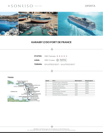OFERTA KARAIBY Z/DO FORT DE FRANCE STATEK: MSC Fantasia LINIA: MSC Cruises TERMIN: 09 LUTEGO 2017 – 16 LUTEGO 2017 TRASA Dzień 1 2 3 4 5 6 7 8 Port Fort de France, Martynika Pointe-a-Pitre, Gwadelupa Castries, Saint Lucia Bridgetown, Barbados Port of Spain Saint George, Grenada Roseau, Dominica Fort de France, Martynika Wpłynięcie 8:00 9:00 8:00 9:00 9:00 9:00 8:00 SONRISO | Lipiński Passage | Al. Jero zo limskie 61 | 00-697 Warszawa tel. +48 22 206 45 00 | fax. +48 22 100 14 61 | e-mail: biuro @so nriso .pl | web: www.so nriso .pl Wypłynięcie 23:00 19:00 18:00 20:00 18:00 18:00 18:00 - OFERTA CENA Typ kabiny Cena z osobę CENA ZAWIERA DOTATKOWE OPŁATY zakwaterowanie w 2 - os. kabinie wybranej kategorii pełne wyżywienie: 3 posiłki, przekąski między posiłakmi, bufet o północy napoje: woda stołowa, kawa, herbata oraz sok do śniadania dostępne 24 h w restauracji bufetowej oraz w restauracji głównej wyłącznie podczas śniadań serwis bagażowy podczas wejścia i zejścia ze statku 24 godzinny serwis kabinowy korzystanie z urządzeń sportowo - rekreacyjnych dostępnych na pokładzie (baseny, jacuzzi, boiska sportowe, kluby dla dzieci i młodzieży itp.) udział we wszystkich imprezach organizowanych na pokładzie (przedstawienia, pokazy, aukcje, animacje i inne) dojazd/przelot do portu rozpoczęcia i zakończenia rejsu transfery (lotnisko - port - lotnisko) ewentualne noclegi przed lub po rejsie wycieczki fakultatywne napoje: bezalkoholowe, alkoholowe, woda mineralna dostępne w restauracjach i barach (istnieje możliwość wykupienia pakietów napojów, o szczegóły zapytaj w biurze) korzystanie z mini baru w kabinie korzystanie z usług typu: SPA, salon piękności, pralnia itp. wydatki osobiste tj. zakupy w butikach, internet, kasyno itp. obowiązkowe opłaty portowe obowiązkowa opłata serwisowa (napiwki dla obsługi statku ok.8,5 EUR/os. dorosła/dzień, dzieci poniżej 3 lat nie płacą) obowiązkowe ubezpieczenie turystyczne koszt wymaganych wiz ewentualna opłata paliwowa (linia w momencie wzrotu cen ropy zastrzega sobie prawo do dodania oplaty paliwowej do każdej rezerwacji) Na życzenie świadczymy dodatkowo usługi: rezerwacje hotelowe na całym świecie rezerwacje biletów lotniczych, trasferów oraz parkingu w porcie rezerwacje wycieczek fakultatywnych i innych atrakcji SONRISO | Lipiński Passage | Al. Jero zo limskie 61 | 00-697 Warszawa tel. +48 22 206 45 00 | fax. +48 22 100 14 61 | e-mail: biuro @so nriso .pl | web: www.so nriso .pl