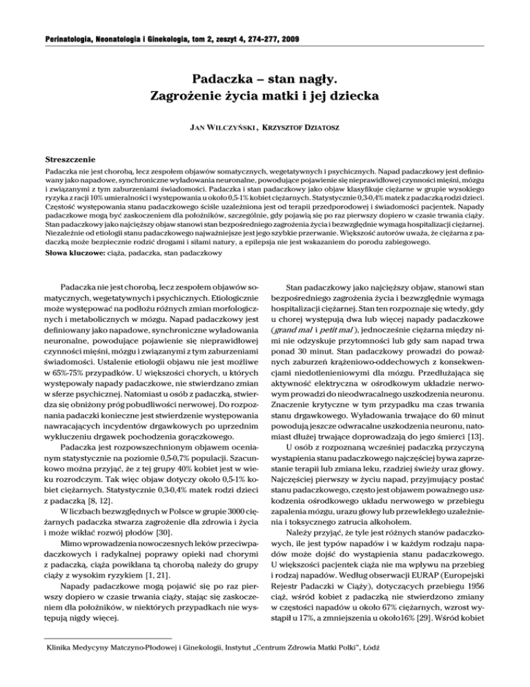 Perinatologia, Neonatologia i Ginekologia, tom 2, zeszyt 4, 274-277, 2009 Padaczka – stan nagły. Zagrożenie życia matki i jej dziecka JAN WILCZYŃSKI , KRZYSZTOF DZIATOSZ Streszczenie Padaczka nie jest chorobą, lecz zespołem objawów somatycznych, wegetatywnych i psychicznych. Napad padaczkowy jest definiowany jako napadowe, synchroniczne wyładowania neuronalne, powodujące pojawienie się nieprawidłowej czynności mięśni, mózgu i związanymi z tym zaburzeniami świadomości. Padaczka i stan padaczkowy jako objaw klasyfikuje ciężarne w grupie wysokiego ryzyka z racji 10% umieralności i występowania u około 0,5-1% kobiet ciężarnych. Statystycznie 0,3-0,4% matek z padaczką rodzi dzieci. Częstość występowania stanu padaczkowego ściśle uzależniona jest od terapii przedporodowej i świadomości pacjentek. Napady padaczkowe mogą być zaskoczeniem dla położników, szczególnie, gdy pojawią się po raz pierwszy dopiero w czasie trwania ciąży. Stan padaczkowy jako najcięższy objaw stanowi stan bezpośredniego zagrożenia życia i bezwzględnie wymaga hospitalizacji ciężarnej. Niezależnie od etiologii stanu padaczkowego najważniejsze jest jego szybkie przerwanie. Większość autorów uważa, że ciężarna z padaczką może bezpiecznie rodzić drogami i siłami natury, a epilepsja nie jest wskazaniem do porodu zabiegowego. Słowa kluczowe: ciąża, padaczka, stan padaczkowy Padaczka nie jest chorobą, lecz zespołem objawów somatycznych, wegetatywnych i psychicznych. Etiologicznie może występować na podłożu różnych zmian morfologicznych i metabolicznych w mózgu. Napad padaczkowy jest definiowany jako napadowe, synchroniczne wyładowania neuronalne, powodujące pojawienie się nieprawidłowej czynności mięśni, mózgu i związanymi z tym zaburzeniami świadomości. Ustalenie etiologii objawu nie jest możliwe w 65%-75% przypadków. U większości chorych, u których występowały napady padaczkowe, nie stwierdzano zmian w sferze psychicznej. Natomiast u osób z padaczką, stwierdza się obniżony próg pobudliwości nerwowej. Do rozpoznania padaczki konieczne jest stwierdzenie występowania nawracających incydentów drgawkowych po uprzednim wykluczeniu drgawek pochodzenia gorączkowego. Padaczka jest rozpowszechnionym objawem ocenianym statystycznie na poziomie 0,5-0,7% populacji. Szacunkowo można przyjąć, że z tej grupy 40% kobiet jest w wieku rozrodczym. Tak więc objaw dotyczy około 0,5-1% kobiet ciężarnych. Statystycznie 0,3-0,4% matek rodzi dzieci z padaczką [8, 12]. W liczbach bezwzględnych w Polsce w grupie 3000 ciężarnych padaczka stwarza zagrożenie dla zdrowia i życia i może wikłać rozwój płodów [30]. Mimo wprowadzenia nowoczesnych leków przeciwpadaczkowych i radykalnej poprawy opieki nad chorymi z padaczką, ciąża powikłana tą chorobą należy do grupy ciąży z wysokim ryzykiem [1, 21]. Napady padaczkowe mogą pojawić się po raz pierwszy dopiero w czasie trwania ciąży, stając się zaskoczeniem dla położników, w niektórych przypadkach nie występują nigdy więcej. Stan padaczkowy jako najcięższy objaw, stanowi stan bezpośredniego zagrożenia życia i bezwzględnie wymaga hospitalizacji ciężarnej. Stan ten rozpoznaje się wtedy, gdy u chorej występują dwa lub więcej napady padaczkowe (grand mal i petit mal ), jednocześnie ciężarna między nimi nie odzyskuje przytomności lub gdy sam napad trwa ponad 30 minut. Stan padaczkowy prowadzi do poważnych zaburzeń krążeniowo-oddechowych z konsekwencjami niedotlenieniowymi dla mózgu. Przedłużająca się aktywność elektryczna w ośrodkowym układzie nerwowym prowadzi do nieodwracalnego uszkodzenia neuronu. Znaczenie krytyczne w tym przypadku ma czas trwania stanu drgawkowego. Wyładowania trwające do 60 minut powodują jeszcze odwracalne uszkodzenia neuronu, natomiast dłużej trwające doprowadzają do jego śmierci [13]. U osób z rozpoznaną wcześniej padaczką przyczyną wystąpienia stanu padaczkowego najczęściej bywa zaprzestanie terapii lub zmiana leku, rzadziej świeży uraz głowy. Najczęściej pierwszy w życiu napad, przyjmujący postać stanu padaczkowego, często jest objawem poważnego uszkodzenia ośrodkowego układu nerwowego w przebiegu zapalenia mózgu, urazu głowy lub przewlekłego uzależnienia i toksycznego zatrucia alkoholem. Należy przyjąć, że tyle jest różnych stanów padaczkowych, ile jest typów napadów i w każdym rodzaju napadów może dojść do wystąpienia stanu padaczkowego. U większości pacjentek ciąża nie ma wpływu na przebieg i rodzaj napadów. Według obserwacji EURAP (Europejski Rejestr Padaczki w Ciąży), dotyczących przebiegu 1956 ciąż, wśród kobiet z padaczką nie stwierdzono zmiany w częstości napadów u około 67% ciężarnych, wzrost wystąpił u 17%, a zmniejszenia u około16% [29]. Wśród kobiet Klinika Medycyny Matczyno-Płodowej i Ginekologii, Instytut „Centrum Zdrowia Matki Polki”, Łódź Padaczka – stan nagły. Zagrożenie życia matki i jej dziecka z epilepsją leczonych w Instytucie Centrum Zdrowia Matki Polki w Łodzi u 10% spośród nich częstość napadów zmniejszyła się, w 73,35% nie uległa zmianie, a w 16,7% wzrosła [30]. Najczęściej występują uogólnione drgawkowe stany padaczkowe. Jest to najbardziej niebezpieczny typ stanu padaczkowego, gdyż jest on związany z bezdechem u ciężarnych. Powtarzające się okresy niedotlenienia płodu w wyniku napadu padaczkowego mają istotny wpływ na zaburzenia rozwojowe płodu. W trakcie trwania napadu padaczkowego możliwe jest wystąpienie u kobiety urazu mechanicznego, a nawet jej nienarodzonego dziecka [4]. Napady drgawek są przyczyną kwasicy mleczanowej u ciężarnej [16]. Kwas mlekowy na drodze transportu łożyskowego dociera do płodu [10]. W trakcie napadu należy liczyć się z zaburzeniami czynności serca płodu, bradykardią z następowym obumarciem wewnątrzmacicznym płodu [4, 26, 27, 29]. W