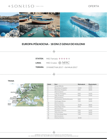 OFERTA EUROPA PÓŁNOCNA - 18 DNI Z GENUI DO KILONII STATEK: MSC Fantasia LINIA: MSC Cruises TERMIN: 19 KWIETNIA 2017 – 06 MAJA 2017 TRASA Dzień 1 2 3 4 5 6 7 8 9 10 11 12 13 14 15 16 17 18 Port Genua, Włochy Barcelona, Hiszpania Walencja, Hiszpania dzień na morzu Lizbona, Portugalia Vigo, Hiszpania dzień na morzu Southampton, Wielka Brytania Zeebrugge, Belgia dzień na morzu Kilonia, Niemcy Kopenhaga, Dania dzień na morzu Sztokholm, Szwecja Tallin, Estonia St. Petersburg, Rosja dzień na morzu Kilonia, Niemcy Wpłynięcie 13:00 8:00 8:00 8:00 8:00 9:00 10:00 8:00 9:00 9:00 7:00 10:00 SONRISO | Lipiński Passage | Al. Jero zo limskie 61 | 00-697 Warszawa tel. +48 22 206 45 00 | fax. +48 22 100 14 61 | e-mail: biuro @so nriso .pl | web: www.so nriso .pl Wypłynięcie 17:00 22:00 18:00 16:00 15:00 18:00 16:00 18:00 17:00 16:00 16:00 19:00 - OFERTA CENA Typ kabiny Cena z osobę CENA ZAWIERA DOTATKOWE OPŁATY zakwaterowanie w 2 - os. kabinie wybranej kategorii pełne wyżywienie: 3 posiłki, przekąski między posiłakmi, bufet o północy napoje: woda stołowa, kawa, herbata oraz sok do śniadania dostępne 24 h w restauracji bufetowej oraz w restauracji głównej wyłącznie podczas śniadań serwis bagażowy podczas wejścia i zejścia ze statku 24 godzinny serwis kabinowy korzystanie z urządzeń sportowo - rekreacyjnych dostępnych na pokładzie (baseny, jacuzzi, boiska sportowe, kluby dla dzieci i młodzieży itp.) udział we wszystkich imprezach organizowanych na pokładzie (przedstawienia, pokazy, aukcje, animacje i inne) dojazd/przelot do portu rozpoczęcia i zakończenia rejsu transfery (lotnisko - port - lotnisko) ewentualne noclegi przed lub po rejsie wycieczki fakultatywne napoje: bezalkoholowe, alkoholowe, woda mineralna dostępne w restauracjach i barach (istnieje możliwość wykupienia pakietów napojów, o szczegóły zapytaj w biurze) korzystanie z mini baru w kabinie korzystanie z usług typu: SPA, salon piękności, pralnia itp. wydatki osobiste tj. zakupy w butikach, internet, kasyno itp. obowiązkowe opłaty portowe obowiązkowa opłata serwisowa (napiwki dla obsługi statku ok.8,5 EUR/os. dorosła/dzień, dzieci poniżej 3 lat nie płacą) obowiązkowe ubezpieczenie turystyczne koszt wymaganych wiz ewentualna opłata paliwowa (linia w momencie wzrotu cen ropy zastrzega sobie prawo do dodania oplaty paliwowej do każdej rezerwacji) Na życzenie świadczymy dodatkowo usługi: rezerwacje hotelowe na całym świecie rezerwacje biletów lotniczych, trasferów oraz parkingu w porcie rezerwacje wycieczek fakultatywnych i innych atrakcji SONRISO | Lipiński Passage | Al. Jero zo limskie 61 | 00-697 Warszawa tel. +48 22 206 45 00 | fax. +48 22 100 14 61 | e-mail: biuro @so nriso .pl | web: www.so nriso .pl