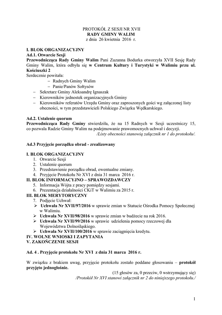 PROTOKÓŁ Z SESJI NR XVII RADY GMINY WALIM z dnia 26 kwietnia 2016 r. I. BLOK ORGANIZACYJNY Ad.1. Otwarcie Sesji Przewodnicząca Rady Gminy Walim Pani Zuzanna Bodurka otworzyła XVII Sesję Rady Gminy Walim, która odbyła się w Centrum Kultury i Turystyki w Walimiu przu ul. Kościuszki 2 Serdecznie powitała: − Radnych Gminy Walim − Panie/Panów Sołtysów − Sekretarz Gminy Aleksandrę Ignaszak − Kierowników jednostek organizacyjnych Gminy − Kierowników referatów Urzędu Gminy oraz zaproszonych gości wg załączonej listy obecności, w tym przedstawicieli Polskiego Związku Wędkarskiego. Ad.2. Ustalenie quorum Przewodnicząca Rady Gminy stwierdziła, że na 15 Radnych w Sesji uczestniczy 15, co pozwala Radzie Gminy Walim na podejmowanie prawomocnych uchwał i decyzji. /Listy obecności stanowią załącznik nr 1 do protokołu/. Ad.3 Przyjęcie porządku obrad - zrealizowany I. BLOK ORGANIZACYJNY 1. Otwarcie Sesji 2. Ustalenie quorum 3. Przedstawienie porządku obrad, ewentualne zmiany. 4. Przyjęcie Protokołu Nr XVI z dnia 31 marca 2016 r. II. BLOK INFORMACYJNO – SPRAWOZDAWCZY 5. Informacja Wójta z pracy pomiędzy sesjami. 6. Prezentacja działalności CKiT w Walimiu za 2015 r. III. BLOK MERYTORYCZNY 7. Podjęcie Uchwał: Uchwała Nr XVII/97/2016 w sprawie zmian w Statucie Ośrodka Pomocy Społecznej w Walimiu. Uchwała Nr XVII/98/2016 w sprawie zmian w budżecie na rok 2016. Uchwala Nr XVII/99/2016 w sprawie udzielenia pomocy rzeczowej dla Województwa Dolnośląskiego. Uchwała Nr XVII/100/2016 w sprawie zaciągnięcia kredytu. IV. WOLNE WNIOSKI I ZAPYTANIA V. ZAKOŃCZENIE SESJI Ad. 4 . Przyjęcie protokołu Nr XVI z dnia 31 marca 2016 r. W związku z brakiem uwag, przyjęcie protokołu zostało poddane głosowaniu – protokół przyjęto jednogłośnie. (15 głosów za, 0 przeciw, 0 wstrzymujący się) /Protokół Nr XVI stanowi załącznik nr 2 do niniejszego protokołu./ 1 Ad. 5 Informacja Wójta z pracy pomiędzy sesjami – zrealizowany. Ze względu na brak pytań, Przewodnicząca Rady Gminy zaproponowała przejście do dalszego porządku obrad. /Informacja Wójta z pracy pomiędzy sesjami stanowi załącznik nr 3 do protokołu/. Ad. 6. Prezentacja działalności CKiT w Walimiu za 2015 r. Dyrektor CKiT w Walimiu Paweł Brzozowski przedstawił prezentację działalności Centrum Kultury i Turystyki w Walimiu. Przewodnicząca Rady Gminy Zuzanna Bodurka zapytała, od kiedy funkcjonuje forma lekcji dla młodzieży. Dyrektor CKiT wyjaśnił, że produkt funkcjonuje od lutego ubiegłego roku. Ciągle jest dopracowywany i dostosowany do potrzeb danej grupy. Nazywa się „Historia na wyciągnięcie ręki”. Projekt promowany jest wśród dolnośląskich szkół. Radny Łukasz Kazek poprosił o wyjaśnienie na czym będzie polegać projekt audioprzewodników. Dyrektor CKiT wyjaśnił, że urządzenia te są testowane w Sztolniach Walimskich. Jest to rozwiązanie dla turystów obcojęzycznych. Obecnie testowany jest język angielski, ale można będzie to rozbudowywać. Przewodnicząca Rady Gminy Zuzanna Bodurka zapytała, dlaczego w tym roku planowany jest tylko jeden dzień drezynowania. Dyrektor CKiT wyjaśnił, że impreza będzie trwała dwa dni, jednak tylko jeden dzień obsługiwana będzie przez CKiT, za organizację drugiego dnia odpowiedzialne będzie Sowiogórskie Bractwo Kolejowe. W dalszej części dyskusji poruszony został temat wzrostu liczby turystów, który pozytywnie wpłynął na gospodarkę finansową jednostki. Radny Stanisław Kręciproch poruszył temat oznakowania szlaku martyrologii z Zagórza śląskiego do Jugowic, podkreślając, iż w zamiarze było ukazanie historii wsi Jugowice. Poinformował, że 8 maja, wspólnie z radą sołecką planują marsz pokoju, głównym zamiarem jest mobilizowanie lokalnej społeczności do podejmowania działania na rzecz wsi. Podkreślił, że współpraca z Panem Dyrektorem i jednostką CKiT układa się bardzo dobrze. Dyrektor CKiT podziękował za współpracę swoim pracownikom. Ze względu na brak pytań, Przewodnicząca Rady Gminy zaproponowała przejście do dalszego porządku obrad. /Sprawozdanie stanowi załącznik nr 4 do protokołu/. 2 III. BLOK MERYTORYCZNY Ad. 7. Podjecie Uchwał: Uchwała Nr XVII/97/2016 w sprawie zmian w Statucie Ośrodka Pomocy Społecznej w Walimiu. Przewodnicząca Komisji ZPSRLGŻiOŚ Monika Pakuła wyjaśniła, że potrzeba zmiany Statutu Ośrodka Pomocy Społecznej w Walimiu pojawiła się wraz z nowymi zadaniami w postaci realizacji ustawy o pomocy państwa w wychowaniu dzieci. Zmianie ulega § 6 Statutu, który otrzymuje brzmienie: Do zadań Ośrodka należy w szczególności: 1. Realizacja ustawy o pomocy społecznej, 2. Realizacja ustawy o pomocy państwa w wychowaniu dzieci, 3. Realizacja ustawy o systemie ubezpieczeń społecznych, 4. Realizacja ustawy o powszechnym ubezpieczeniu zdrowotnym, 5. Realizacja ustawy o świadczeniach rodzinnych, 6. Realizacja innych zadań zgodnie z obowiązującymi przepisami prawa. Komisja przyjęła projekt uchwały jednogłośnie. W związku z brakiem pytań, uchwała została odczytana, a następnie została poddana pod głosowanie. Uchwała Nr XVII/97/2016 w sprawie zmian w Statucie Ośrodka Pomocy Społecznej w Walimiu została przyjęta jednogłośnie (15 głosów za, 0 przeciw, 0 wstrzymujących się). /Stanowi załącznik nr 5 do protokołu/. Uchwała Nr XVII/98/2016 w sprawie zmian w budżecie na rok 2016. Przewodniczący Komisji RGBiF Andrzej Pol wyjaśnił, że w paragrafie 1 uchwały zawarto zmiany w planowanych dochodach. I tak: - zwiększone dochody z tytułu subwencji oświatowej kwota 3.461,-zł, - zwiększenie z tytułu odszkodowania za przejęcie gruntów gminy Walim kwota 72.000,zł. Razem zwiększenie dochodów kwota 75.461,-zł. Paragraf 2 uchwały to zmiany w planowanych wydatkach: - zwiększono wydatki na drogi publiczne wojewódzkie kwota 25.000,-zł, - zmniejszono wydatki na drogi publiczne powiatowe kwota