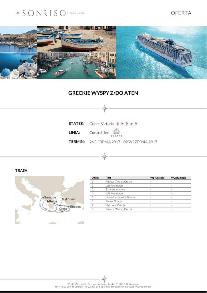 OFERTA GRECKIE WYSPY Z/DO ATEN STATEK: Queen Victoria LINIA: Cunard Line TERMIN: 26 SIERPNIA 2017 – 02 WRZEŚNIA 2017 TRASA Dzień 1 2 3 4 5 6 7 8 Port Piraeus (Ateny), Grecja dzień na morzu Sarande, Albania dzień na morzu Heraklion (Kreta), Grecja Rodos, Grecja Mykonos, Grecja Piraeus (Ateny), Grecja Wpłynięcie - SONRISO | Lipiński Passage | Al. Jero zo limskie 61 | 00-697 Warszawa tel. +48 22 206 45 00 | fax. +48 22 100 14 61 | e-mail: biuro @so nriso .pl | web: www.so nriso .pl Wypłynięcie - OFERTA CENA Typ kabiny Kabina wewnętrzna Cena z osobę od 999 EUR Kabina z oknem od 1 099 EUR Kabina z balkonem od 1 299 EUR Princess Grill Suite od 1 999 EUR Queens Grill Suite od 2 299 EUR Master suite od 2 999 EUR Grand Suite od 3 499 EUR CENA ZAWIERA DOTATKOWE OPŁATY zakwaterowanie w 2 - os. kabinie wybranej kategorii pełne wyżywienie: 3 posiłki, przekąski między posiłakmi, bufet o północy napoje do posiłków: woda stołowa, kawa, herbata oraz sok do śniadania serwis bagażowy podczas wejścia i zejścia ze statku 24 godzinny serwis kabinowy korzystanie z urządzeń sportowo - rekreacyjnych dostępnych na pokładzie (baseny, jacuzzi, boiska sportowe itp.) udział we wszystkich imprezach organizowanych na pokładzie (przedstawienia, pokazy, aukcje, animacje i inne) obowiązkowe opłaty portowe dojazd/przelot do portu rozpoczęcia i zakończenia rejsu transfery (lotnisko - port - lotnisko) ewentulne noclegi przed lub po rejsie wycieczki fakultatywne napoje: bezalkoholowe, alkoholowe, woda mineralna dostępne w restauracjach i barach korzystanie z mini baru w kabinie korzystanie z usług typu: SPA, salon piękności, pralnia itp. wydatki osobiste tj. zakupy w butikach, internet, kasyno itp. obowiązkowa opłata serwisowa (napiwki dla obsługi statku ok. 12 USD/os. dorosła/dzień) obowiązkowe ubezpieczenie turystyczne koszt wymaganych wiz ewentualna opłata paliwowa (linia w momencie wzrotu cen ropy zastrzega sobie prawo do dodania oplaty paliwowej do każdej rezerwacji) Na życzenie świadczymy dodatkowo usługi: rezerwacje hotelowe na całym świecie rezerwacje biletów lotniczych, trasferów oraz parkingu w porcie rezerwacje wycieczek fakultatywnych i innych atrakcji SONRISO | Lipiński Passage | Al. Jero zo limskie 61 | 00-697 Warszawa tel. +48 22 206 45 00 | fax. +48 22 100 14 61 | e-mail: biuro @so nriso .pl | web: www.so nriso .pl