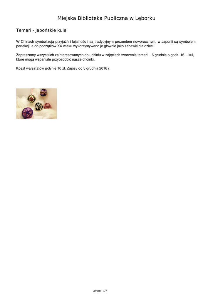 Miejska Biblioteka Publiczna w Lęborku Temari - japońskie kule W Chinach symbolizują przyjaźń i lojalnośc i są tradycyjnym prezentem noworocznym, w Japonii są symbolem perfekcji, a do początków XX wieku wykorzystywano je głównie jako zabawki dla dzieci. Zapraszamy wszystkich zainteresowanych do udziału w zajęciach tworzenia temari - 6 grudnia o godz. 16. - kul, które mogą wspaniale przyozdobić nasze choinki. Koszt warsztatów jedynie 10 zł. Zapisy do 5 grudnia 2016 r. strona 1/1 Powered by TCPDF (www.tcpdf.org)
