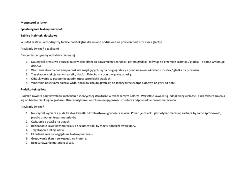 Montessori w lutym Spostrzeganie faktury materiału Tablice i tabliczki dotykowe W skład zestawu wchodzą trzy tablice prostokątne drewniane podzielone na powierzchnie szorstkie i gładkie. Przykłady ćwiczeń z tablicami Ćwiczenia zaczynamy od tablicy pierwszej 1. Nauczyciel przesuwa opuszki palców całej dłoni po powierzchni szorstkiej, potem gładkiej, mówiąc na przemian szorstka / gładka. To samo wykonuje dziecko. 2. Wodzenie dwoma palcami po paskach znajdujących się na drugiej tablicy z powtarzaniem określeń szorstka / gładka na przemian. 3. Trzyetapowa lekcja nazw (szorstki, gładki). Dziecko ma oczy związane opaską. 4. Odszukiwanie w otoczeniu przedmiotów szorstkich i gładkich. 5. Wodzenie opuszkami palców wzdłuż pasków znajdujących się na tablicy trzeciej oraz pionowo od góry do dołu. Pudełko tekstyliów Pudełko zawiera pary kawałków materiału o identycznej strukturze w takim samym kolorze. Wszystkie kawałki są jednakowej wielkości, a ich faktura zmienia się od bardzo cienkiej do grubszej. Dzieci dotykiem i wzrokiem mogą poznać strukturę i odpowiednie nazwy materiałów. Przykłady ćwiczeń 1. Nauczyciel wybiera z pudełka dwa kawałki o kontrastowej grubości i splocie. Pokazuje dziecku jak dotykać materiał, zachęca by samo spróbowało, prosi o utworzenie par materiałów. 2. Ćwiczenia z opaską na oczach. 3. Rozkładanie kawałków materiału dzieciom w sali, by mogły odnaleźć swoje pary. 4. Trzyetapowe lekcje nazw. 5. Układanie serii ze względu na fakturę materiału. 6. Grupowanie tkanin ze względu na kryteria. 7. Rozpoznawanie materiału w sali.