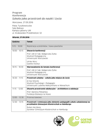 Program Konferencja Szkoła jako przestrzeń do nauki i życia Warszawa, 27.09.2016 Pałac Tyszkiewiczów Sala Balowa Kampus główny UW ul. Krakowskie Przedmieście 32 Wtorek, 27.09.2016 Godzina Temat 9:15 – 10:00 Rejestracja uczestników / kawa powitalna 10:00 – 10:15 Otwarcie konferencji Prof. UW dr hab. Małgorzata Żytko Wydział Pedagogiczny Uniwersytet Warszawski Ulrike Würz Goethe-Institut 10:15 – 10:30 Wprowadzenie do tematu konferencji Prof. UW dr hab. Małgorzata Żytko Wydział Pedagogiczny Uniwersytet Warszawski 10:30 – 11:15 Przestrzeń szkolna – szkoła jako miejsce do życia dr Kai Nitsche Wydział Psychologii i Pedagogiki Uniwersytet Ludwika Maksymiliana w Monachium 11:15 – 12:00 Otwarte przestrzenie edukacyjne – architektura a edukacja Prof. Marlena Plebańska Fundacja Edukacja na Nowo 12:00 – 12:30 Przerwa kawowa 12:30 – 13:15 Przestrzeń i rytmizacja jako elementy pedagogiki szkoły całodziennej na przykładzie Gimnazjum Klosterschule w Hamburgu Ruben Herzberg Dyrektor Gimnazjum Klosterschule w Hamburgu 13:15 – 13:45 Organizacja przestrzeni w klasie do nauki języka obcego – doświadczenia z projektu „Niemiecki ma klasę” Ewa Dorota Ostaszewska Goethe-Institut 13:45 – 14:15 Kształtowanie przestrzeni uczenia się w Warszawie Joanna Gospodarczyk Biuro Edukacji m.st. Warszawy 14:15 – 15:15 Przerwa obiadowa 15:15 – 16:15 Dyskusja panelowa: Czy dzisiejsza szkoła potrzebuje zmian w aranżacji przestrzeni? Rafał Otręba Dyrektor ZSO nr 3 w Rudzie Śląskiej Dorota Niewiadomska Nauczycielka języka niemieckiego – laureatka konkursu „Niemiecki ma klasę” mgr. inż. arch. Grzegorz Wronowski Prof. UW dr hab. Przemysław Gębal Wydział Lingwistyki Stosowanej Uniwersytet Warszawski Anna Wręga Architekt wnętrz Moderacja: Prof. UW dr hab. Małgorzata Żytko, Ewa Dorota Ostaszewska 16:15 – 16:30 Zamknięcie konferencji Ulrike Würz Goethe-Institut Prof. UW dr hab. Małgorzata Żytko Wydział Pedagogiczny UW