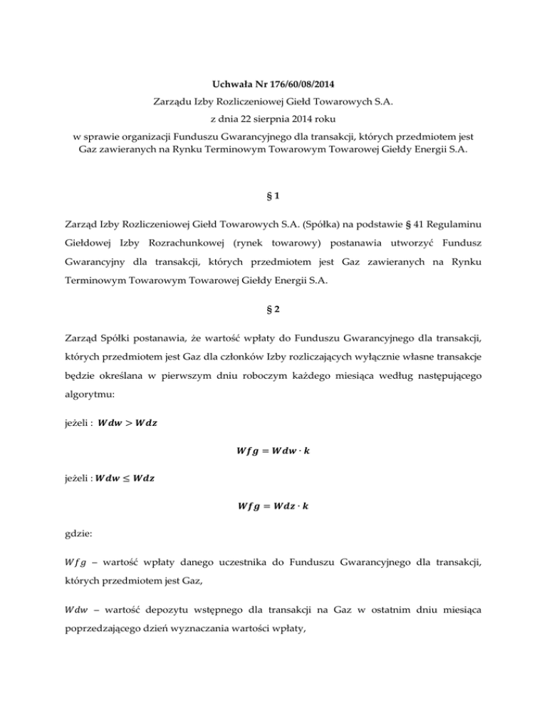 Uchwała Nr 176/60/08/2014 Zarządu Izby Rozliczeniowej Giełd Towarowych S.A. z dnia 22 sierpnia 2014 roku w sprawie organizacji Funduszu Gwarancyjnego dla transakcji, których przedmiotem jest Gaz zawieranych na Rynku Terminowym Towarowym Towarowej Giełdy Energii S.A. §1 Zarząd Izby Rozliczeniowej Giełd Towarowych S.A. (Spółka) na podstawie § 41 Regulaminu Giełdowej Izby Rozrachunkowej (rynek towarowy) postanawia utworzyć Fundusz Gwarancyjny dla transakcji, których przedmiotem jest Gaz zawieranych na Rynku Terminowym Towarowym Towarowej Giełdy Energii S.A. §2 Zarząd Spółki postanawia, że wartość wpłaty do Funduszu Gwarancyjnego dla transakcji, których przedmiotem jest Gaz dla członków Izby rozliczających wyłącznie własne transakcje będzie określana w pierwszym dniu roboczym każdego miesiąca według następującego algorytmu: jeżeli : 𝑾𝒅𝒘 > 𝑾𝒅𝒛 𝑾𝒇𝒈 = 𝑾𝒅𝒘 ∙ 𝒌 jeżeli : 𝑾𝒅𝒘 ≤ 𝑾𝒅𝒛 𝑾𝒇𝒈 = 𝑾𝒅𝒛 ∙ 𝒌 gdzie: 𝑊𝑓𝑔 – wartość wpłaty danego uczestnika do Funduszu Gwarancyjnego dla transakcji, których przedmiotem jest Gaz, 𝑊𝑑𝑤 – wartość depozytu wstępnego dla transakcji na Gaz w ostatnim dniu miesiąca poprzedzającego dzień wyznaczania wartości wpłaty, 𝑊𝑑𝑧 - wartość depozytu zabezpieczającego dla transakcji na Gaz w ostatnim dniu miesiąca poprzedzającego dzień wyznaczania wartości wpłaty, 𝑘 – mnożnik Funduszu Gwarancyjnego dla transakcji, których przedmiotem jest Gaz ustalany Uchwałą Zarządu IRGiT. Wartość wpłaty do Funduszu Gwarancyjnego dla transakcji, których przedmiotem jest Gaz dla członka Izby rozliczającego transakcje zawierane na rachunek innych podmiotów (klientów) równa jest sumie wpłat wyznaczonych dla wszystkich jego klientów oraz dla pozycji własnych zgodnie z algorytmem określonym powyżej. §3 Członek Giełdowej Izby Rozrachunkowej wnosi wpłatę uzupełniającą do Funduszu Gwarancyjnego dla transakcji, których przedmiotem jest Gaz do godz. 11:30 trzeciego dnia roboczego po dniu dokonania aktualizacji. §4 Wpłaty na Fundusz Gwarancyjny dla transakcji, których przedmiotem jest Gaz dokonywane są na rachunek Spółki prowadzony w Deutsche Bank Polska S.A. o numerze: 42 1880 0009 0000 0013 0091 0005. Zarząd Spółki na podstawie wniosku złożonego przez Dom maklerski lub Towarowy dom maklerski może wyrazić zgodę na zdeponowanie wpłaty do Funduszu Gwarancyjnego dla transakcji, których przedmiotem jest Gaz na rachunku bankowym zainteresowanego podmiotu w Banku Płatniku Członka Izby. Zasady i warunki wyrażenia zgody określone będą w odrębnej uchwale Zarządu Izby. §5 Zarząd Spółki postanawia, że minimalna wartość wpłaty do Funduszu Gwarancyjnego dla transakcji, których przedmiotem jest Gaz wynosi 30 000 złotych. §6 Pierwsza wpłata do Funduszu Gwarancyjnego dla transakcji, których przedmiotem jest Gaz stanowi trzykrotną wartość wpłaty minimalnej, o której mowa w § 5. §7 Uchwała wchodzi w życie z dniem 27 sierpnia 2014 roku. §8 Z dniem wejścia w życie niniejszej uchwały traci moc uchwała Zarządu Izby Rozliczeniowej Giełd Towarowych S.A. nr 197/87/12/2012 z dnia 11 grudnia 2012 roku. _________________ Dariusz Bliźniak Prezes Zarządu _________________ Andrzej Kalinowski Członek Zarządu