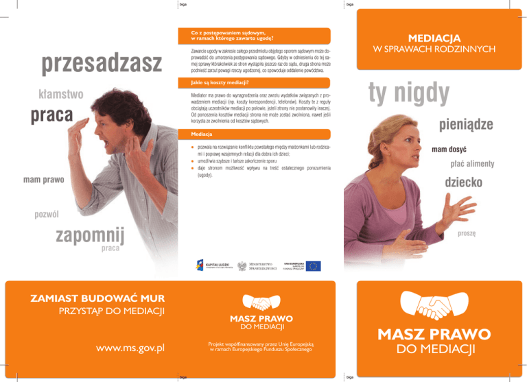 Co z postępowaniem sądowym, w ramach którego zawarto ugodę? przesadzasz kłamstwo Zawarcie ugody w zakresie całego przedmiotu objętego sporem sądowym może doprowadzić do umorzenia postępowania sądowego. Gdyby w odniesieniu do tej samej sprawy którakolwiek ze stron wystąpiła jeszcze raz do sądu, druga strona może podnieść zarzut powagi rzeczy ugodzonej, co spowoduje oddalenie powództwa. Jakie są koszty mediacji? Mediator ma prawo do wynagrodzenia oraz zwrotu wydatków związanych z prowadzeniem mediacji (np. koszty korespondencji, telefonów). Koszty te z reguły obciążają uczestników mediacji po połowie, jeżeli strony nie postanowiły inaczej. Od ponoszenia kosztów mediacji strona nie może zostać zwolniona, nawet jeśli korzysta ze zwolnienia od kosztów sądowych. praca Mediacja pozwala na rozwiązanie konfliktu powstałego między małżonkami lub rodzicami i poprawę wzajemnych relacji dla dobra ich dzieci; umożliwia szybsze i tańsze zakończenie sporu daje stronom możliwość wpływu na treść ostatecznego porozumienia (ugody). mam prawo Mediacja w sprawach rodzinnych ty nigdy pieniądze mam dosyć płać alimenty dziecko pozwól zapomnij praca proszę zamiast budować mur przystąp do mediacji masz prawo do mediacji www.ms.gov.pl Projekt współfinansowany przez Unię Europejską w ramach Europejskiego Funduszu Społecznego masz prawo do mediacji Mediacja jest jednym z dobrowolnych sposobów rozwiązywania konfliktów. Daje możliwość nawiązania dialogu pomiędzy równymi stronami, wyjaśnienia spornych kwestii i nawiązania porozumienia. Mediacja prowadzona jest przez bezstronne- go i neutralnego mediatora. Postępowanie mediacyjne jest poufne. Dzięki zawarciu ugody można przyspieszyć postępowanie oraz zaoszczędzić koszty. Przystąpienie do mediacji nie wiąże się z obowiązkiem zawarcia ugody. MEDIACJA jest sposobem na rozwiązanie sporu powstałego pomiędzy małżonkami/rodzicami małoletnich dzieci m.in. w sprawie o rozwód, podział majątku, alimenty, kontakty. Jej celem jest umożliwienie spotkania się stron, które wspólnie mogą ustalić sporne kwestie oraz wypracować w tym zakresie porozumienie. Przebieg mediacji jest poufny. Mediator: jest zobowiązany zachować w tajemnicy wszystko, o czym dowiedział się podczas prowadzenia mediacji; nie może być przesłuchany jako świadek w sprawie, w której prowadził mediację, chyba że strony zwolnią go z obowiązku zachowania tajemnicy; może – będąc upoważniony przez sąd na wniosek stron – zapoznać się z aktami sprawy. MEDIACJA w sprawach rodzinnych (o rozwód i separację) zmierza do pogodzenia małżonków i zakończenia konfliktu. Jeśli to się nie powiedzie, w postępowaniu mediacyjnym można ustalić istotne kwestie, o których w innym wypadku orzeknie sąd, takie jak: alimenty, podział majątku wspólnego, określenie sposobu korzystania z mieszkania, przyznanie mieszkania jednemu z małżonków, wykonywanie władzy rodzicielskiej nad małoletnimi dziećmi i kontakty z małoletnimi dziećmi (sąd uwzględni takie porozumienie jeżeli będzie ono zgodne z dobrem dzieci), alimenty na rzecz dzieci lub małżonka, sporządzenie planu wychowawczego (porozumienie rodzicielskie – art. 58 § 1 krio). MEDIACJA w sprawach rodzinnych może toczyć się zarówno przed wystąpieniem do sądu, jak i w trakcie postępowania sądowego. Mediacja może być prowadzona na podstawie: umowy o mediację zawartej między stronami lub wniosku stron, postanowienia sądu. MEDIACJA nie jest dopuszczalna w sprawach o: ustalenie ojcostwa, ustalenie macierzyństwa, zaprzeczenie ojcostwa, przysposobienie, unieważnienie małżeństwa, pozbawienie lub zawieszenie wykonywania władzy rodzicielskiej. Jeżeli strony (lub jedna z nich) jest uzależniona od alkoholu, narkotyków, jest chora psychicznie oraz w przypadku występowania przemocy w rodzinie skierowanie do mediacji nie jest możliwe, ponieważ naruszałoby zasadę równości stron. jak przebiega mediacja? MEDIACJA jest dobrowolna! Bez zgody stron mediacja nie będzie się toczyć. W postępowaniu mediacyjnym w sprawach o rozwód, separację, podział majątku uczestniczą małżonkowie, natomiast w sprawach dotyczących dzieci (np. o alimenty, ustalenie kontaktów, w sprawach z zakresu władzy rodzicielskiej) uczestniczą rodzice małoletnich. Kim jest mediator? MEDIATOR jest osobą kompetentną i fachową, posiadającą dużą wiedzę z zakresu psychologii, pedagogiki, socjologii lub prawa oraz umiejętności praktyczne dotyczące prowadzenia mediacji w sprawach rodzinnych. Mediator pomaga skonfliktowanym członkom rodziny określić sporne zagadnienia oraz wypracować im kompromisowe rozwiązanie. Strony mogą wybrać mediatora lub zostanie on wskazany przez sąd. Mediator jest osobą bezstronną, dbającą o równe traktowanie stron. Powinien czuwać nad tym, aby strony traktowały się nawzajem z szacunkiem i godnością. W przypadku wątpliwości co do bezstronności można zwrócić się o jego zmianę. Listy stałych mediatorów prowadzą organizacje społeczne i zawodowe, mogą one także tworzyć ośrodki mediacyjne. Listy zawierające nazwiska mediatorów znajdują się w każdym sądzie. w jaki sposób zostanie podzielone mieszkanie, czy majątek wspólny, który z małżonków, w jakiej wysokości i jak często będzie płacił alimenty. W ugodzie nie można ustalić który z małżonków ponosi winę za rozkład pożycia. O tym może orzekać jedynie sąd. Należy pamiętać, że treść ugody muszą zaakceptować obie strony! Uczestnicy mediacji nie są zobowiązani do zawarcia ugody. Jeżeli nie dojdzie do zawarcia ugody, strony nie są związane propozycjami wzajemnych ustępstw, czy oświadczeniami składanymi przed mediatorem i nie mogą się na nie powoływać w trakcie dalszego postępowania. Niezawarcie ugody nie powoduje dla stron uczestniczących w mediacji żadnych negatywnych konsekwencji. Strony mogą nadal