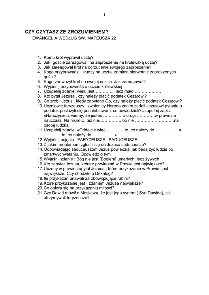 1 CZY CZYTASZ ZE ZROZUMIENIEM? EWANGELIA WEDŁUG ŚW. MATEUSZA 22 Komu król wyprawił ucztę? Jak goscie zareagowali na zaproszenie na królewską ucztę? Jak zareagował król na odrzucenie swojego zaproszenia? Kogo przyprowadzili słudzy na uczta. zamiast pierwotnie zaproszonych gości? 5. Kogo zauważył król na swojej uczcie. Jak zareagował? 6. Wyjaśnij przypowieść o uczcie królewskiej 7. Uzupełnij zdanie: wielu jest………….., lecz mało ………………. 8. Kto pytał Jezusa , czy należy płacić podatek Cezarowi? 9. Co zrobił Jezus , kiedy zapytano Go, czy należy płacić podatek Cezarowi? 10. Uczniowie faryzeuszy i zwolenicy Heroda zanim zadali Jezusowi pytanie o podatek posłużyli się pochlebstwem, co powiedzieli?Uzupełnij zapis: «Nauczycielu, wiemy, że jesteś ……………i drogi ………….w prawdzie nauczasz. Na nikim Ci też nie……………, bo nie ……………………….na osobę ludzką. 11. Uzupełnij zdanie: «Oddajcie więc ………….to, co należy do……………., a ………….to, co należy do …………….». 12. Wyjaśnij pojęcia : FARYZEUSZE i SADUCEUSZE 13. Z jakim problemem zgłosili się do Jezusa saduceusze? 14. Odpowiadając saduceuszom Jezus powiedział jak będą żyć ludzie po zmartwychwstaniu. Opowiedz o tym 15. Wyjaśnij zdanie : Bóg nie jest [Bogiem] umarłych, lecz żywych 16. Kto zapytał Jezusa, które z przykazań w Prawie jest największe? 17. Uczony w prawie zapytał Jezusa , które przykazanie w Prawie jest największe. Czy chodziło o Dekalog? 18. Ile przykazań unawali za obowiązujące rabini? 19. Które przykazanie jest , zdaniem Jezusa największe? 20. Co opiera się na przykazaniu miłości? 21. Czy Dawid mówił o Mesjaszu, że jest jego synem ( Syn Dawida), jak utrzymywali faryzeusze? 1. 2. 3. 4. 2 KLUCZ DO ODPOWIEDZI Mt 22 1. 2. Swojemu synowi Król posłał swoje sługi, żeby zaproszonych zwołali na ucztę, lecz ci nie chcieli przyjść. Posłał jeszcze raz inne sługi z poleceniem: "Powiedzcie zaproszonym: Oto przygotowałem moją ucztę: woły i tuczne zwierzęta pobite i wszystko jest gotowe. Przyjdźcie na ucztę!" Lecz oni zlekceważyli to i poszli: jeden na swoje pole, drugi do swego kupiectwa, a inni pochwycili jego sługi i znieważywszy [ich], pozabijali. 3. Król uniósł się gniewem. Posłał swe wojska i kazał wytracić owych zabójców, a miasto ich spalić. Wtedy rzekł swoim sługom: "Uczta wprawdzie jest gotowa, lecz zaproszeni nie byli jej godni. Idźcie więc na rozstajne drogi i zaproście na ucztę wszystkich, których spotkacie". 4. Słudzy ci wyszli na drogi i sprowadzili wszystkich, których napotkali: złych i dobrych. I sala zapełniła się biesiadnikami 5. Wszedł król, żeby się przypatrzyć biesiadnikom, i zauważył tam człowieka, nie ubranego w strój weselny. Rzekł do niego: "Przyjacielu, jakże tu wszedłeś nie mając stroju weselnego?" Lecz on oniemiał. Wtedy król rzekł sługom: "Zwiążcie mu ręce i nogi i wyrzućcie go na zewnątrz, w ciemności! Tam będzie płacz i zgrzytanie zębów". 6. Przypowieść alegoryzująca. Królem jest Bóg. Uczta weselna to szczęśliwość mesjańska Jezusa; zaproszeni to Żydzi; spalenie miasta to zburzenie Jerozolimy; słudzy to Prorocy i Apostołowie; ludzie zebrani z ulicy to grzesznicy i poganie. 7. Wielu jest powołanych, lecz mało wybranych 8. Uczniowie faryzeuszy ze zwolemmikami Heroda 9. Jezus powiedział : Pokażcie Mi monetę podatkową!» Przynieśli Mu denara. On ich zapytał: «Czyj jest ten obraz i napis?» Odpowiedzieli: «Cezara». Wówczas rzekł do nich: «Oddajcie więc Cezarowi to, co należy do Cezara, a Bogu to, co należy do Boga». 10. «Nauczycielu, wiemy, że jesteś prawdomówny i drogi Bożej w prawdzie nauczasz. Na nikim Ci też nie zależy, bo nie oglądasz się na osobę ludzką. 11. «Oddajcie więc Cezarowi to, co należy do Cezara, a Bogu to, co należy do Boga». 12. FARYZEUSZE - stronnictwo żydowskie, w jakie przeobraził się ruch religijny sięgający początkami czasów machabejskich. Jego członkowie wyróżniali się od reszty narodu przesadnym pojmowanim czystości rytualnej, drobiazgowym przestrzeganiem nie tylko przepisów Prawa, ale i nakazów ustnej „ tradycji starszych” oraz ścisłym święceniem szabatu. Byli oni w ostrej opzycji do Jezusa Chrystusa. SADUCEUSZE –żydowskie stronnictwo religijno – polityczne.W polityce cechowała ich ugodowość względem Rzymu. W poglądach religijnych byli nieprawowierni: odrzucali nieśmiertelność dudzy,, zmartwychwstanie ciał, Opatrzność, istnienie świata duchów. Rekrutowali się głównie ze środowiska kapłańskiego. Mimo stałej opozycji względem faryzeuszów byli jednak całkowicie z nimi zgodni w sprawie Jezusa Chrystusa i powstającego Kościoła 13. Saduceusze zapytali: «Nauczycielu, Mojżesz powiedział: Jeśli kto umrze bezdzietnie, niech jego brat weźmie wdowę po nim i wzbudzi potomstwo swemu bratu. Otóż było u nas siedmiu braci. Pierwszy ożenił się i umarł, a ponieważ nie miał potomstwa, zostawił swoją żonę bratu. Tak samo drugi i 3 trzeci - aż do siódmego. W końcu po wszystkich umarła ta kobieta. Do którego więc z tych siedmiu należeć będzie przy zmartwychwstaniu? Bo wszyscy ją mieli [za żonę]». 14. Przy zmartwychwstaniu bowiem nie będą się ani żenić, ani za mąż wychodzić, lecz będą jak aniołowie Boży w niebie. 15. To znaczy, że dla Boga umarli żyją 16. Uczony w Prawie. 17. Nie. Przykazania - w liczbie 613 - rabini dzielili zgodnie na wielkie i małe. Różne były jednak ich opinie, gdy chodziło o kolejność hierarchiczną nakazów w ramach wielkich przykazań. 18. 613 19. «Będziesz miłował Pana Boga swego całym swoim sercem, całą swoją duszą i całym swoim umysłem. To jest największe i pierwsze przykazanie. 20. Na tych dwóch przykazaniach opiera się całe Prawo i Prorocy». 21. Nie. Jezus mówi,że Dawid nazywał Mesjasza Panem : Rz