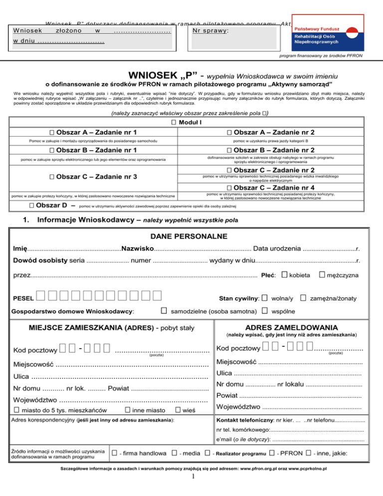 W n i o s e k „P ” d o t y c zą c y d o f i n a n s o w a n i a w r a ma c h p i l o t a żo w e g o p r o g r a mu „A k t y w n y s a mo r zą d ” W nios ek złożono w ........................ Nr s prawy: w dniu ...... ...................... program finansowany ze środków PFRON WNIOSEK „P” - wypełnia Wnioskodawca w swoim imieniu o dofinansowanie ze środków PFRON w ramach pilotażowego programu „Aktywny samorząd” We wniosku należy wypełnić wszystkie pola i rubryki, ewentualnie wpisać ”nie dotyczy”. W przypadku, gdy w formularzu wniosku przewidziano zbyt mało miejsca, należy w odpowiedniej rubryce wpisać „W załączeniu – załącznik nr ..”, czytelnie i jednoznacznie przypisując numery załączników do rubryk formularza, których dotyczą. Załączniki powinny zostać sporządzone w układzie przewidzianym dla odpowiednich rubryk formularza. (należy zaznaczyć właściwy obszar przez zakreślenie pola ) Moduł I Obszar A – Zadanie nr 1 Obszar A – Zadanie nr 2 Pomoc w zakupie i montażu oprzyrządowania do posiadanego samochodu pomoc w uzyskaniu prawa jazdy kategorii B Obszar B – Zadanie nr 1 Obszar B – Zadanie nr 2 pomoc w zakupie sprzętu elektronicznego lub jego elementów oraz oprogramowania dofinansowanie szkoleń w zakresie obsługi nabytego w ramach programu sprzętu elektronicznego i oprogramowania Obszar C – Zadanie nr 2 Obszar C – Zadanie nr 3 pomoc w utrzymaniu sprawności technicznej posiadanego wózka inwalidzkiego o napędzie elektrycznym Obszar C – Zadanie nr 4 pomoc w utrzymaniu sprawności technicznej posiadanej protezy kończyny, w której zastosowano nowoczesne rozwiązania techniczne pomoc w zakupie protezy kończyny, w której zastosowano nowoczesne rozwiązania techniczne Obszar D – 1. pomoc w utrzymaniu aktywności zawodowej poprzez zapewnienie opieki dla osoby zależnej Informacje Wnioskodawcy – należy wypełnić wszystkie pola DANE PERSONALNE Imię.....................................................Nazwisko....................................................... Data urodzenia ..............................r. Dowód osobisty seria ........................ numer ............................... wydany w dniu.........................................................r. przez................................................................................................................................ Płeć: PESEL Gospodarstwo domowe Wnioskodawcy: Stan cywilny: samodzielne (osoba samotna) MIEJSCE ZAMIESZKANIA (ADRES) - pobyt stały kobieta mężczyzna wolna/y zamężna/żonaty wspólne ADRES ZAMELDOWANIA (należy wpisać, gdy jest inny niż adres zamieszkania) Kod pocztowy - ............................................ (poczta) Kod pocztowy - ....................... (poczta) Miejscowość ....................................................................... Miejscowość ........................................................... Ulica .................................................................................. Ulica ........................................................................ Nr domu ........... nr lok. ......... Powiat ....................................... Województwo ..................................................................... miasto do 5 tys. mieszkańców inne miasto wieś Adres korespondencyjny (jeśli jest inny od adresu zamieszkania): Nr domu ................. nr lokalu ................................ Powiat ..................................................................... Województwo ........................................................ Kontakt telefoniczny: nr kier. ... ..nr telefonu................... nr tel. komórkowego:.......................................................... e’mail (o ile dotyczy): ......................................................... Źródło informacji o możliwości uzyskania dofinansowania w ramach programu - firma handlowa - media - Realizator programu - PFRON - inne, jakie: Szczegółowe informacje o zasadach i warunkach pomocy znajdują się pod adresem: www.pfron.org.pl oraz www.pcprkolno.pl 1 W n i o s e k „P ” d o t y c zą c y d o f i n a n s o w a n i a w r a ma c h p i l o t a żo w e g o p r o g r a mu „A k t y w n y s a mo r zą d ” STAN PRAWNY DOT. NIEPEŁNOSPRAWNOŚCI całkowita niezdolność do pracy i do samodzielnej znaczny stopień egzystencji lub całkowita niezdolność do samodzielnej egzystencji całkowita niezdolność do pracy częściowa niezdolność do pracy Orzeczenie dot. niepełnosprawności ważne jest: I grupa inwalidzka umiarkowany stopień lekki stopień II grupa inwalidzka III grupa inwalidzka okresowo do dnia: .............................................. bezterminowo RODZAJ NIEPEŁNOSPRAWNOŚCI NARZĄD RUCHU 05-R, w zakresie: obu kończyn dolnych obu kończyn górnych jednej kończyny dolnej jednej kończyny górnej innym Wnioskodawca nie porusza się przy pomocy wózka inwalidzkiego: Wnioskodawca porusza się samodzielnie przy pomocy wózka inwalidzkiego: Wnioskodawca porusza się niesamodzielnie przy pomocy wózka inwalidzkiego: NARZĄD WZROKU 04-O Lewe oko: Prawe oko: Ostrość wzoru (w korekcji):........................... Ostrość wzoru (w korekcji):........................... osoba niewidoma Zwężenie pola widzenia: ................... stopni Zwężenie pola widzenia: .................... stopni osoba głuchoniewidoma INNE PRZYCZYNY niepełnosprawności wynikające z orzeczenia (proszę zaznaczyć właściwy kod/symbol ): 01-U upośledzenie 03-L zaburzenia głosu, 07-S choroby 09-M choroby 11-I inne umysłowe mowy i choroby słuchu 02-P - OSOBA GŁUCHA 06-E epilepsja choroby psychiczne układu oddechowego i krążenia układu moczowo płciowego 08-T choroby 10-N układu pokarmowego choroby neurologiczne 12-C całościowe zaburzenia rozwojowe AKTYWNOŚĆ ZAWODOWA niezatrudniona/y: od dnia:......................................................................................