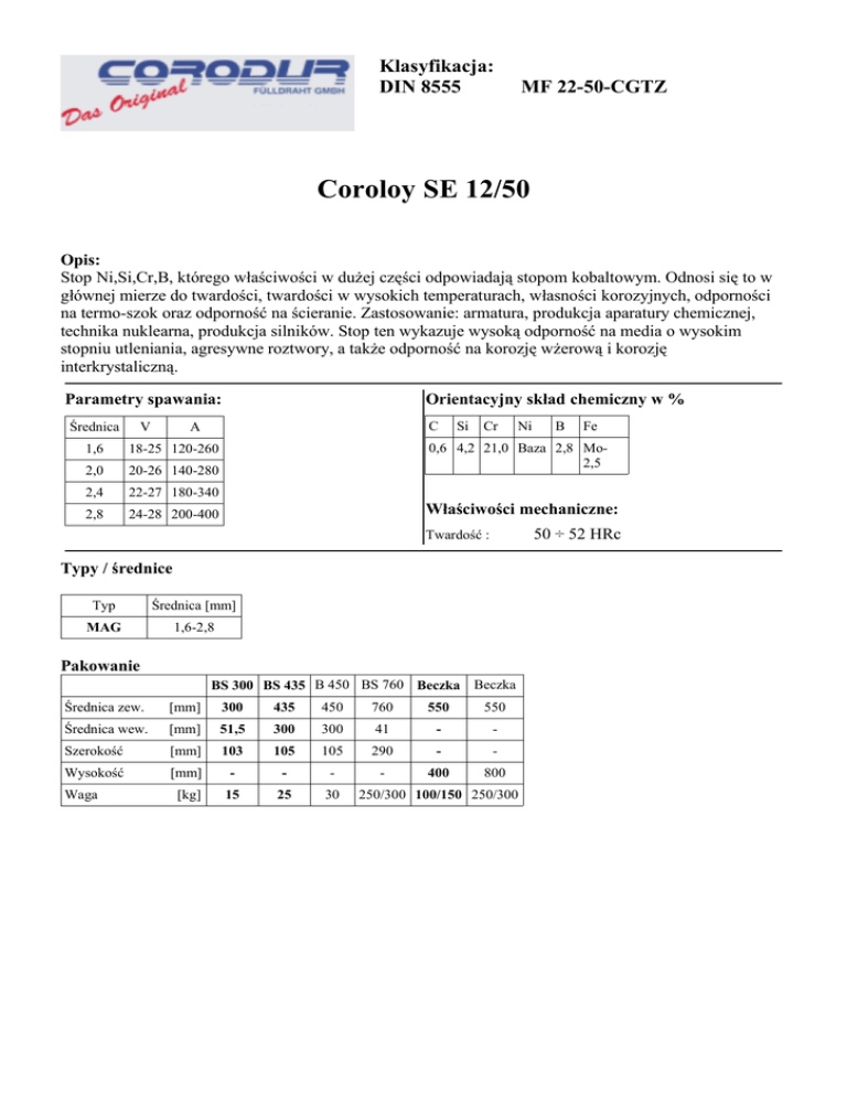 Klasyfikacja: DIN 8555 MF 22-50-CGTZ Coroloy SE 12/50 Opis: Stop Ni,Si,Cr,B, którego właściwości w dużej części odpowiadają stopom kobaltowym. Odnosi się to w głównej mierze do twardości, twardości w wysokich temperaturach, własności korozyjnych, odporności na termo-szok oraz odporność na ścieranie. Zastosowanie: armatura, produkcja aparatury chemicznej, technika nuklearna, produkcja silników. Stop ten wykazuje wysoką odporność na media o wysokim stopniu utleniania, agresywne roztwory, a także odporność na korozję wżerową i korozję interkrystaliczną. Parametry spawania: Średnica V Orientacyjny skład chemiczny w % C A 1,6 18-25 120-260 2,0 20-26 140-280 2,4 22-27 180-340 2,8 24-28 200-400 Si Cr Ni Fe 0,6 4,2 21,0 Baza 2,8 Mo2,5 Właściwości mechaniczne: 50 ÷ 52 HRc Twardość : Typy / średnice Typ Średnica [mm] MAG 1,6-2,8 Pakowanie BS 300 BS 435 B 450 BS 760 Beczka Beczka Średnica zew. [mm] 300 435 450 760 550 550 Średnica wew. [mm] 51,5 300 300 41 - - Szerokość [mm] 103 105 105 290 - - Wysokość [mm] - - - - 400 800 [kg] 15 25 30 Waga B 250/300 100/150 250/300