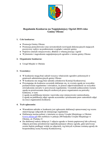 Regulamin Konkursu na Najpiękniejszy Ogród 2010 roku Gminy Olesno 1. Cele konkursu: Promocja Gminy Olesno Promocja pomysłowości oraz nowatorskich rozwiązań dekoracyjnych mających pozytywny wpływ na podniesienie wyglądu i estetyki gminy Poprawa estetyki miejscowości, dbałość o własną posesję i ogród Wyłonienie i nagrodzenie najpiękniejszych ogrodów z terenu gminy Olesno 2. Organizator konkursu: Urząd Miejski w Oleśnie 3. Uczestnicy: W konkursie mogą brać udział wszyscy właściciele ogrodów położonych w granicach administracyjnych gminy Olesno W konkursie nie mogą brać udziału członkowie Komisji Konkursowej Przystępując do konkursu uczestnik deklaruje się, że wyraża zgodę na wszystkie postanowienia regulaminu i oświadcza, że ponosi odpowiedzialność za wszystkie oświadczenia zawarte w powyższym regulaminie. Uczestnik jednocześnie wyraża zgodę na przetwarzanie danych osobowych przez organizatora na potrzeby konkursu, w tym: § zgodę na publikację imienia i nazwiska oraz miejscowości zamieszkania, § zgodę na publikację zdjęć ogrodu uczestnika i przekazanie praw autorskich zdjęć na rzecz organizatora konkursu 4. Tryb zgłaszania: Warunkiem udziału w konkursie jest zgłoszenie deklaracji opracowanej wg wzoru stanowiącego załącznik do niniejszego regulaminu Deklarację można pobrać z internetu ze strony Urzędu Miejskiego w Oleśnie (www.olesno.pl) lub osobiście w pokoju 208 budynku Urzędu Miejskiego w Oleśnie, ul. Pieloka 21 Do deklaracji należy dołączyć 3 zdjęcia ogrodu w formie papierowej lub cyfrowej. Zdjęcia powinny przedstawiać najatrakcyjniejsze obrazy ogrodu, gdyż pierwszej ocenie będzie podlegać widok na zdjęciach, wg których wybrane zostaną ogrody do bezpośredniej oceny Komisji Konkursowej. Zgłoszenia mogą być składane w czasie trwania konkursu przez: - właściciela ogrodu, współwłaściciela (oraz ich pełnoletnie dzieci) - osoby trzecie (ale tylko pod warunkiem uzyskania pisemnego upoważnienia właściciela ogrodu) Zgłoszenia należy składać w Sekretariacie Urzędu Gminy w Oleśnie, w kopercie z napisem „Konkurs na najpiękniejszy ogród 2010 roku gminy Olesno” Materiały nie będą zwracane. 5. Sposób realizacji Konkursu Oceny ogrodów dokona Komisja Konkursowa składająca się z przedstawicieli Urzędu Miejskiego w Oleśnie, artystów plastyków oraz projektant ogrodów Komisja dokona przeglądu i oceny zgłoszeń oraz dokumentacji pod względem zgodności z regulaminem Komisja oceniać będzie wizerunek ogrodu ze zdjęć oraz dokona oględzin zgłoszonych ogrodów w terenie Czas trwania konkursu: 1 kwiecień – 1 czerwiec 2010 roku 6. Kryteria oceny Obecność w ogrodzie różnego rodzaju odmian róż – 0-10 pkt. Prawidłowe rozplanowanie ogrodu – 0-5 pkt Racjonalne urządzenie części wypoczynkowej – 0-5 pkt. Dobór roślin zdobiących ogród przez cały okres wegetacji - 0-5 pkt. Estetyka i stan techniczny ogrodzenia – 0-5 pkt. Kwietniki, skalniaki, murki kwiatowe, pergole – 0-5 pkt. Trawniki i ich utrzymanie – 0-5 pkt. Ogólne wrażenie estetyczne – 0-5 pkt. 7. Nagrody W konkursie przewiduje się przyznanie następujących miejsc i nagród: I miejsce – Bon upominkowy do sklepu ogrodniczego o wartości 1000 zł II miejsce – Bon upominkowy do sklepu ogrodniczego o wartości 800 zł III miejsce – Bon upominkowy do sklepu ogrodniczego o wartości 500 zł Mogą być również przyznane wyróżnienia nagrodzone narzędziami do pielęgnacji ogrodu o wartości do 100 zł Kolejność miejsc będzie wynikała z punktacji Decyzje komisji są ostateczne 8. Promocja wyników konkursu Ogłoszenie, regulamin, przebieg oraz wyniki konkursu popularyzowane będą na stronie internetowej www.olesno.pl oraz w formie pisemnej ogłaszane w sposób zwyczajowo przyjęty Nagrodzeni i wyróżnieni zostaną powiadomieni w formie pisemnej Lista laureatów oraz zdjęcia konkursowe będą zamieszczone na stronie internetowej Urzędu Miejskiego (www.olesno.pl), mogą być również opublikowane w prasie lokalnej 9. Terminy Konkursu 1 kwiecień – rozpoczęcie konkursu: ogłoszenie i przyjmowanie deklaracji 1 czerwca – zakończenie przyjmowania zgłoszeń Po 1 czerwca – dokonanie przez przedstawicieli Komisji przeglądu dokumentacji i wizji lokalnej Święto róży – ogłoszenie wyników i wręczenie nagród Deklaracja przystąpienia do Konkursu „Konkurs na najpiękniejszy ogród 2010 roku gminy Olesno” ………………………………………………………………………………………………. imię i nazwisko ……………………………………………………………………………………………… adres ………………………………………………………………………………………………. nr telefonu (email) Oświadczam, że jestem właścicielem ogrodu położonej w granicach administracyjnych gminy Olesno. Zapoznałem się z postanowieniami regulaminu konkursu oraz deklaruję zgodę na oświadczenia zawarte w powyższym regulaminie. Jednocześnie zgadzam się na przetwarzanie moich danych osobowych przez organizatora, na potrzeby konkursu, w tym: · Zgodę na publikowanie swojego imienia i nazwiska oraz miejscowości zamieszkania, · Zgodę na publikację zdjęć mojego ogrodu i przekazanie praw autorskich zdjęć na rzecz organizatora konkursu ………………………………………………………………… data i czytelny podpis uczestnika