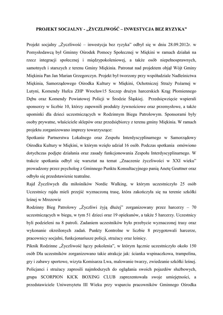 PROJEKT SOCJALNY - „ŻYCZLIWOŚĆ – INWESTYCJA BEZ RYZYKA” Projekt socjalny „Życzliwość – inwestycja bez ryzyka” odbył się w dniu 28.09.2012r. w Pomysłodawcą był Gminny Ośrodek Pomocy Społecznej w Miękini w ramach działań na rzecz integracji społecznej i międzypokoleniowej, a także osób niepełnosprawnych, samotnych i starszych z terenu Gminy Miękinia. Patronat nad projektem objął Wójt Gminy Miękinia Pan Jan Marian Grzegorczyn. Projekt był tworzony przy współudziale Nadleśnictwa Miękinia, Samorządowego Ośrodka Kultury w Miękini, Ochotniczej Straży Pożarnej w Lutyni, Komendy Hufca ZHP Wrocław15 Szczep drużyn harcerskich Krąg Płomiennego Dębu oraz Komendy Powiatowej Policji w Środzie Śląskiej. Przedsięwzięcie wspierali sponsorzy w liczbie 10, którzy zapewnili produkty żywnościowe oraz przemysłowe, a także upominki dla dzieci uczestniczących w Rodzinnym Biegu Patrolowym. Sponsorami były osoby prywatne, właściciele sklepów oraz przedsiębiorcy z terenu gminy Miękinia. W ramach projektu zorganizowano imprezy towarzyszące: Spotkanie Partnerstwa Lokalnego oraz Zespołu Interdyscyplinarnego w Samorządowy Ośrodku Kultury w Miękini, w którym wzięło udział 16 osób. Podczas spotkania omówiono dotychczas podjęte działania oraz zasady funkcjonowania Zespołu Interdyscyplinarnego. W trakcie spotkania odbył się warsztat na temat „Znaczenie życzliwości w XXI wieku” prowadzony przez psycholog z Gminnego Punktu Konsultacyjnego panią Anetę Geuttner oraz odbyło się przedstawienie teatralne. Rajd Życzliwych dla miłośników Nordic Walking, w którym uczestniczyło 25 osób Uczestnicy rajdu mieli przejść wyznaczoną trasę, która zakończyła się na terenie szkółki leśnej w Mrozowie Rodzinny Bieg Patrolowy „Życzliwi żyją dłużej” zorganizowany przez harcerzy – 70 uczestniczących w biegu, w tym 51 dzieci oraz 19 opiekunów, a także 5 harcerzy. Uczestnicy byli podzieleni na 8 patroli. Zadaniem uczestników było przebycie wyznaczonej trasy oraz wykonanie określonych zadań. Punkty Kontrolne w liczbie 8 przygotowali harcerze, pracownicy socjalni, funkcjonariusze policji, strażacy oraz leśnicy. Piknik Rodzinne „Życzliwość łączy pokolenia”, w którym łącznie uczestniczyło około 150 osób Dla uczestników zorganizowano takie atrakcje jak: ścianka wspinaczkowa, trampolina, gry i zabawy sportowe, wizyta Komisarza Lwa, malowanie twarzy, zwiedzanie szkółki leśnej. Policjanci i strażacy zaprosili najmłodszych do oglądania swoich pojazdów służbowych, grupa SCORPION KICK BOXING CLUB zaprezentowała swoje umiejętności, a przedstawiciele Uniwersytetu III Wieku przy wsparciu pracowników Gminnego Ośrodka Pomocy społecznej w Miękini uświetnili ten dzień swoim występem muzyczno-wokalnym. Projekt będzie realizowany również w roku 2013.