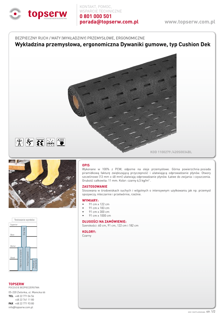 KONTAKT, POMOC, WSPARCIE TECHNICZNE 0 801 000 501 [email protected] www.topserw.com.pl BEZPIECZNY RUCH / MATY (WYKŁADZINY) PRZEMYSŁOWE, ERGONOMICZNE Wykładzina przemysłowa, ergonomiczna Dywaniki gumowe, typ Cushion Dek KOD 1100279 /420S0034BL OPIS Wykonane w 100% z PCW, odporne na oleje przemysłowe. Górna powierzchnia posiada piramidkową fakturę zwiększającą przyczepność i ułatwiającą odprowadzanie płynów. Otwory szczelinowe (13 mm x 48 mm) ułatwiają odprowadzanie płynów. Łatwe do zwijania i czyszczenia. Grubość całkowita: 11 mm. Kolor: czarny 6,5 kg/m2 . ZASTOSOWANIE Stosowana w środowiskach suchych i wilgotnych o intensywnym uzytkowaniu jak np. przemysł spozywczy, mleczarnie i przetwórnie, rzeźnie. WYMIARY: • • • • Testowanie wyrobów Superior 91 cm x 122 cm 91 cm x 183 cm 91 cm x 300 cm 91 cm x 1000 cm DŁUGOŚCI NA ZAMÓWIENIE: Grip Step Szerokości: 60 cm, 91 cm, 122 cm i 182 cm Best KOLORY: Czarny Redukcja zmęczenia Antypoślizgowość Good Odporność na zużycie Better TOPSERW POCZUCIE BEZPIECZEŃSTWA 05-220 Zielonka, ul. Marecka 66 TEL +48 22 771 04 56 +48 22 761 11 80 FAX +48 22 771 93 80 [email protected] KOD 1100279 420S0034BL str. 1/2 KONTAKT, POMOC, WSPARCIE TECHNICZNE 0 801 000 501 [email protected] www.topserw.com.pl BEZPIECZNY RUCH / MATY (WYKŁADZINY) PRZEMYSŁOWE, ERGONOMICZNE Wykładzina przemysłowa, ergonomiczna Dywaniki gumowe, typ Cushion Dek DOSTĘPNE MODELE / DANE TECHNICZNE Kod Numer produktu artykułu 1100279 Typ 420S0034BL Cushion Dek Grubość Wymiary Waga całkowita (cm) (kg) (mm) 11 7,2 91*122 Kolor Kod Numer produktu artykułu 420S0036BL Cushion Dek 11 10,8 91*183 czarny 1100281 420S0310BL Cushion Dek 11 17,8 91*300 czarny 1100282 420R0333BL Cushion Dek 11 59,3 91*1000 czarny 1100283 420C0024BL Cushion Dek 11 3,9 60*m.b czarny 1100284 420C0036BL Cushion Dek 11 5,9 91*m.b czarny 1100285 420C0048BL Cushion Dek 11 7,9 122*m.b czarny 1100286 420C0072BL Cushion Dek 11 11,8 182*m.b czarny 1100287 422S0034BL Dek with 11 7,5 91*122 11 11,2 91*183 1100289 422S0310BL Dek with 1100290 422R0333BL 1100291 422C0024BL 1100292 422C0036BL czarny 1100293 422C0048BL czarny 1100294 422C0072BL Cushion 1100288 Grip Step Cushion 422S0036BL Dek with Grip Step Grubość Wymiary Waga całkowita (cm) (kg) (mm) Kolor Cushion czarny 1100280 Typ Grip Step Cushion Dek with Grip Step Cushion Dek with Grip Step Cushion Dek with Grip Step Cushion Dek with Grip Step Cushion Dek with Grip Step 11 18,6 91*300 czarny 11 62 11 4,1 60*mb czarny 11 6,2 91*mb czarny 11 8,3 122*mb czarny 11 12,4 182*mb czarny 91*1000 czarny OZNACZENIA MATY ZA POMOCĄ PIKTOGRAMÓW Redukcja zmęczenia Wykładziny zmniejszające nacisk na stopę, stymulujące krążenie krwi i pomagające w zmniejszeniu naprężeń w dolnej części pleców, stawach nóg i dużych grupach mięśni. Antypoślizgowe Wykładziny zwiększające przyczepność dzięki specjalnym wzorom i teksturom powierzchni. Izolacja Przed chłodem, ciepłem, wibracjami i hałasem. Odprowadzanie płynów Otwarta budowa wykładziny umożliwia swobodne odprowadzanie płynów, zapewnia dobrą przyczepność w wilgotnym środowisku. Ochrona Mniej uszkodzeń upadających przedmiotów i podłogi. TOPSERW POCZUCIE BEZPIECZEŃSTWA 05-220 Zielonka, ul. Marecka 66 TEL +48 22 771 04 56 +48 22 761 11 80 FAX +48 22 771 93 80 [email protected] KOD 1100279 420S0034BL str. 2/2