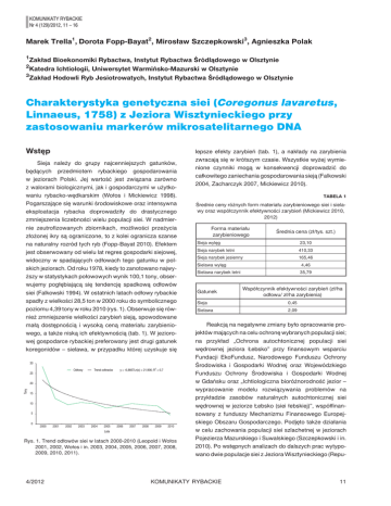 KOMUNIKATY RYBACKIE Nr 4 (129)/2012, 11 – 16 Marek Trella1, Dorota Fopp-Bayat2, Miros³aw Szczepkowski3, Agnieszka Polak 1 2 3 Zak³ad Bioekonomiki Rybactwa, Instytut Rybactwa Œródl¹dowego w Olsztynie Katedra Ichtiologii, Uniwersytet Warmiñsko-Mazurski w Olsztynie Zak³ad Hodowli Ryb Jesiotrowatych, Instytut Rybactwa Œródl¹dowego w Olsztynie Charakterystyka genetyczna siei (Coregonus lavaretus, Linnaeus, 1758) z Jeziora Wisztynieckiego przy zastosowaniu markerów mikrosatelitarnego DNA Wstêp Sieja nale¿y do grupy najcenniejszych gatunków, bêd¹cych przedmiotem rybackiego gospodarowania w jeziorach Polski. Jej wartoœæ jest zwi¹zana zarówno z walorami biologicznymi, jak i gospodarczymi w u¿ytko- lepsze efekty zarybieñ (tab. 1), a nak³ady na zarybienia zwracaj¹ siê w krótszym czasie. Wszystkie wy¿ej wymienione czynniki mog¹ w konsekwencji doprowadziæ do ca³kowitego zaniechania gospodarowania siej¹ (Falkowski 2004, Zacharczyk 2007, Mickiewicz 2010). waniu rybacko-wêdkarskim (Wo³os i Mickiewicz 1998). TABELA 1 Pogarszaj¹ce siê warunki œrodowiskowe oraz intensywna Œrednie ceny ró¿nych form materia³u zarybieniowego siei i sielawy oraz wspó³czynnik efektywnoœci zarybieñ (Mickiewicz 2010, 2012) eksploatacja rybacka doprowadzi³y do drastycznego zmniejszenia liczebnoœci wielu populacji siei. W nadmiernie zeutrofizowanych zbiornikach, mo¿liwoœci prze¿ycia Forma materia³u zarybieniowego z³o¿onej ikry s¹ ograniczone, to z kolei ogranicza szanse Œrednia cena (z³/tys. szt.) na naturalny rozród tych ryb (Fopp-Bayat 2010). Efektem Sieja wylêg 23,10 jest obserwowany od wielu lat regres gospodarki siejowej, Sieja narybek letni 410,33 Sieja narybek jesienny 165,46 widoczny w spadaj¹cych od³owach tego gatunku w polskich jeziorach. Od roku 1978, kiedy to zanotowano najwy¿szy w statystykach po³owowych wynik 100,1 tony, obser- Sielawa wylêg 4,46 Sielawa narybek letni 35,79 wujemy pog³êbiaj¹c¹ siê tendencjê spadkow¹ od³owów Wspó³czynnik efektywnoœci zarybieñ (z³/ha od³owu/ z³/ha zarybienia) siei (Falkowski 1994). W ostatnich latach od³owy rybackie Gatunek spad³y z wielkoœci 28,5 ton w 2000 roku do symbolicznego Sieja 0,45 Sielawa 2,09 poziomu 4,39 tony w roku 2010 (rys. 1). Obserwuje siê równie¿ zmniejszenie wielkoœci zarybieñ siej¹, spowodowane ma³¹ dostêpnoœci¹ i wysok¹ cen¹ materia³u zarybienio- Reakcj¹ na negatywne zmiany by³o opracowanie pro- wego, a tak¿e nisk¹ ich efektywnoœci¹ (tab. 1). W jezioro- jektów maj¹cych na celu ochronê wybranych populacji siei; wej gospodarce rybackiej preferowany jest drugi gatunek na przyk³ad „Ochrona autochtonicznej populacji siei koregonidów – sielawa, w przypadku której uzyskuje siê wêdrownej jeziora £ebsko” przy finansowym wsparciu Fundacji EkoFundusz, Narodowego Funduszu Ochrony 30 Tony Od³owy Trend od³owów Œrodowiska i Gospodarki Wodnej oraz Wojewódzkiego 2 y = -6,8667Ln(x) + 21,906; R = 0,7 25 Funduszu Ochrony Œrodowiska i Gospodarki Wodnej 20 w Gdañsku oraz „Ichtiologiczna bioró¿norodnoœæ jezior – wypracowanie modelu rozwi¹zywania problemów na 15 przyk³adzie zasobów naturalnych autochtonicznej siei 10 wêdrownej w jeziorze £ebsko (siei ³ebskiej)”, wspó³finansowany z funduszy Mechanizmu Finansowego Europejskiego Obszaru Gospodarczego. Podjêto tak¿e dzia³ania 5 0 2000 2001 2002 2003 2004 2005 2006 2007 2008 2009 2010 Lata Rys. 1. Trend od³owów siei w latach 2000-2010 (Leopold i Wo³os 2001, 2002, Wo³os i in. 2003, 2004, 2005, 2006, 2007, 2008, 2009, 2010, 2011). 4/2012 w celu zachowania populacji siei szlachetnej w jeziorach Pojezierza Mazurskiego i Suwalskiego (Szczepkowski i in. 2010). Po wstêpnych analizach do dalszych prac wytypowano dwie populacje siei z Jeziora Wisztynieckiego (Repu- KOMUNIKATY RYBACKIE 11 blika Litewska) i jeziora Ga³aduœ (Pojezierze Suwalskie). mikrosatelitarnego DNA. Badanie te s¹ pierwszymi bada- Populacja siei z Jeziora Wisztynieckiego uwa¿ana jest za niami genetycznymi tej populacji w tym zbiorniku. bardzo cenn¹, z uwagi na to, ¿e jest to populacja nieeksploatowana gospodarczo. Jezioro Wisztynieckie stanowi Materia³ i metody matecznik tego gatunku, w którym od³owy s¹ prowadzone wy³¹cznie w celach reprodukcyjnych. Uzyskany materia³ zarybieniowy by³ wykorzystywany do odtworzenia populacji siei w wybranych jeziorach m.in. w Jeziorze Bia³ym Wigierskim (Osewski 2006). Ostatnio zaczêto prowadziæ prace nad stworzeniem hodowlanych stad tar³owych. Prace te s¹ prowadzone w dwóch oœrodkach: Zak³adzie Hodowli Ryb Jesiotrowatych w Pieczarkach i Oœrodku Zarybieniowym w Gawrych Materia³ badawczy stanowi³y zasuszone fragmenty p³etw, pobrane od 40 osobników siei z Jeziora Wisztynieckiego, umieszczone w papierowych kopertach. W celu wyizolowania DNA wycinano fragment p³etwy o wielkoœci ok. 1 mm2. Ka¿dy taki fragment umieszczano w 500 µl 10% roztworu Chelex 100 (Chelex 100 Resin Bio-Rad). Nastêpnie sporz¹dzano roztwór (100 mg proteinazy K, 10 ml 50% glicerolu, 50ml 1M CaCl2), który dodawano do uprzednio przygotowanego 10% Chelexu 100 w iloœci 10 µl na próbê. Rudzie (Szczepkowski i in. 2010). Corocznie stada tar³owe Próby p³etw w wy¿ej opisanym roztworze, wytrz¹sano 3 s¹ uzupe³niane o materia³ pochodz¹cy od dzikich tarlaków godziny w temp. 55°C z prêdkoœci¹ 200 obr./min, dodat- z Jeziora Wisztynieckiego i jeziora Ga³aduœ. Dla zachowa- kowo worteksowano próby co 15 minut, w celu przyspie- nia kontroli stada, znakuje siê nowo wprowadzane tarlaki szenia lizy komórek. Po trzech godzinach inkubacji próby elektronicznymi znaczkami umo¿liwiaj¹cymi przy¿yciow¹ wirowano w wirówce przez 10 min przy obrotach 2000 rpm. identyfikacjê ryb (Wunderlich i in. 2007). Po wirowaniu pobierano górn¹ fazê próbki, tak aby nie Podczas produkcji materia³u zarybieniowego wprowa- zebraæ dolnych sta³ych warstw z otrzymanego produktu dzanego do wód otwartych, nale¿y zwróciæ 