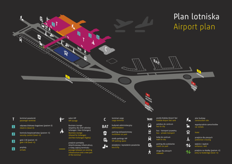 Plan lotniska Airport plan BA T T terminal pasażerski passenger terminal salon VIP VIP Lounge 1 odprawa biletowo-bagażowa (poziom 0) check-in (level 0) 2 kontrola bezpieczeństwa (poziom +1) security control (level +1) Business Lounge (wspólny dla stref odlotów Schengen I Non-Schengen) Business Lounge (shared for Schengen and Non-Schengen flights) 3 gate 1-18 (poziom +1) gate 1-18 (level +1) 4 przyloty arrivals przejście pomiędzy dotychczasową infrastrukturą a nową częścią terminalu passage between an existing infrastructure and a new part of the terminal C BAT terminal cargo cargo terminal budynek administracyjny administration parking wielopoziomowy multilevel car park strefa parkingu VIP VIP parking space wsiadanie / wysiadanie pasażerów kiss & fly postój Kraków Airport Taxi Kraków Airport Taxi rank plac budowy construction site autobus do centrum bus to city wypożyczalnie samochodów car rentals bus - transport prywatny bus - private transport hotel kolej do centrum train to city przejście dla pieszych pedestrian crossing parking dla autokarów coach car park wejście / wyjście entrance / exit droga dla pieszych sidewalk przejście na kładkę (poziom +1) entry to footbridge (level +1)