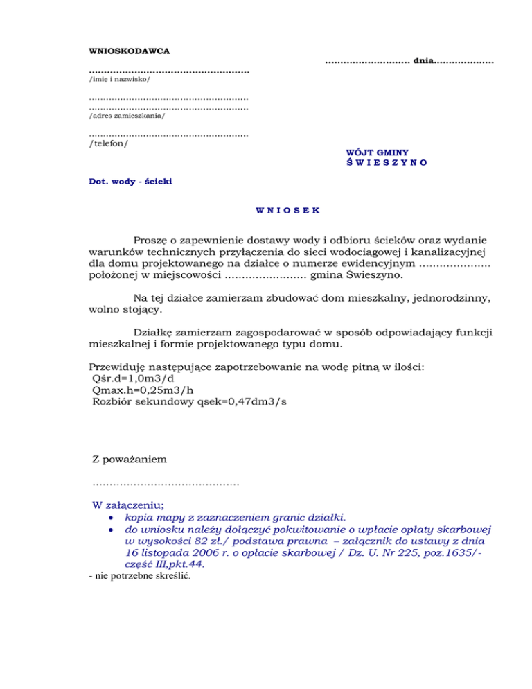 WNIOSKODAWCA ............................ dnia.................... ..................................................... /imię i nazwisko/ ........................................................ ........................................................ /adres zamieszkania/ ........................................................ /telefon/ WÓJT GMINY ŚWIESZYNO Dot. wody - ścieki WNIOSEK Proszę o zapewnienie dostawy wody i odbioru ścieków oraz wydanie warunków technicznych przyłączenia do sieci wodociągowej i kanalizacyjnej dla domu projektowanego na działce o numerze ewidencyjnym ..................... położonej w miejscowości ........................ gmina Świeszyno. Na tej działce zamierzam zbudować dom mieszkalny, jednorodzinny, wolno stojący. Działkę zamierzam zagospodarować w sposób odpowiadający funkcji mieszkalnej i formie projektowanego typu domu. Przewiduję następujące zapotrzebowanie na wodę pitną w ilości: Qśr.d=1,0m3/d Qmax.h=0,25m3/h Rozbiór sekundowy qsek=0,47dm3/s Z poważaniem ........................................... W załączeniu; kopia mapy z zaznaczeniem granic działki. do wniosku należy dołączyć pokwitowanie o wpłacie opłaty skarbowej w wysokości 82 zł./ podstawa prawna – załącznik do ustawy z dnia 16 listopada 2006 r. o opłacie skarbowej / Dz. U. Nr 225, poz.1635/część III,pkt.44. - nie potrzebne skreślić.