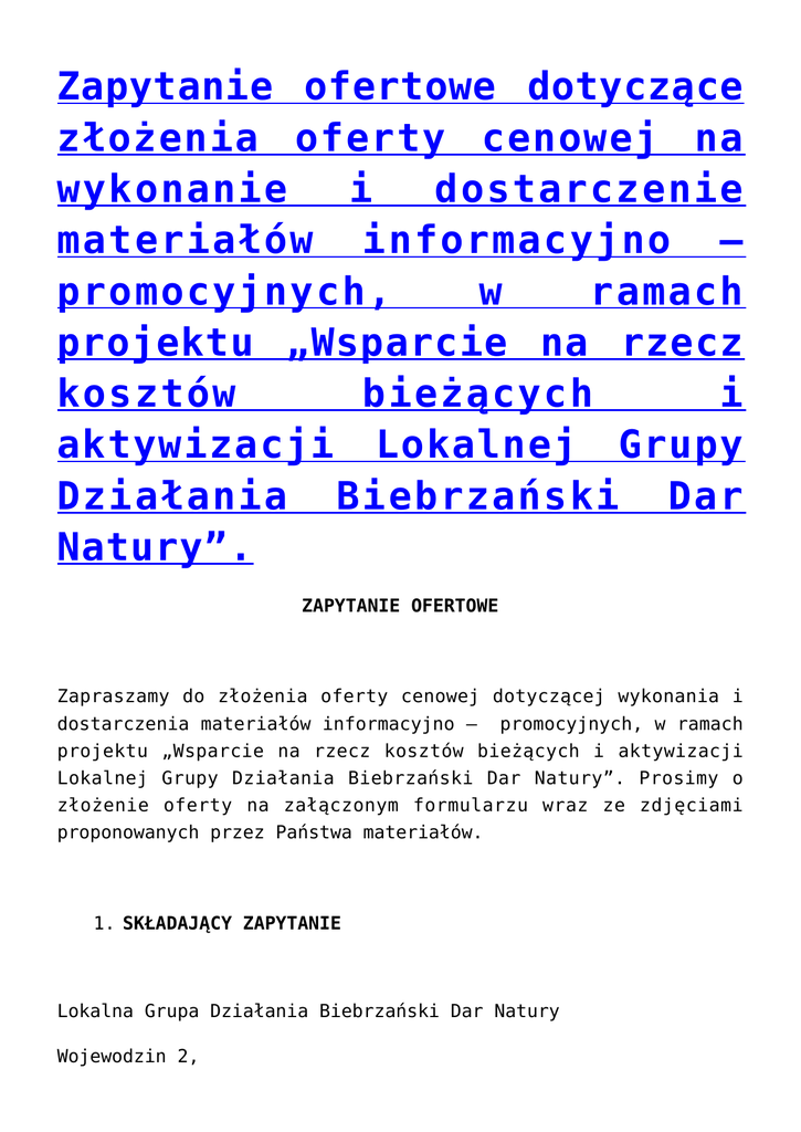 Zapytanie ofertowe dotyczące złożenia oferty cenowej na wykonanie i dostarczenie materiałów informacyjno – promocyjnych, w ramach projektu „Wsparcie na rzecz kosztów bieżących i aktywizacji Lokalnej Grupy Działania Biebrzański Dar Natury”. ZAPYTANIE OFERTOWE Zapraszamy do złożenia oferty cenowej dotyczącej wykonania i dostarczenia materiałów informacyjno – promocyjnych, w ramach projektu „Wsparcie na rzecz kosztów bieżących i aktywizacji Lokalnej Grupy Działania Biebrzański Dar Natury”. Prosimy o złożenie oferty na załączonym formularzu wraz ze zdjęciami proponowanych przez Państwa materiałów. 1. SKŁADAJĄCY ZAPYTANIE Lokalna Grupa Działania Biebrzański Dar Natury Wojewodzin 2, 19-200 Grajewo [email protected] tel./fax. 86 273 80 44 1. OPIS PRZEDMIOTU ZAMÓWIENIA Przedmiotem zamówienia jest: – zakup materiałów wg. poniższej tabeli, – przygotowanie projektu graficznego pracownikami biura LGD do nadruku, w uzgodnieniu z – przygotowanie do druku oraz koszt nadruku przygotowanych projektów na zakupionych materiałach, – dostawa gotowych materiałów do siedziby Lokalnej Grupy Działania Biebrzański Dar Natury. Realizacja zamówienia możliwa jest w dwóch etapach : roll up, teczki, notatniki należy dostarczyć maksymalnie do dnia 11 października 2016 r. natomiast pozostałe przedmioty maksymalnie do 31 października 2016 r. Lp. Nazwa przedmiotu Opis przedmiotu Ilość 1. 2. Roll up Teczka Roll up z rozwijaną i chowaną grafiką w kasecie z pokrowcem przygotowanie projektu grafiki w uzgodnieniu z pracownikami biura 1 szt. LGD, który będzie zawierał cztery loga, dane teleadresowe LGD. Wymiary min. 85/200 cm, z nadrukiem jednostronnym. A4 z gumką, kolorowa, błyszcząca o gramaturze nie mniejszej niż 250 z nadrukiem zewnętrznym oraz wewnętrznym. Przygotowanie projektu graficznego 1000 szt. w uzgodnieniu z pracownikami LGD zawierającego grafikę, logotypy, dane teleadresowe. Format A5, papierowa miękka okładka, 100 kartek. Przygotowanie projektu graficznego w uzgodnieniu z pracownikami LGD zawierającego 3. Notatnik grafikę, logotypy, dane teleadresowe.Prosimy o przedstawienie oferty z zadrukiem logotypów wyłącznie na okładce 500 szt. oraz drugiej oferty dodatkowo z zadrukiem 4 logotypów w stopce na każdej stronie notatnika. 4. Z podwójnym dnem z nadrukiem jednostronnym, jednokolorowym, czterech logotypów, nazwy LGD Torba z rączką. Wykonana z poliestru, o ekologiczna wymiarach nie mniejszych niż:Szerokość 370 mm.Wysokość 420 mmGłębokość 75 mm 300 szt. Prosimy o przedstawienie oferty obejmującej następujące parametry: – format kalendarza z „główką” i polem pod nadruk reklamowy: 33 x 86 cm, – zrywane kartki kalendarium, – kalendarium: układ trójstopniowy (trzy oddzielne kalendaria); w języku polskim nazwy miesięcy i dni tygodnia, podwójne imiona, bieżąca numeracja tygodni; format pojedynczego kalendarium 31 x 15 cm; – pod kalendariami – 5. Kalendarz materiał usztywniający do zadruku, – papier: główka – karton 230 g/m²; plecy – karton 300 g/m²; kalendarium – papier offset – 90 g/m²; pasek regulowany z okienkiem w kolorze czerwonym; – pole pod jednokrotny nadruk reklamowy 33 x 12 cm (przedłużenie pleców pod kalendariami); – główka wypukła – format 20 x 33 cm z zadrukiem wg. przygotowanego projektu; – druk: zdjęcie – jednostronny, barwny + lakier UV; kalendaria – jednostronny, barwny; 150 szt. TERMIN SKŁADANIA OFERTY Ofertę należy złożyć do 30.09.2016 r. do godz. 11.00. 1. SPOSÓB PRZYGOTOWANIA, MIEJSCE ORAZ TERMIN SKŁADANIA OFERTY. 1. Nie dopuszcza sie składania ofert częściowych oraz wariantowych. 2. Ofertę na załączonym formularzu należy złożyć osobiście w siedzibie Lokalnej Grupy Działania Biebrzański Dar Natury, Wojewodzin 2, 19-200 Grajewo, przesłać pocztą na adres Lokalna Grupa Działania Biebrzański Dar Natury, Wojewodzin 2, 19-200 Grajewo (decyduje data i godzina wpływu do biura LGD), lub przesłać e-mailem na adres: [email protected]. Do pobrania: Treść ogłoszenia w wersji pdf Formularz ofertowy