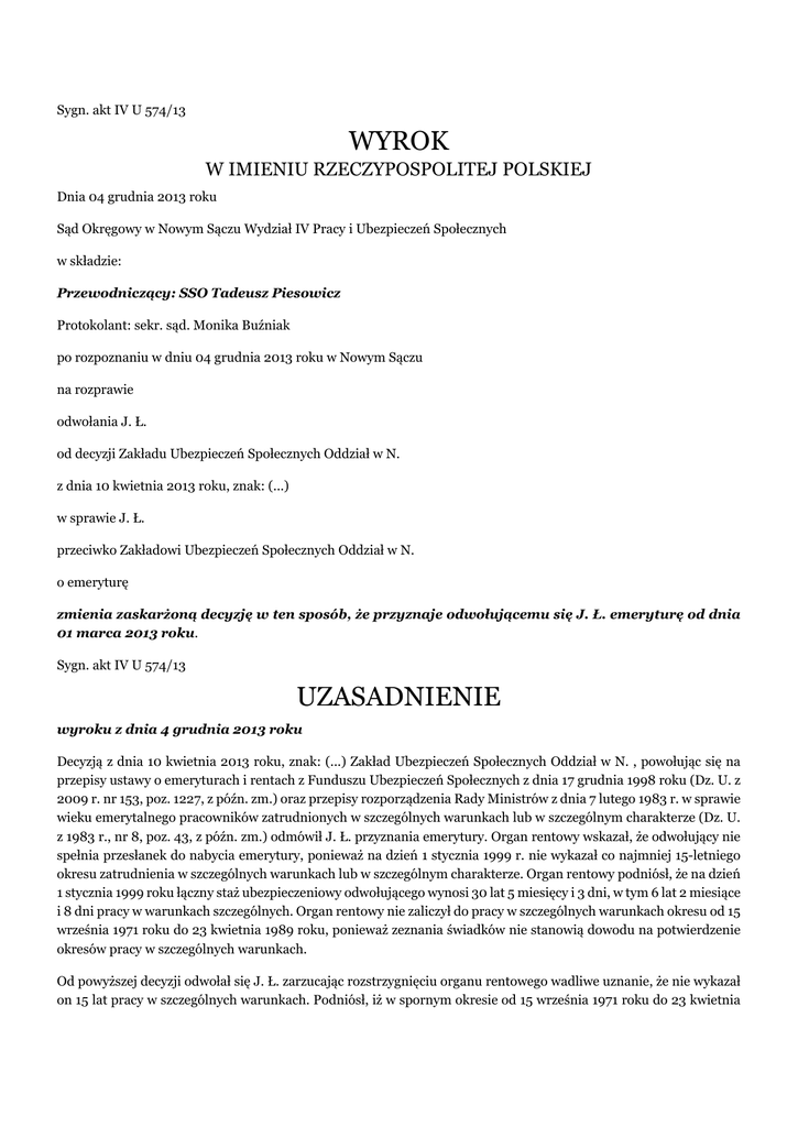 Sygn. akt IV U 574/13 WYROK W IMIENIU RZECZYPOSPOLITEJ POLSKIEJ Dnia 04 grudnia 2013 roku Sąd Okręgowy w Nowym Sączu Wydział IV Pracy i Ubezpieczeń Społecznych w składzie: Przewodniczący: SSO Tadeusz Piesowicz Protokolant: sekr. sąd. Monika Buźniak po rozpoznaniu w dniu 04 grudnia 2013 roku w Nowym Sączu na rozprawie odwołania J. Ł. od decyzji Zakładu Ubezpieczeń Społecznych Oddział w N. z dnia 10 kwietnia 2013 roku, znak: (...) w sprawie J. Ł. przeciwko Zakładowi Ubezpieczeń Społecznych Oddział w N. o emeryturę zmienia zaskarżoną decyzję w ten sposób, że przyznaje odwołującemu się J. Ł. emeryturę od dnia 01 marca 2013 roku. Sygn. akt IV U 574/13 UZASADNIENIE wyroku z dnia 4 grudnia 2013 roku Decyzją z dnia 10 kwietnia 2013 roku, znak: (...) Zakład Ubezpieczeń Społecznych Oddział w N. , powołując się na przepisy ustawy o emeryturach i rentach z Funduszu Ubezpieczeń Społecznych z dnia 17 grudnia 1998 roku (Dz. U. z 2009 r. nr 153, poz. 1227, z późn. zm.) oraz przepisy rozporządzenia Rady Ministrów z dnia 7 lutego 1983 r. w sprawie wieku emerytalnego pracowników zatrudnionych w szczególnych warunkach lub w szczególnym charakterze (Dz. U. z 1983 r., nr 8, poz. 43, z późn. zm.) odmówił J. Ł. przyznania emerytury. Organ rentowy wskazał, że odwołujący nie spełnia przesłanek do nabycia emerytury, ponieważ na dzień 1 stycznia 1999 r. nie wykazał co najmniej 15-letniego okresu zatrudnienia w szczególnych warunkach lub w szczególnym charakterze. Organ rentowy podniósł, że na dzień 1 stycznia 1999 roku łączny staż ubezpieczeniowy odwołującego wynosi 30 lat 5 miesięcy i 3 dni, w tym 6 lat 2 miesiące i 8 dni pracy w warunkach szczególnych. Organ rentowy nie zaliczył do pracy w szczególnych warunkach okresu od 15 września 1971 roku do 23 kwietnia 1989 roku, ponieważ zeznania świadków nie stanowią dowodu na potwierdzenie okresów pracy w szczególnych warunkach. Od powyższej decyzji odwołał się J. Ł. zarzucając rozstrzygnięciu organu rentowego wadliwe uznanie, że nie wykazał on 15 lat pracy w szczególnych warunkach. Podniósł, iż w spornym okresie od 15 września 1971 roku do 23 kwietnia 1989 roku był zatrudniony w firmie (...) na stanowisku mechanika samochodowego. Podkreślił, iż wykonywał pracę mechanika samochodowego tylko w kanale remontowym. W odpowiedzi na odwołanie organ rentowy wniósł o jego oddalenie, podnosząc argumentację, której użył w zaskarżonej decyzji. Zakład Ubezpieczeń Społecznych ponownie wskazał, że odwołujący się udowodnił okres zatrudnienia wynoszący na dzień 1 stycznia 1999 roku co najmniej 25 lat, jednak nie legitymuje się okresem pracy w szczególnych warunkach lub w szczególnym charakterze wynoszącym co najmniej 15 lat. Bezspornym w niniejszej sprawie było, że odwołujący się J. Ł., ur. (...), na dzień 11 stycznia 1999 roku łączny staż ubezpieczeniowy odwołującego wynosi 30 lat 5 miesięcy i 3 dni, w tym 6 lat 2 miesiące i 8 dni pracy w warunkach szczególnych, tj. okres zatrudnienia od 20 lipca 1990 roku do 30 września 1996 roku na stanowisku – mechanika samochodowego w kanałach remontowych. Wniosek o przyznanie emerytury odwołujący złożył dnia 26 marca 2013 roku. Sąd ustalił następujący stan faktyczny: J. Ł. w okresie od 1 września 1967 roku do 17 sierpnia 1970 roku był zatrudniony w Przedsiębiorstwie (...) w N. jako uczeń zawodu a ostanie pół roku pracował w pełnym wymiarze czasu pracy jako kierowca samochodu ciężarowego marki S. o ciężarze całkowitym powyżej 3,5 tony. W okresie od 15 września 1971 roku do 30 września 1996 roku był zatrudniony w pełnym wymiarze czasu pracy w (...) Przedsiębiorstwie (...) w N., przekształconym w Przedsiębiorstwo (...) Oddział (...) N. a następnie w Przedsiębiorstwo Handlowo-Usługowe (...) spółka z o.o. w N. na stanowisku mechanika samochodowego. W przedsiębiorstwie było ok. 100 samochodów ciężarowych m.in. marki S., J., K., Z. i zatrudnionych było ok. 30 mechaników, którzy pracowali na trzy zmiany a od lat 80-tych na dwie zmiany przy naprawie tych pojazdów oraz przyczep. Naprawa wykonywana była w kanałach remontowych początkowo były trzy kanały remontowe a później sześć oraz stacja diagnostyczna. Praca odwołującego polegała m.in. na remontach podwozia, zawieszenia, naprawie sprzęgła oraz skrzyni biegów. Czynności te wykonywane były przez odwołującego w kanałach remontowych. Zdarzały się również sporadycznie naprawy samochodów ciężarowych w terenie ok. 2-3 razy w roku. Odwołujący otrzymywał posiłki regeneracyjne. Razem z odwołującym się byli zatrudnieni m.in. J. C. i A. S. w charakterze mechaników samochodowych. Od maja 1989 roku do czerwca 1990 roku odwołujący pracował na eksporcie na terenie byłego ZSRR w M., również w charakterze mechanika samochodowego. dowód: świadectwa pracy k. 31 i k. 36 akt ZUS, zeznania świadków zawarte w protokole rozprawy: J. C. od 02:55 min do 12:49 min, A. S. od 13:04 min do 23:32 min oraz zeznania odwołującego od 23:42 min do 34:12 min, akta osobowe odwołującego z (...) koperta k. 15 Powyższy stan faktyczny Sąd ustalił na podstawie akt organu rentowego oraz dokumentacji zgromadzonej w aktach sprawy, której autentyczności i mocy dowodowej żadna ze stron nie kwestionowała w toku postępowania. Sąd oparł się również na zeznaniach odwołującego się oraz świadków J. C. oraz A. S., uznając je za wiarygodne, spójne, logiczne, a także zgodne z pozostałym zgromadzonym w sprawie materiałem dowodowym. Świadkowie pracowali wspólnie z odwołującym się i szczegółowo wskazali na czym polegał charakter jego pracy. Brak jest, w ocenie Sądu, jakichkolwiek podstaw do podważenia wiarygodności zeznań w/w świadków. Zeznania przesłuchanych w sprawie świadków oraz zgodne z nimi zeznania odwołującego potwierdziły w sposób jednoznaczny i nie budzący wątpliwości 