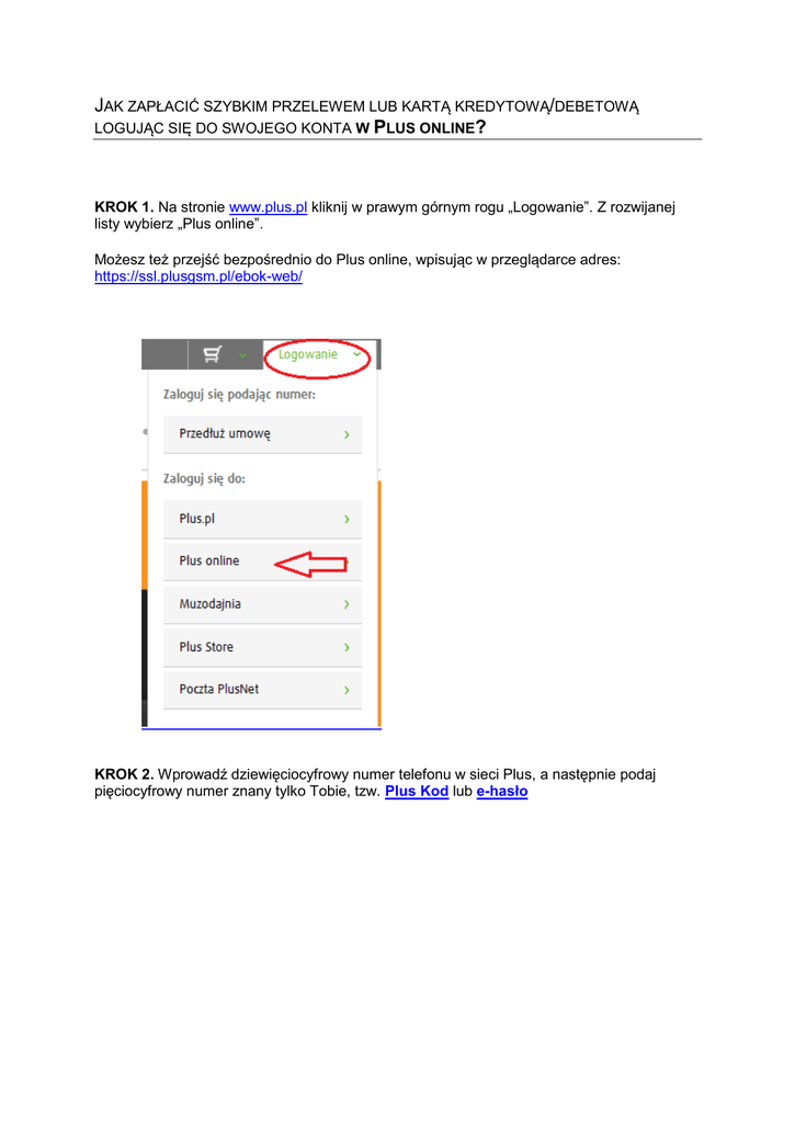 JAK ZAPŁACIĆ SZYBKIM PRZELEWEM LUB KARTĄ KREDYTOWĄ/DEBETOWĄ LOGUJĄC SIĘ DO SWOJEGO KONTA W PLUS ONLINE? KROK 1. Na stronie www.plus.pl kliknij w prawym górnym rogu „Logowanie”. Z rozwijanej listy wybierz „Plus online”. Możesz też przejść bezpośrednio do Plus online, wpisując w przeglądarce adres: https://ssl.plusgsm.pl/ebok-web/ KROK 2. Wprowadź dziewięciocyfrowy numer telefonu w sieci Plus, a następnie podaj pięciocyfrowy numer znany tylko Tobie, tzw. Plus Kod lub e-hasło KROK 3. Zapłaty możesz dokonać na dwa sposoby: na stronie głównej „Plus online start”. Zapłacisz tu całkowite saldo konta (stan konta na dany dzień). w zakładce „Płatności”. Tutaj możesz zdecydować, jaką kwotę chcesz zapłacić, tj. saldo konta (1), dowolną kwotę (2) lub wybraną/-ne fakturę/-ry (3). KROK 4. Po zaznaczeniu dokumentów do zapłaty/wpisaniu wybranej kwoty wybierz zlecenie zapłaty. Pojawi się komunikat: KROK 5. Wybierz „Przejdź do płatności”. Zostaniesz przekierowany na stronę płatności elektronicznych, na której kolejno wypełniasz i zaznaczasz pola: - wprowadź adres e-mail - potwierdź, że zapoznałeś się z regulaminem usługi - dokonaj wyboru sposobu płatności: a. Płatność szybkim przelewem (e-przelewem) zrealizujesz, wybierając ikonę z bankiem, w którym masz konto. b. Płatność kartą kredytową/płatniczą - zaznaczasz „kartę płatniczą” Widok strony płatniczej: Następnie wybierz „Dalej”. KROK 6. Jeżeli wybrałeś jako metodę płatności kartę kredytową w celu dokonania opłaty zostaniesz poproszony o: - imię i nazwisko, - podanie rodzaju karty, - numer karty - daty ważności karty Powyższe informację znajdziesz na awersie karty. Dodatkowo należy podać kod CVV2/CVC2, który znajduje się na rewersie karty płatniczej w miejscu na podpis. Krok 7. Po podaniu podwyższysz danych wybierz „płacę”. Zostaniesz poinformowany o statusie transakcji. KROK 8. Jeżeli wybrałeś płatność z konta bankowego (e-przelew), wówczas w kolejnym kroku system przeniesie Cię na stronę Twojego banku. Po zalogowaniu w systemie bankowym wyświetli się automatycznie wypełniony formularz przelewu. Sprawdź dane a następnie wybierz „Zapłać”. Wybrana płatność zostanie zrealizowana. KROK 9. Jako potwierdzenie dokonania płatności pojawi się poniższy komunikat. Dodatkowo na podany adres e-mail zostanie wysłana informacja o wyniku transakcji. Anulowanie transakcji potwierdzone zostanie komunikatem: