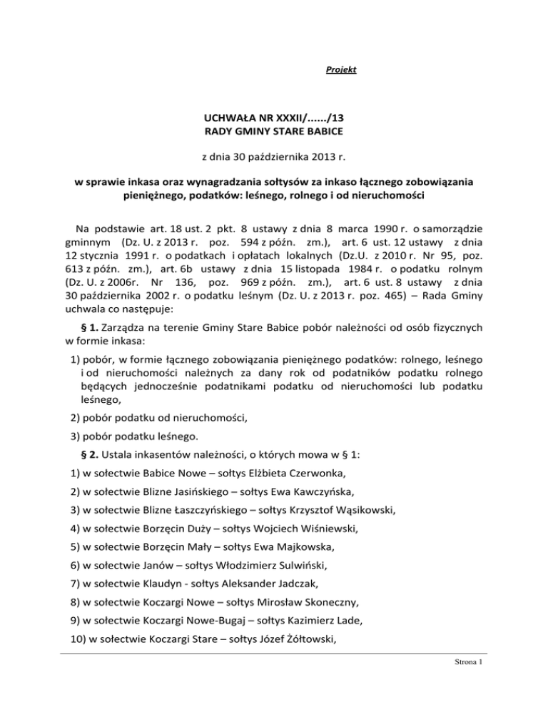 Projekt UCHWAŁA NR XXXII/....../13 RADY GMINY STARE BABICE z dnia 30 października 2013 r. w sprawie inkasa oraz wynagradzania sołtysów za inkaso łącznego zobowiązania pieniężnego, podatków: leśnego, rolnego i od nieruchomości Na podstawie art. 18 ust. 2 pkt. 8 ustawy z dnia 8 marca 1990 r. o samorządzie gminnym (Dz. U. z 2013 r. poz. 594 z późn. zm.), art. 6 ust. 12 ustawy z dnia 12 stycznia 1991 r. o podatkach i opłatach lokalnych (Dz.U. z 2010 r. Nr 95, poz. 613 z późn. zm.), art. 6b ustawy z dnia 15 listopada 1984 r. o podatku rolnym (Dz. U. z 2006r. Nr 136, poz. 969 z późn. zm.), art. 6 ust. 8 ustawy z dnia 30 października 2002 r. o podatku leśnym (Dz. U. z 2013 r. poz. 465) – Rada Gminy uchwala co następuje: § 1. Zarządza na terenie Gminy Stare Babice pobór należności od osób fizycznych w formie inkasa: 1) pobór, w formie łącznego zobowiązania pieniężnego podatków: rolnego, leśnego i od nieruchomości należnych za dany rok od podatników podatku rolnego będących jednocześnie podatnikami podatku od nieruchomości lub podatku leśnego, 2) pobór podatku od nieruchomości, 3) pobór podatku leśnego. § 2. Ustala inkasentów należności, o których mowa w § 1: 1) w sołectwie Babice Nowe – sołtys Elżbieta Czerwonka, 2) w sołectwie Blizne Jasińskiego – sołtys Ewa Kawczyńska, 3) w sołectwie Blizne Łaszczyńskiego – sołtys Krzysztof Wąsikowski, 4) w sołectwie Borzęcin Duży – sołtys Wojciech Wiśniewski, 5) w sołectwie Borzęcin Mały – sołtys Ewa Majkowska, 6) w sołectwie Janów – sołtys Włodzimierz Sulwiński, 7) w sołectwie Klaudyn - sołtys Aleksander Jadczak, 8) w sołectwie Koczargi Nowe – sołtys Mirosław Skoneczny, 9) w sołectwie Koczargi Nowe-Bugaj – sołtys Kazimierz Lade, 10) w sołectwie Koczargi Stare – sołtys Józef Żółtowski, Strona 1 11) w sołectwie Kwirynów – sołtys Dariusz Sobczak, 12) w sołectwie Latchorzew – sołtys Sylwester Klimek, 13) w sołectwie Lipków – sołtys Paweł Karczmarek, 14) w sołectwie Lubiczów – sołtys Jacek Dawidowski, 15) w sołectwie Mariew – sołtys Jan Połeć, 16) w sołectwie Stanisławów – sołtys Maria Wawrzyniecka, 17) w sołectwie Stare Babice – sołtys Lucyna Skrzeczkowska, 18) w sołectwie Topolin – sołtys Dorota Szymańska, 19) w sołectwie Wierzbin – sołtys Dariusz Świątkowski, 20) w sołectwie Wojcieszyn – sołtys Jadwiga Wasiak, 21) w sołectwie Zalesie – sołtys Edward Pytlakowski, 22) w sołectwie Zielonki Parcela – sołtys Stanisław Lesisz, 23) w sołectwie Zielonki Wieś – sołtys Józef Drzewiński. § 3. Ustala wysokość wynagrodzenia za inkaso: 1) w sołectwach: Stare Babice, Blizne Jasińskiego, Klaudyn, Kwirynów, Lubiczów, Borzęcin Duży, Wojcieszyn: w wysokości 11%, 2) w sołectwach: Babice Nowe, Blizne Łaszczyńskiego, Koczargi Stare, Zielonki Wieś, Borzęcin Mały, Topolin, Wierzbin: w wysokości 12%, 3) w sołectwach: Janów, Lipków, Zielonki Parcela, Mariew, Stanisławów, Zalesie: w wysokości 13%, 4) w sołectwach: Koczargi Nowe, Latchorzew: w wysokości 13,50%, 5) w sołectwie Koczargi Nowe-Bugaj: w wysokości 14%. § 4. 1. Inkasenci określeni w § 2 są zobowiązani do rozliczenia zainkasowanych należności podatkowych określonych w § 1 w następujących terminach: 1) 16 marca – I rata, 2) 16 maja – II rata, 3) 16 września – III rata, 4) 16 listopada – IV rata. 2. Jeżeli w/w termin przypada na sobotę lub dzień świąteczny ustawowo wolny od pracy (w niedzielę, święto) termin przesuwa się na następny dzień po dniu lub dniach wolnych od pracy. § 5. Traci moc: 1) Uchwała Nr XIII/107/11 Rady Gminy Stare Babice z dnia 16 grudnia 2011 r. w sprawie inkasa oraz wynagradzania sołtysów za inkaso łącznego zobowiązania Strona 2 pieniężnego, podatków: leśnego, rolnego i od nieruchomości (Dz. Urz. Woj. Maz. Nr 239, poz. 8568 z dnia 30 grudnia 2011 r.); 2) Uchwała Nr XIV/125/12 Rady Gminy Stare Babice z dnia 23 lutego 2012 r. zmieniająca uchwałę w sprawie inkasa oraz wynagrodzenia sołtysów za inkaso łącznego zobowiązania pienieżnego, podatków: leśnego, rolnego i od nieruchomości (Dz. U. Woj. Maz. z 2012 r. poz. 2327). § 6. Wykonanie uchwały powierza Wójtowi Gminy. § 7. Uchwała wchodzi w życie po upływie 14 dni od dnia ogłoszenia w Dzienniku Urzędowym Województwa Mazowieckiego. Strona 3 Uzasadnienie Przepisy ustaw: o podatku rolnym, podatku leśnym oraz o podatkach i opłatach lokalnych upoważniają radę gminy do zarządzenia poboru podatków: rolnego, leśnego i od nieruchomości od osób fizycznych w drodze inkasa, do określania inkasentów tych podatków oraz do określania wysokości wynagrodzenia za inkaso. Rada Gminy Stare Babice w dniu 16 grudnia 2011 r. podjęła uchwałę nr XIII/107/11 w sprawie inkasa oraz wynagradzania sołtysów za inkaso łącznego zobowiązania pieniężnego, podatków: leśnego, rolnego i od nieruchomości. Następnie w dniu 23 lutego 2012 r. dokonała zmiany tej uchwały. Zgodnie z ustawą z dnia 20 lipca 2000 r. o ogłaszaniu aktów normatywnych i niektórych innych aktów prawnych tekst jednolity aktu normatywnego innego niż ustawa ogłasza się nie rzadziej niż raz na 12 miesięcy, jeżeli był on nowelizowany. W związku z tym, że wystąpiły okoliczności do kolejnej nowelizacji uchwały (wybór nowego sołtysa sołectwa Klaudyn) przygotowano nowy projekt uchwały, uchylający dwie poprzednie uchwały wydane w tym zakresie. Strona 1