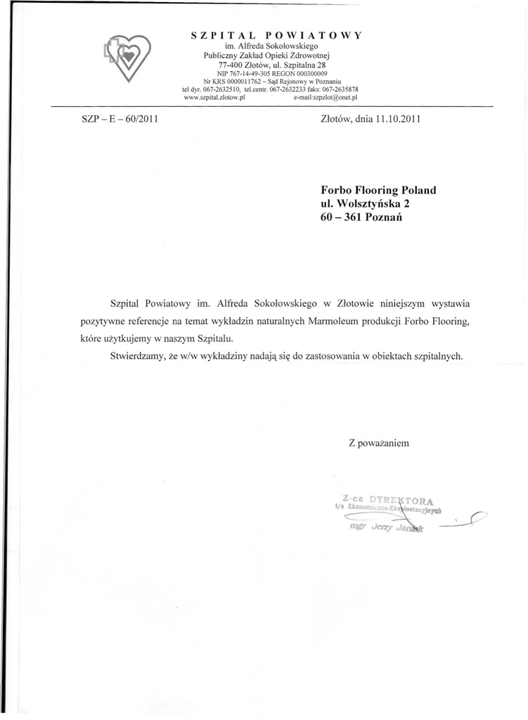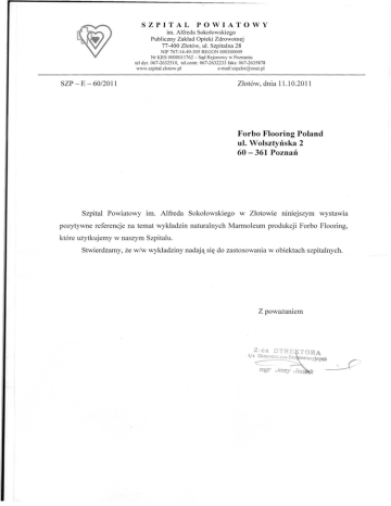 SZPITAL POWIATOWY im. Alfreda Sokolowskiego Publiczny Zaklad Opieki Zdrowotnej 77-400 Zlotów, ul. Szpitalna 28 NIP 767-14-49-305 REGON 000300009 Nr KRS 0000011762 - Sad Rejonowy w Poznaniu tel dyr. 067-2632510, tel. centr. 067-2632233 faks: 067-2635878 www.szpital.zlotow.pl e-mail:[email protected] SZP - E - 60/2011 Zlotów, dnia 11.10.2011 Forbo Flooring Poland ul. Wolsztynska 2 60 - 361 Poznan Szpital Powiatowy im. Alfreda Sokolowskiego w Zlotowie niniejszym wystawia pozytywne referencje na temat wykladzin naturalnych Marmoleum produkcji Forbo Flooring, które uzytkujemy w naszym Szpitalu. Stwierdzamy, ze w/w wykladziny nadaja sie do zastosowania - w obiektach szpitalnych. ~ Z powazaniem Z-ca DYRE i/s TORA ~Ekonomiczno-Eks 'loatacYJnycb ~ ~ mgr Jerzy Jari1Mc r>