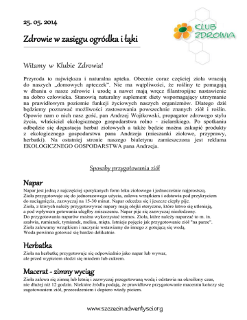 25. 05. 2014 Zdrowie w zasięgu ogródka i łąki Witamy w Klubie Zdrowia! Przyroda to największa i naturalna apteka. Obecnie coraz częściej zioła wracają do naszych „domowych apteczek”. Nie ma wątpliwości, że rośliny te pomagają w dbaniu o nasze zdrowie i urodę a nawet mają wręcz filantropijne nastawienie na dobro człowieka. Stanowią naturalny suplement diety wspomagający utrzymanie na prawidłowym poziomie funkcji życiowych naszych organizmów. Dlatego dziś będziemy poznawać możliwości zastosowania powszechnie znanych ziół i roślin. Opowie nam o nich nasz gość, pan Andrzej Wojtkowski, propagator zdrowego stylu życia, właściciel ekologicznego gospodarstwa rolno - zielarskiego. Po spotkaniu odbędzie się degustacja herbat ziołowych a także będzie można zakupić produkty z ekologicznego gospodarstwa pana Andrzeja (mieszanki ziołowe, przyprawy, herbatki). Na ostatniej stronie naszego biuletynu zamieszczona jest reklama EKOLOGICZNEGO GOSPODARSTWA pana Andrzeja. Sposoby przygotowania ziół Napar Napar jest jedną z najczęściej spotykanych form leku ziołowego i jednocześnie najprostszą. Zioła przygotowuje się do jednorazowego użycia, zalewa wrzątkiem i odstawia pod przykryciem do naciągnięcia, zazwyczaj na 15-30 minut. Napar odcedza się i jeszcze ciepły pije. Zioła, z których należy przygotowywać napary mają olejki eteryczne, które łatwo się utleniają, a pod wpływem gotowania uległby zniszczeniu. Napar pije się zazwyczaj niesłodzony. Do przygotowania naparów można wykorzystać termos. Zioła, które należy naparzać to m. in. szałwia, rumianek, tymianek, melisa, mięta. Istnieje pojęcie jak przygotowanie ziół "na parze". Zioła zalewamy wrzątkiem i naczynie wstawiamy do innego z gotującą się wodą. Woda powinna gotować się bardzo delikatnie. Herbatka Zioła na herbatkę przygotowuje się odpowiednio jako napar lub wywar, ale przed wypiciem słodzi się miodem lub cukrem. Macerat - zimny wyciąg Zioła zalewa się zimną lub letnią i zazwyczaj przegotowaną wodą i odstawia na określony czas, nie dłużej niż 12 godzin. Niektóre źródła podają, że prawidłowe przygotowanie maceratu kończy się zagotowaniem ziół, przecedzeniem i dopiero wtedy piciem. www.szczecin.adwentysci.org Wywar - Odwar Wywary sporządza się z tych części roślin, które są twarde: korzenie, łodygi, kora, owoce. Surowiec musi być dobrze rozdrobniony i zalany zimną lub gorącą wodą, a następnie gotowany przez odpowiedni czas, najczęściej 10-15 do 30 minut. Przed wypiciem wywar należy odcedzić. Przykład: herbatkę ze skrzypu polnego powinno się gotować około 30 minut, aby wydostał się z niego trudno rozpuszczalny krzem. Odwar pije się zazwyczaj niesłodzony. Powidła Przygotowuje się je z owoców, ale na zasadzie smażenia na bardzo gęsty sos lub też suszone zioła miksuje się w młynku do kawy na bardzo drobny proszek, uciera go z powidłami (wersją ze smażeniem) dżemem lub miodem. Syrop Do wywaru dodaje się cukier i gotuje, do odparowania i zagęszczenia syropu. np. korzeń prawoślazu lub też owoce zasypuje się cukrem na noc (w stosunku 1:1), rano smaży we własnym soku. Po smażeniu owoce odcedza się - stanowią konfiturę, a sok przelewa do butelek. Czym różni się konfitura od dżemu? Konfitura to całe owoce we własnym soku/syropie, natomiast dżem to po prostu papka, mniej lub bardziej jednolita. Owoce w dżemie są w kawałkach, zmiażdżone, porozpadane, nie da się wyróżnić całości owocu. Aby zapobiec rozpadaniu się składników podczas gotowania nie należy mieszać konfitur łyżką, a ostrożnie wstrząsać garnkiem. Właściwości niektórych ziół Babka lancetowata - liść Znana już w starożytności jako lek przeciwkaszlowy i gojący rany. Zastosowanie ma wyciąg z liści – stany zapalne górnych dróg oddechowych i przewodu pokarmowego; składnik mieszanek przeciwkaszlowych; napary z liści – wrzody, czyraki, oparzenia, do tamowania krwawień (okłady). Bylica piołun – ziele Wyciąg z liści i ziela poprawia trawienie, wzmaga apetyt. Napar z ziela – przeciw glistom i owsikom (lewatywa). Ze względu na zawartość tujonu, o działaniu toksycznym na ośrodkowy układ nerwowy, przetwory z piołunu można stosować tylko przez krótki okres i nie przekraczać zalecanych dawek. Nie wolno podawać kobietom w ciąży i karmiącym. Dziurawiec zwyczajny Wyciągi z ziela mają zastosowanie w chorobach przewodu pokarmowego i wątroby. Składnik wielu gotowych mieszanek; w łagodnych lekach antydepresyjnych ; wyciąg olejowy stosowany jako środek gojący rany. www.szczecin.adwentysci.org Róża dzika – owoc Działa lekko przeciwskurczowo i moczopędnie; uzupełnia niedobory witaminy C, powoduje wzrost odporności, w przeziębieniach; w nadmiernej kruchości ścian naczyń krwionośnych - uszczelnia je i uelastycznia; w kamicy nerkowej i żółciowej; poprawia przyswajalność żelaza. Krwawnik pospolity Olejek ma właściwości przeciwzapalne, odkażające i przeciwgrzybicze. Wyciąg z ziela i kwiatów – jako leki przeciwzapalne, odkażające, rozkurczające, żółciopędne. Wyciąg z liści i sok ze świeżego ziela – jako lek przeciwkrwotoczny. Składnik mieszanek w chorobach układu pokarmowego. Ceniona roślina pastwisk Lebiodka pospolita – oregano Wyciągi z ziela i olejek działają wiruso - bakterio – grzybobójczo, odkażająco , wykrztuśnie, żółciopędnie. Poprawia trawienie; do płukania jamy ustnej i gardła; do inhalacji w stanach zapalnych górnych dróg oddechowych; Melisa lekarska Pomocna w bezsenności, depresji, nerwicy. Przydatna w trakcie stosowania diety odchudzającej ze względu na jej moczopędne i wiatropędne działanie, przez co oczyszcza organizm z zalegających w nim toksyn. Jest rośliną miododajną, w dawnym piśmiennictwie występuje pod nazwą pszczelnik, rojownik. Mięta pieprzowa Działa rozkurczająco, żółciotwórczo, popr