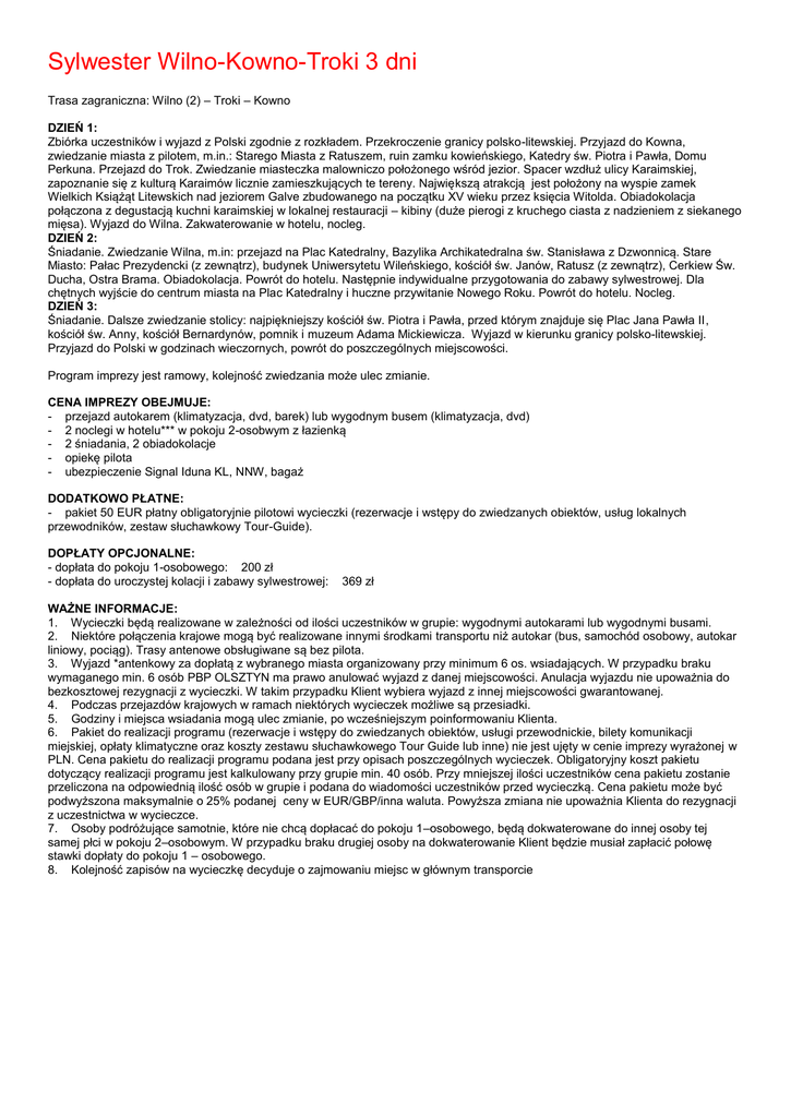 Sylwester Wilno-Kowno-Troki 3 dni Trasa zagraniczna: Wilno (2) – Troki – Kowno DZIEŃ 1: Zbiórka uczestników i wyjazd z Polski zgodnie z rozkładem. Przekroczenie granicy polsko-litewskiej. Przyjazd do Kowna, zwiedzanie miasta z pilotem, m.in.: Starego Miasta z Ratuszem, ruin zamku kowieńskiego, Katedry św. Piotra i Pawła, Domu Perkuna. Przejazd do Trok. Zwiedzanie miasteczka malowniczo położonego wśród jezior. Spacer wzdłuż ulicy Karaimskiej, zapoznanie się z kulturą Karaimów licznie zamieszkujących te tereny. Największą atrakcją jest położony na wyspie zamek Wielkich Książąt Litewskich nad jeziorem Galve zbudowanego na początku XV wieku przez księcia Witolda. Obiadokolacja połączona z degustacją kuchni karaimskiej w lokalnej restauracji – kibiny (duże pierogi z kruchego ciasta z nadzieniem z siekanego mięsa). Wyjazd do Wilna. Zakwaterowanie w hotelu, nocleg. DZIEŃ 2: Śniadanie. Zwiedzanie Wilna, m.in: przejazd na Plac Katedralny, Bazylika Archikatedralna św. Stanisława z Dzwonnicą. Stare Miasto: Pałac Prezydencki (z zewnątrz), budynek Uniwersytetu Wileńskiego, kościół św. Janów, Ratusz (z zewnątrz), Cerkiew Św. Ducha, Ostra Brama. Obiadokolacja. Powrót do hotelu. Następnie indywidualne przygotowania do zabawy sylwestrowej. Dla chętnych wyjście do centrum miasta na Plac Katedralny i huczne przywitanie Nowego Roku. Powrót do hotelu. Nocleg. DZIEŃ 3: Śniadanie. Dalsze zwiedzanie stolicy: najpiękniejszy kościół św. Piotra i Pawła, przed którym znajduje się Plac Jana Pawła II, kościół św. Anny, kościół Bernardynów, pomnik i muzeum Adama Mickiewicza. Wyjazd w kierunku granicy polsko-litewskiej. Przyjazd do Polski w godzinach wieczornych, powrót do poszczególnych miejscowości. Program imprezy jest ramowy, kolejność zwiedzania może ulec zmianie. CENA IMPREZY OBEJMUJE: - przejazd autokarem (klimatyzacja, dvd, barek) lub wygodnym busem (klimatyzacja, dvd) - 2 noclegi w hotelu*** w pokoju 2-osobwym z łazienką - 2 śniadania, 2 obiadokolacje - opiekę pilota - ubezpieczenie Signal Iduna KL, NNW, bagaż DODATKOWO PŁATNE: - pakiet 50 EUR płatny obligatoryjnie pilotowi wycieczki (rezerwacje i wstępy do zwiedzanych obiektów, usług lokalnych przewodników, zestaw słuchawkowy Tour-Guide). DOPŁATY OPCJONALNE: - dopłata do pokoju 1-osobowego: 200 zł - dopłata do uroczystej kolacji i zabawy sylwestrowej: 369 zł WAŻNE INFORMACJE: 1. Wycieczki będą realizowane w zależności od ilości uczestników w grupie: wygodnymi autokarami lub wygodnymi busami. 2. Niektóre połączenia krajowe mogą być realizowane innymi środkami transportu niż autokar (bus, samochód osobowy, autokar liniowy, pociąg). Trasy antenowe obsługiwane są bez pilota. 3. Wyjazd *antenkowy za dopłatą z wybranego miasta organizowany przy minimum 6 os. wsiadających. W przypadku braku wymaganego min. 6 osób PBP OLSZTYN ma prawo anulować wyjazd z danej miejscowości. Anulacja wyjazdu nie upoważnia do bezkosztowej rezygnacji z wycieczki. W takim przypadku Klient wybiera wyjazd z innej miejscowości gwarantowanej. 4. Podczas przejazdów krajowych w ramach niektórych wycieczek możliwe są przesiadki. 5. Godziny i miejsca wsiadania mogą ulec zmianie, po wcześniejszym poinformowaniu Klienta. 6. Pakiet do realizacji programu (rezerwacje i wstępy do zwiedzanych obiektów, usługi przewodnickie, bilety komunikacji miejskiej, opłaty klimatyczne oraz koszty zestawu słuchawkowego Tour Guide lub inne) nie jest ujęty w cenie imprezy wyrażonej w PLN. Cena pakietu do realizacji programu podana jest przy opisach poszczególnych wycieczek. Obligatoryjny koszt pakietu dotyczący realizacji programu jest kalkulowany przy grupie min. 40 osób. Przy mniejszej ilości uczestników cena pakietu zostanie przeliczona na odpowiednią ilość osób w grupie i podana do wiadomości uczestników przed wycieczką. Cena pakietu może być podwyższona maksymalnie o 25% podanej ceny w EUR/GBP/inna waluta. Powyższa zmiana nie upoważnia Klienta do rezygnacji z uczestnictwa w wycieczce. 7. Osoby podróżujące samotnie, które nie chcą dopłacać do pokoju 1–osobowego, będą dokwaterowane do innej osoby tej samej płci w pokoju 2–osobowym. W przypadku braku drugiej osoby na dokwaterowanie Klient będzie musiał zapłacić połowę stawki dopłaty do pokoju 1 – osobowego. 8. Kolejność zapisów na wycieczkę decyduje o zajmowaniu miejsc w głównym transporcie