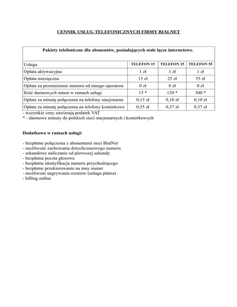 CENNIK USŁUG TELEFONICZNYCH FIRMY BIALNET Pakiety telefoniczne dla abonentów, posiadających stałe łącze internetowe. TELEFON 15 TELEFON 25 TELEFON 55 Opłata aktywacyjna 1 zł 1 zł 1 zł Opłata miesięczna 15 zł 25 zł 55 zł Opłata za przeniesienie numeru od innego operatora 0 zł 0 zł 0 zł Ilość darmowych minut w ramach usługi 15 * 120 * 300 * 0,15 zł 0,10 zł 0,10 zł 0,37 zł 0,37 zł Usługa Opłata za minutę połączenia na telefony stacjonarne Opłata za minutę połączenia na telefony komórkowe 0,55 zł - wszystkie ceny zawierają podatek VAT * - darmowe minuty do polskich sieci stacjonarnych i komórkowych Dodatkowo w ramach usługi: - bezpłatne połączenia z abonentami sieci BialNet - możliwość zachowania dotychczasowego numeru - sekundowe naliczanie od pierwszej sekundy - bezpłatna poczta głosowa - bezpłatna identyfikacja numeru przychodzącego - bezpłatne przekierowanie na inny numer - możliwość nagrywania rozmów (usługa płatna) - billing online