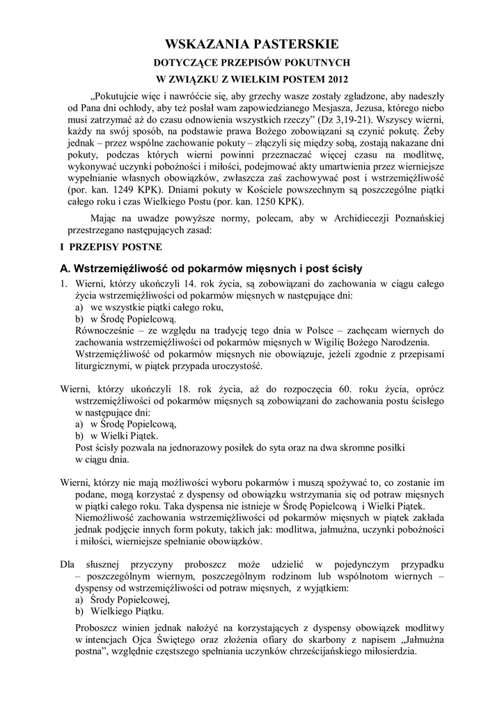 WSKAZANIA PASTERSKIE DOTYCZĄCE PRZEPISÓW POKUTNYCH W ZWIĄZKU Z WIELKIM POSTEM 2012 „Pokutujcie więc i nawróćcie się, aby grzechy wasze zostały zgładzone, aby nadeszły od Pana dni ochłody, aby też posłał wam zapowiedzianego Mesjasza, Jezusa, którego niebo musi zatrzymać aż do czasu odnowienia wszystkich rzeczy” (Dz 3,19-21). Wszyscy wierni, każdy na swój sposób, na podstawie prawa Bożego zobowiązani są czynić pokutę. Żeby jednak – przez wspólne zachowanie pokuty – złączyli się między sobą, zostają nakazane dni pokuty, podczas których wierni powinni przeznaczać więcej czasu na modlitwę, wykonywać uczynki pobożności i miłości, podejmować akty umartwienia przez wierniejsze wypełnianie własnych obowiązków, zwłaszcza zaś zachowywać post i wstrzemięźliwość (por. kan. 1249 KPK). Dniami pokuty w Kościele powszechnym są poszczególne piątki całego roku i czas Wielkiego Postu (por. kan. 1250 KPK). Mając na uwadze powyższe normy, polecam, aby w Archidiecezji Poznańskiej przestrzegano następujących zasad: I PRZEPISY POSTNE A. Wstrzemięźliwość od pokarmów mięsnych i post ścisły 1. Wierni, którzy ukończyli 14. rok życia, są zobowiązani do zachowania w ciągu całego życia wstrzemięźliwości od pokarmów mięsnych w następujące dni: a) we wszystkie piątki całego roku, b) w Środę Popielcową. Równocześnie – ze względu na tradycję tego dnia w Polsce – zachęcam wiernych do zachowania wstrzemięźliwości od pokarmów mięsnych w Wigilię Bożego Narodzenia. Wstrzemięźliwość od pokarmów mięsnych nie obowiązuje, jeżeli zgodnie z przepisami liturgicznymi, w piątek przypada uroczystość. Wierni, którzy ukończyli 18. rok życia, aż do rozpoczęcia 60. roku życia, oprócz wstrzemięźliwości od pokarmów mięsnych są zobowiązani do zachowania postu ścisłego w następujące dni: a) w Środę Popielcową, b) w Wielki Piątek. Post ścisły pozwala na jednorazowy posiłek do syta oraz na dwa skromne posiłki w ciągu dnia. Wierni, którzy nie mają możliwości wyboru pokarmów i muszą spożywać to, co zostanie im podane, mogą korzystać z dyspensy od obowiązku wstrzymania się od potraw mięsnych w piątki całego roku. Taka dyspensa nie istnieje w Środę Popielcową i Wielki Piątek. Niemożliwość zachowania wstrzemięźliwości od pokarmów mięsnych w piątek zakłada jednak podjęcie innych form pokuty, takich jak: modlitwa, jałmużna, uczynki pobożności i miłości, wierniejsze spełnianie obowiązków. Dla słusznej przyczyny proboszcz może udzielić w pojedynczym przypadku – poszczególnym wiernym, poszczególnym rodzinom lub wspólnotom wiernych – dyspensy od wstrzemięźliwości od potraw mięsnych, z wyjątkiem: a) Środy Popielcowej, b) Wielkiego Piątku. Proboszcz winien jednak nałożyć na korzystających z dyspensy obowiązek modlitwy w intencjach Ojca Świętego oraz złożenia ofiary do skarbony z napisem „Jałmużna postna”, względnie częstszego spełniania uczynków chrześcijańskiego miłosierdzia. Z dyspensy udzielonej przez proboszcza mogą korzystać wierni Archidiecezji Poznańskiej wszędzie, gdziekolwiek się znajdują, a także wszyscy inni wierni przebywający na terenie Archidiecezji Poznańskiej. Tej samej władzy dyspensowania udzielam wszystkim kapłanom podczas pełnienia posługi duszpasterskiej na cmentarzach komunalnych Poznań-Junikowo i PoznańMiłostowo, a także spowiednikom przy sprawowaniu Sakramentu Pokuty. Prośbę o dyspensę – w formie pisemnej – można także kierować do Kurii Metropolitalnej. Przed posiłkiem należy poinformować zainteresowanych o udzielonej dyspensie. B. Powstrzymywanie się od zabaw 1. Powstrzymywanie się od zabaw tanecznych obowiązuje w piątki całego roku i w czasie Wielkiego Postu. 2. W piątki poza okresem Wielkiego Postu w pojedynczym przypadku i dla słusznej przyczyny proboszcz może udzielić – poszczególnym wiernym, poszczególnym rodzinom lub wspólnotom wiernych – dyspensy od powstrzymania się od zabawy, nakładając na korzystających z dyspensy obowiązek modlitwy w intencjach Ojca Świętego oraz złożenia ofiary do skarbony z napisem „Jałmużna postna”, względnie częstszego spełniania uczynków chrześcijańskiego miłosierdzia. 3. Słuszną przyczyną dla uzyskania dyspensy od powstrzymania się od zabawy w dany piątek poza okresem Wielkiego Postu może być np. konieczność urządzenia w tym dniu wesela ze względów lokalowych, studniówki lub innej szkolnej zabawy ze względów organizacyjnych, czy też zabawy dla pracowników danego zakładu ze względów lokalowych czy organizacyjnych. Z dyspensy udzielonej przez proboszcza mogą korzystać wierni Archidiecezji Poznańskiej wszędzie, gdziekolwiek się znajdują oraz wszyscy inni wierni przebywający na terenie Archidiecezji Poznańskiej. Tej samej władzy udzielam spowiednikom przy sprawowaniu Sakramentu Pokuty. Prośbę o dyspensę można także kierować w formie pisemnej do Kurii Metropolitalnej. Przed zabawą należy poinformować zainteresowanych o udzielonej dyspensie. II. CZAS KOMUNII ŚW. WIELKANOCNEJ W Archidiecezji Poznańskiej czas Komunii św. wielkanocnej zaczyna się od niedzieli przed Środą Popielcową, tj. od 19 lutego 2012 r. i trwać będzie w bieżącym roku do Uroczystości Trójcy Przenajświętszej, tj. do dnia 3 czerwca 2012 r. włącznie. Przyjęcie Komunii św. z okazji Wielkanocy w naznaczonym terminie należy do podstawowych obowiązków katolika. Zachęcam gorąco Archidiecezjan, aby z żywą wiarą i żarliwą skruchą przystąpili do Sakramentu Pojednania i duchowo odnowieni przyjęli Chrystusa w Komunii św. III. DANINA DIECEZJALNA Każdy wierny – w miarę swoich możliwości – zobowiązany jest do troski o potrzeby wspólnoty Kościoła. Jedną z form tej troski jest danina diecezjalna, składana w okresie Wielkiego Postu na potrzeby naszej Archidiecezji. Fundusze z daniny