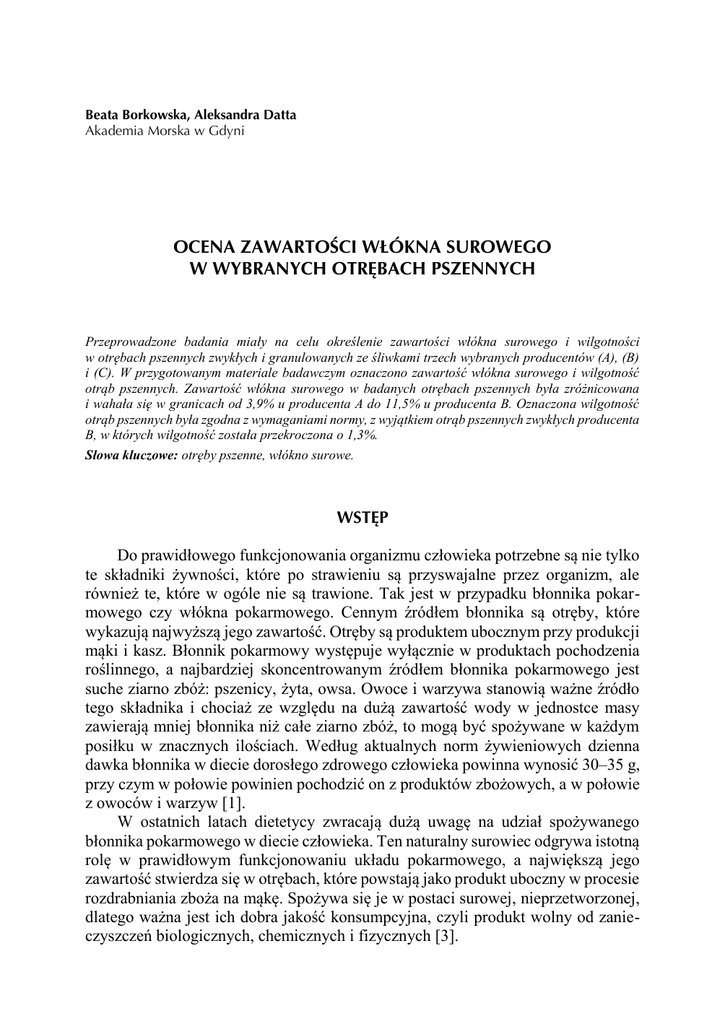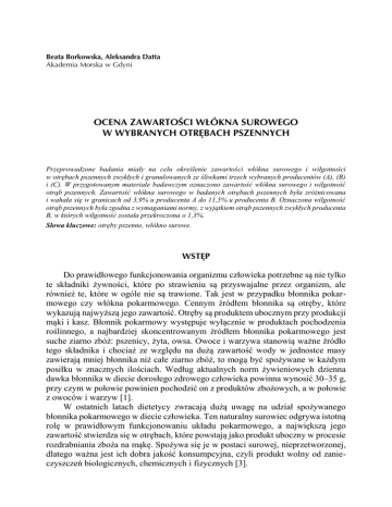 Beata Borkowska, Aleksandra Datta Akademia Morska w Gdyni OCENA ZAWARTOŚCI WŁÓKNA SUROWEGO W WYBRANYCH OTRĘBACH PSZENNYCH Przeprowadzone badania miały na celu określenie zawartości włókna surowego i wilgotności w otrębach pszennych zwykłych i granulowanych ze śliwkami trzech wybranych producentów (A), (B) i (C). W przygotowanym materiale badawczym oznaczono zawartość włókna surowego i wilgotność otrąb pszennych. Zawartość włókna surowego w badanych otrębach pszennych była zróżnicowana i wahała się w granicach od 3,9% u producenta A do 11,5% u producenta B. Oznaczona wilgotność otrąb pszennych była zgodna z wymaganiami normy, z wyjątkiem otrąb pszennych zwykłych producenta B, w których wilgotność została przekroczona o 1,3%. Słowa kluczowe: otręby pszenne, włókno surowe. WSTĘP Do prawidłowego funkcjonowania organizmu człowieka potrzebne są nie tylko te składniki żywności, które po strawieniu są przyswajalne przez organizm, ale również te, które w ogóle nie są trawione. Tak jest w przypadku błonnika pokarmowego czy włókna pokarmowego. Cennym źródłem błonnika są otręby, które wykazują najwyższą jego zawartość. Otręby są produktem ubocznym przy produkcji mąki i kasz. Błonnik pokarmowy występuje wyłącznie w produktach pochodzenia roślinnego, a najbardziej skoncentrowanym źródłem błonnika pokarmowego jest suche ziarno zbóż: pszenicy, żyta, owsa. Owoce i warzywa stanowią ważne źródło tego składnika i chociaż ze względu na dużą zawartość wody w jednostce masy zawierają mniej błonnika niż całe ziarno zbóż, to mogą być spożywane w każdym posiłku w znacznych ilościach. Według aktualnych norm żywieniowych dzienna dawka błonnika w diecie dorosłego zdrowego człowieka powinna wynosić 30–35 g, przy czym w połowie powinien pochodzić on z produktów zbożowych, a w połowie z owoców i warzyw [1]. W ostatnich latach dietetycy zwracają dużą uwagę na udział spożywanego błonnika pokarmowego w diecie człowieka. Ten naturalny surowiec odgrywa istotną rolę w prawidłowym funkcjonowaniu układu pokarmowego, a największą jego zawartość stwierdza się w otrębach, które powstają jako produkt uboczny w procesie rozdrabniania zboża na mąkę. Spożywa się je w postaci surowej, nieprzetworzonej, dlatego ważna jest ich dobra jakość konsumpcyjna, czyli produkt wolny od zanieczyszczeń biologicznych, chemicznych i fizycznych [3]. B. Borkowska, A. Datta, Ocena zawartości włókna surowego w wybranych otrębach pszennych 39 Otręby nie są produktem standardowym, o określonym składzie i granulacji, a stanowią mieszaninę o zróżnicowanym stopniu rozdrobnienia produktów przemiału peryferyjnych części ziarna, z mniejszą lub większą domieszką cząstek bielma. W skład otrąb wchodzi okrywa owocowa i warstwa aleuronowa z okrywą nasienną oraz domieszką rozdrobnionego zarodka i bielma. Otręby stanowią bogate źródło wielu cennych składników odżywczych [2, 4]. Najważniejszym składnikiem otrąb są węglowodany. Ich zawartość wynosi 65–66%. Są to w większości węglowodany nieprzyswajalne, czyli błonnik pokarmowy. Znaczną część błonnika zawartego w otrębach stanowią pentozany i betaglukany. Zarówno błonnik nierozpuszczalny, stanowiący ok. 90% błonnika zawartego w otrębach, jak i rozpuszczalny, wynoszący blisko 10% błonnika są wartościowe z dietetycznego punktu widzenia i potrzebne dla zachowania dobrego zdrowia. Nierozpuszczalny błonnik łatwo chłonie wodę i ułatwia przemieszczanie się treści pokarmowej w jelitach. Zapobiega zaparciom, hemoroidom i nowotworom jelita grubego. Błonnik nierozpuszczalny ma dużą lepkość, zwiększa objętość i lepkość treści przewodu pokarmowego, wypełnia jelita, nadaje uczucie sytości. Otręby korzystnie wpływają na organizm człowieka i mogą stanowić prozdrowotny składnik diety. Rozpuszczalne frakcje błonnika – beta-glukany i pentozany odgrywają istotną rolę w obniżaniu poziomu cholesterolu we krwi, gdyż mogą zmniejszyć wchłanianie cholesterolu do organizmu, a także hamować jego syntezę. Odpowiednie spożycie otrąb jako bogatego źródła błonnika może mieć znaczenie w profilaktyce chorób układu krążenia i miażdżycy. Spożywanie otrąb przez pacjentów z cukrzycą może wpływać na dobrą glikemię poposiłkową poprzez ich niski indeks glikemiczny oraz dużą zawartość błonnika, który powoduje wolne wchłanianie glukozy do krwi. Jest to jednak uzależnione od ilości spożywanych porcji. Otręby wspomagają oczyszczanie organizmu, gdyż mogą wiązać substancje szkodliwe, np. metale ciężkie, które następnie są usuwane z organizmu. Jednak pomimo że spożywanie otrąb może przynosić wiele korzyści dla zdrowia, nie można jadać ich w nieograniczonych ilościach, ich nadmiar bowiem może wywoływać negatywne skutki, np. biegunki, które mogą okazać się bardzo niebezpieczne. Powodują one odwodnienie organizmu, który traci ważne dla swojego funkcjonowania elektrolity. Najlepiej więc zachować umiar w spożywaniu otrąb, a decyzję o ich stosowaniu warto skonsultować z dietetykiem lub lekarzem [2]. Celem pracy była ocena zawartości włókna surowego w otrębach pszennych zwykłych i granulowanych ze śliwkami. W pracy przeprowadzono oznaczenie wilgotności otrąb pszennych oraz oszacowanie zawartości frakcji rozpuszczalnej w otrębach pszennych. Przyjęta hipoteza badawcza zakładała, że rodzaj otrąb oraz producent mają istotny wpływ na zawartość włókna surowego w badanych otrębach. Wyniki badań poddano analizie statystycznej z zastosowaniem testu analizy wariancji podwójnej dla przyjętego poziomu istotności α = 0,05. 40 ZESZYTY NAUKOWE AKADEMII MORSKIEJ W GDYNI, nr 93, czerwiec 2016 1. MATERIAŁ I METODYKA BADAŃ Materiał badawczy stanowiły otręby pszenne zwykłe i otręby pszenne granulowane ze śliwkami trzech wybranych pr