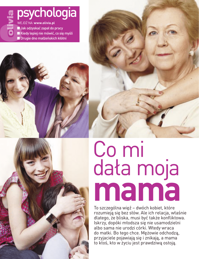 psychologia WEJDŹ NA www.olivia.pl ■ Jak odzyskać zapał do pracy ■ Kiedy lepiej nie mówić, co się myśli ■ Drugie dno małżeńskich kłótni Co mi dała moja mama To szczególna więź – dwóch kobiet, które rozumieją się bez słów. Ale ich relacja, właśnie dlatego, że bliska, musi być także konfliktowa. Iskrzy, dopóki młodsza się nie usamodzielni albo sama nie urodzi córki. Wtedy wraca do matki. Bo tego chce. Mężowie odchodzą, przyjaciele pojawiają się i znikają, a mama to ktoś, kto w życiu jest prawdziwą ostoją. olivia J olivia ▲ est poniedziałkowy wieczór. Dobiega jedenasta. Otwiewychowywała ją sama po rozwodzie, choć Natalia miała kontakt rają się drzwi do mieszkania państwa Piotrowskich na z ojcem. Katarzyna chciała wiedzieć, co się dzieje w życiu jej jedywarszawskim Ursynowie. To przyszła ich córka Doronaczki. Pewnego dnia w towarzystwie koleżanki wybrała się do ta. Ma 39 lat. Wbiega do pokoju brata, w pędzie mówi: klubu, w którym często bywała Natalia. Chciała zorientować się, „Cześć, Paweł!”. Wita się z mamą, Ewą, z tatą. I... natychz jakimi ludźmi bawi się jej dziecko. miast wychodzi. Idzie do siebie – mieszka po drugiej stronie ulicy. – Mama mi wtedy niesamowicie zaimponowała – wspomina Do rodzinnego domu zagląda codziennie, z przyzwyczajenia, żeby Natalia. – Tym, że mi nie zabraniała, nie zakazywała. Przez cały się przywitać, czasem – wypić herbatę, wyciszyć się. Jakby nic się okres tego tak zwanego buntu miałam poczucie, że ona mnie nie nie zmieniło od czasu, gdy była małą dziewczynką. tylko obserwuje, ale też mi ufa. Czułam się, może dzięki temu, Kasia Kamieniarz (37 lat) nie mieszka aż tak blisko swojej mamy, mądrzejsza, doroślejsza od swoich rówieśnic. Elżbiety Gwiszcz. Dlatego rozmawiają przez telefon nawet kilka Katarzyna Doraczyńska uznała, że zakazując dziewczynie nocrazy dziennie. Są najlepszymi koleżankami. Zawsze się kochały, nych imprez, tylko się ośmieszy. Zdawała sobie sprawę z tego, że ale ich relacja dojrzała, gdy Kasia urodziła córkę Malwinę (16 lat). Natalia, jeśli tylko będzie chciała, i tak wyjdzie z domu. Nie da się Gdy dzisiaj Kasia i Malwina toczą boje o nieposprzątany pokój jej w żaden sposób powstrzymać. i brudne naczynia w zlewie, Kasia myśli sobie: „Na szczęście wiem – Gdybym miała powiedzieć, czego mnie mama w życiu nauczyz własnego doświadczenia, że z tego się wyrasta, inaczej byłała, to chyba nie umiałabym nic wymienić, wyrazić tego słowami. bym załamana. A tak, to mam tę pewność, że i u nas kiedyś nastąA jednocześnie mam przekonanie, że dała mi niesamowicie dużo, pi zawieszenie broni. Tak jak u mnie z mamą”. że przekazała mi prawie wszystko, co wiem – tłumaczy Natalia. Natalia Doraczyńska ma 25 lat. Pół roku temu wyprowadziła Psychologowie zajmujący się zagadnieniem rozwoju człowieka się z narzeczonym pod Warszawę. Mamę, Katarzynę, odwiedza uważają, że dziecko, żeby dorosnąć, musi się od rodzica odsepaod czasu do czasu. Bywa, że rować, oderwać. Im silniejdo jej domu zagląda wtedy, gdy sza więź łączy je z matką, Katarzyna jest w pracy. Natalia tym mocniej musi szarpać, rozejrzy się, wygłaszcze koty. by się odłączyć i stać dojrzaI wychodzi. Ale z mamą jest łą, samodzielną istotą. Dzieci w kontakcie. Dzwonią do siebie. bardzo związane z rodzicami – Zdarzało się, że rozmawiamuszą ciągnąć tak mocno, łam z mamą nawet kilka razy że – aby zerwać łączącą nić d zien n ie. Wiadomo, za ra z – oddalają się w sferę zwaną po w yprowadzce odkr y watożsamością negatywną. To łam świat. Było więc mnóstwo taka w ycieczka na ciemhistorii z tym związanych. Jak ną stronę mocy, tam, gdzie na przykład wtedy, kiedy postarodzice nigdy nie chcieli swonowiłam zrobić mojemu narzejego dziecka posłać, przed czonemu Tomkowi jego ukoczym chcieli je uchronić. chane bitki wołowe. Do dzisiaj W alkohol, przygody balanmam plamy z krwi na suficie! sujące na granicy prawa... – śmieje się Natalia. W takich Dziecko podąża w tę ciemchwilach brakuje jej mamy. ność z plecakiem, czyli bagaNatalia i Katarzyna: córka dostała od I jej poczucia humoru... Zawsze żem doświadczeń, wartości, bawiły je te same rzeczy. które dostało w domu rodzinmatki kredyt zaufania. Nawet gdy się ny m. A le pogrą żając się buntowała, nie chciała jej zawieść. Może Nauka odrywania w ten mrok, po kolei wszystdzięki temu dojrzała szybciej niż rówieśnicy? Jak pokazują badania naukowkie rzeczy z plecaka wyrzuców z Kanady, matki i córki ca. Jeśli było ich za mało, nie posługują się zbliżonym językiem, opisują konkretne sytuacje wróci, bo nie trafi w krąg światła, zgubi się. Jeśli było ich dużo, tak samo, jakby się umawiały. To zdradza wspólnotę poglądów. po śladach pójdzie z powrotem. Zbierając wszystko – lub prawie Nie znaleziono takich zależności między parami matka – syn czy wszystko – co wyrzuciło. ojciec – syn lub ojciec – córka. To charakterystyczne tylko dla Bunt Natalii trwał dwa lata. A potem wszystko ucichło. dwóch bliskich sobie kobiet. – Ja też kłóciłam się z moją matką – przyznaje Katarzyna DoraAle prawda jest też taka, że Katarzynie i Natalii Doraczyńskim czyńska. – I też chodziłam na imprezy, więc... ze strachem przynie zawsze było razem wesoło. Obie określają swoją relację jako znałam jej prawo do tego samego. W życiu trzeba nabrać doświadbardzo bliską, ale też bardzo konfliktową. Zaczęło między nimi czenia, nawet jeśli to nie jest łatwe. Ale jak sobą inaczej kierować zgrzytać, gdy Natalia była w liceum. Pierwsza klasa jakoś przeniż bez doświadczeń? A ja chciałam, żeby Natalia potrafiła rozposzła, ale w drugiej nadszedł nastoletni bunt. cząć dorosłe życie. Poszła swoją własną drogą. – Natalia bard