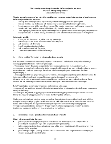 Ulotka dołączona do opakowania: informacja dla pacjenta Twynsta 40 mg/5 mg tabletki telmisartan/amlodypina Należy uważnie zapoznać się z treścią ulotki przed zastosowaniem leku, ponieważ zawiera ona informacje ważne dla pacjenta. Należy zachować tę ulotkę, aby w razie potrzeby móc ją ponownie przeczytać. Należy zwrócić się do lekarza lub farmaceuty w razie jakichkolwiek wątpliwości. Lek ten przepisano ściśle określonej osobie. Nie należy go przekazywać innym. Lek może zaszkodzić innej osobie, nawet jeśli objawy jej choroby są takie same. Jeśli wystąpią jakiekolwiek objawy niepożądane, w tym wszelkie możliwe objawy niepożądane niewymienione w ulotce, należy powiedzieć o tym lekarzowi lub farmaceucie. Patrz punkt 4. Spis treści ulotki: 1. Co to jest lek Twynsta i w jakim celu się go stosuje 2. Informacje ważne przed zastosowaniem leku Twynsta 3. Jak stosować lek Twynsta 4. Możliwe działania niepożądane 5. Jak przechowywać lek Twynsta 6. Zawartość opakowania i inne informacje 1. Co to jest lek Twynsta i w jakim celu się go stosuje Lek Twynsta zawiera dwie substancje czynne – telmisartan i amlodypinę. Obydwie substancje działają poprzez obniżanie ciśnienia tętniczego. - Telmisartan należy do grupy antagonistów receptora angiotensyny II. Angiotensyna II to wytwarzana w organizmie substancja, która powoduje obkurczanie się naczyń krwionośnych, a przez to zwiększenie ciśnienia tętniczego. Działanie telmisartanu polega na hamowaniu działania angiotensyny II. - Amlodypina należy do grupy antagonistów wapnia. Amlodypina zapobiega przenikaniu wapnia do ścian naczyń krwionośnych, co zapobiega zwężaniu się naczyń krwionośnych. Oznacza to, że obie te substancje czynne zapobiegają zwężaniu się naczyń krwionośnych. Tym samym lek ten powoduje rozkurcz naczyń krwionośnych i obniżenie ciśnienia tętniczego. Lek Twynsta jest stosowany w leczeniu nadciśnienia tętniczego - u dorosłych pacjentów, u których ciśnienie tętnicze nie jest wystarczająco kontrolowane za pomocą samej amlodypiny. - u dorosłych pacjentów przyjmujących telmisartan i amlodypinę w oddzielnych tabletkach oraz którzy dla wygody chcą przyjmować te same dawki w jednej tabletce. Nieleczone nadciśnienie tętnicze może prowadzić do uszkodzenia naczyń krwionośnych w kilku narządach, co powoduje ryzyko ciężkich zaburzeń, takich jak zawał serca, niewydolność serca lub nerek, udar lub ślepota. Na ogół nie ma żadnych objawów nadciśnienia tętniczego przed wystąpieniem uszkodzenia narządów. Z tego względu istotne są regularne pomiary ciśnienia tętniczego, które potwierdzą, czy jego wartości są prawidłowe. 2. Informacje ważne przed zastosowaniem leku Twynsta Kiedy nie stosować leku Twynsta • jeśli u pacjenta występuje alergia na telmisartan lub amlodypinę, lub którykolwiek z pozostałych składników tego leku (wymienione w punkcie 6); • jeśli u pacjenta stwierdzono alergię na inne leki z grupy pochodnych dihydropirydyny (typ antagonistów wapnia); • po 3 miesiącu ciąży. (Należy również unikać stosowania leku Twynsta we wcześniejszym okresie ciąży, patrz punkt Ciąża); 127 • • • jeśli u pacjenta występują ciężkie choroby wątroby lub niedrożność przewodów żółciowych (zaburzenia odpływu żółci z wątroby lub pęcherzyka żółciowego); jeśli u pacjenta występuje mała pojemność minutowa serca z powodu ciężkiej choroby serca; jeśli pacjent ma cukrzycę lub zaburzenia czynności nerek i jest leczony lekiem obniżającym ciśnienie krwi zawierającym aliskiren. Jeżeli u pacjenta występuje którakolwiek z powyższych sytuacji, należy porozmawiać z lekarzem przed zastosowaniem leku Twynsta. Ostrzeżenia i środki ostrożności Należy skonsultować się z lekarzem jeśli u pacjenta występuje lub występowało którekolwiek z poniższych zaburzeń lub chorób: • • • • • • • • • • • choroba nerek lub stan po przeszczepieniu nerki; zwężenie naczyń krwionośnych jednej lub obydwu nerek (zwężenie tętnic nerkowych); choroba wątroby; choroba serca; zwiększone stężenie aldosteronu (które prowadzi do zatrzymywania wody i soli w organizmie, łącznie z zaburzeniami stężenia różnych elektrolitów we krwi); niskie ciśnienie tętnicze (niedociśnienie), które występuje zwłaszcza u osób odwodnionych (z nadmierną utratą wody z organizmu) lub z niedoborem soli w wyniku przyjmowania leków moczopędnych, diety z ograniczeniem soli, biegunki lub wymiotów; zwiększenie stężenia potasu we krwi; cukrzyca; zwężenie aorty; ból w klatce piersiowej związany z sercem, również w spoczynku lub po minimalnym wysiłku (niestabilna dusznica bolesna); zawał mięśnia serca w ciągu ostatnich czterech tygodni. Przed rozpoczęciem stosowania leku Twynsta należy omówić to z lekarzem: • jeśli pacjent przyjmuje którykolwiek z poniższych leków stosowanych w leczeniu wysokiego ciśnienia krwi: - inhibitor konwertazy angiotensyny (ACE) (ang. Angiotensin Converting Enzyme Inhibitors, ACEI) (na przykład enalapryl, lizynopryl, ramipryl), w szczególności jeśli pacjent ma zaburzenia czynności nerek związane z cukrzycą. - aliskiren. Lekarz prowadzący może monitorować czynność nerek, ciśnienie krwi oraz stężenie elektrolitów (np. potasu) we krwi w regularnych odstępach czasu. Patrz także „Kiedy nie stosować leku Twynsta”. • jeśli pacjent przyjmuje digoksynę, lek stosowany w leczeniu niewydolności serca. W przypadku planowanej operacji lub znieczulenia należy poinformować lekarza o przyjmowaniu leku Twynsta. Dzieci i młodzież Nie zaleca się stosowania leku Twynsta u dzieci i młodzieży w wieku poniżej 18 lat. Lek Twynsta a inne leki Należy powiedzieć lekarzowi lub farmaceucie o wszystkich lekach przyjmowanych przez pacjenta obecnie lub ostatnio, a także o lekach, które pacjent planuje przyjmować. Lekarz może z